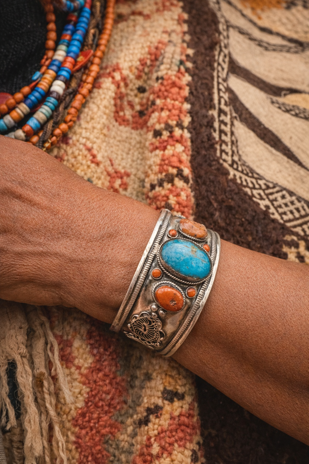 This antique Native American sterling silver turquoise and coral cuff showcases a beautiful etched design, adding a touch of native craftsmanship and elegance to any outfit. The adjustable open fit makes it comfortable and easy to wear. Crafted with expert precision, this timeless and versatile cuff uplifts even a simple t shirt.
