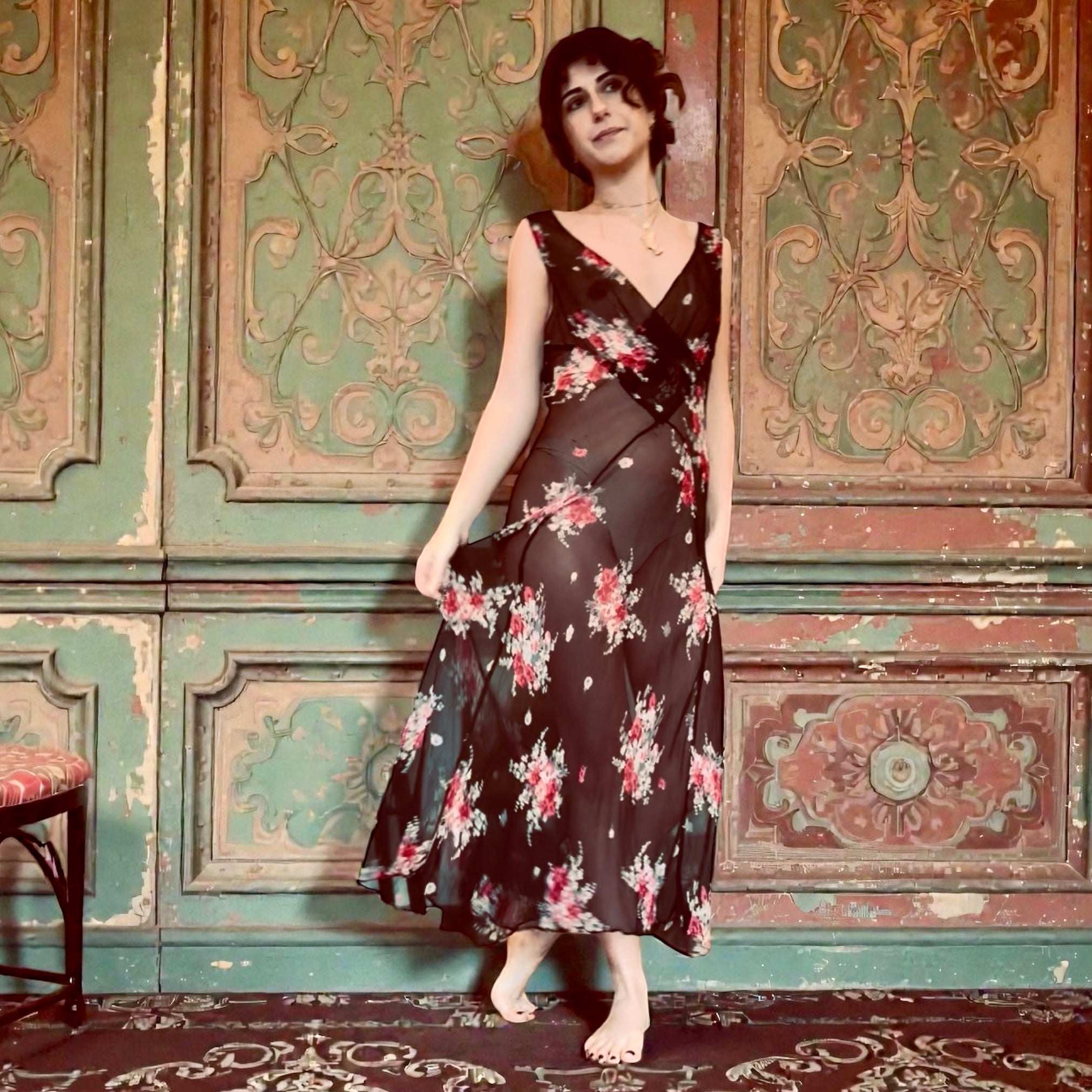 Indulge in timeless elegance with this black floral 90s silk bias cut dress in a silk chiffon. Inspired by the 1930s, this black dress features a front V neckline, a whimsical vintage floral print and a flattering silhouette slightly longer at the back. this dress is a timeless classic for every age.