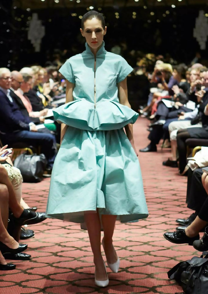 Green Waxed Cotton Mandarin Hunched Jacket S/S 2014: Three dimensional shaped and cut short sleeved mandarin hunched jacket, has fitted bodice on the inside to hold outer shape popped out. The centre front has hook and eye closures for opening and closing. The cut of the collar is mandarin style, and stands high with a slight curve around the edges. The back of the jacket is cut into an oval shaped curve, with seams starting from the top back sides of the shoulders down to hem. This gives the back of the jacket an oval shape. Two front peplums on each side of waist gives the jacket an exaggerated shape. Outer fabric:100% waxed cotton in jade green. Lining:100% waxed cotton in off white. Size 10 LAST ONE