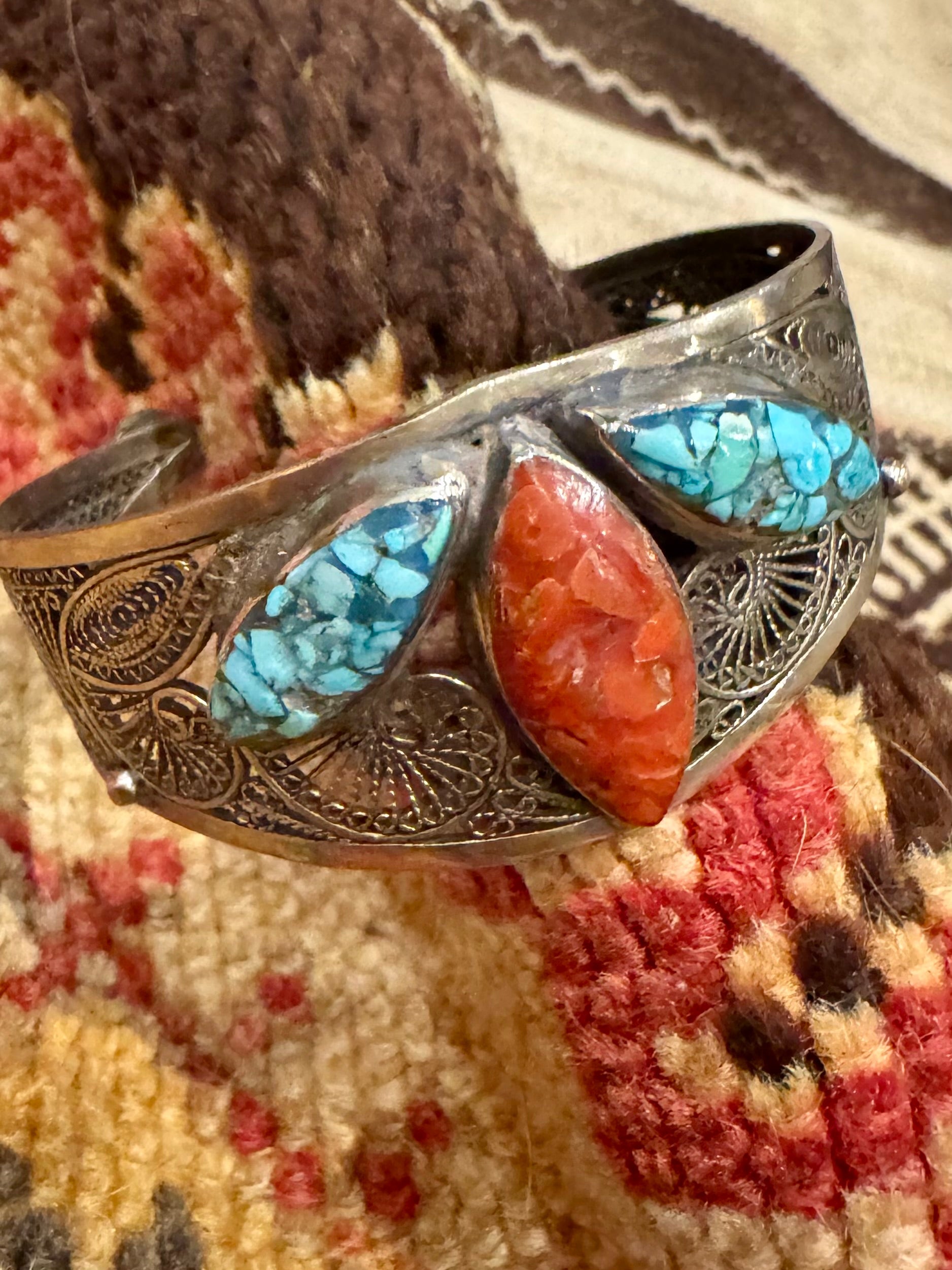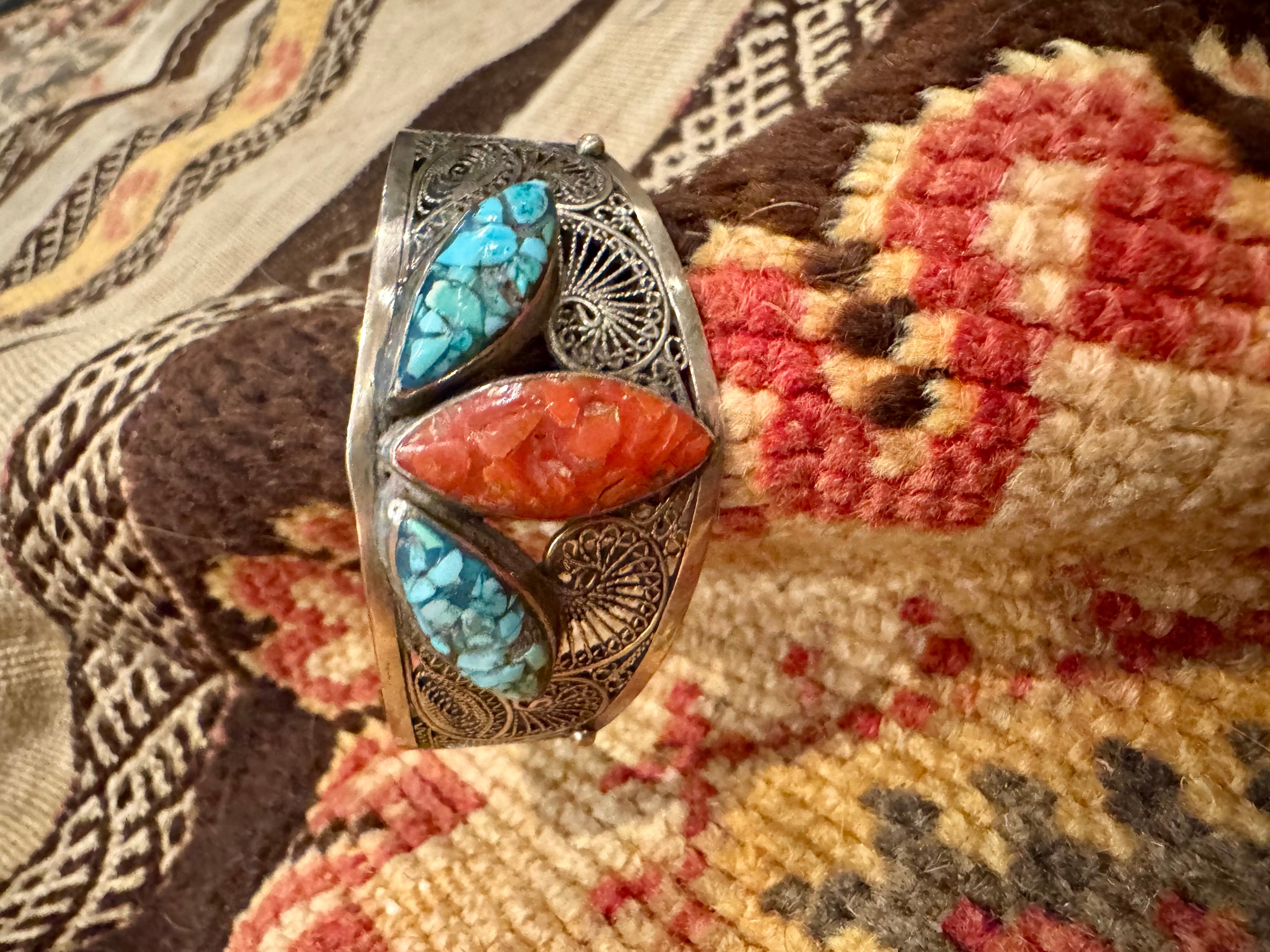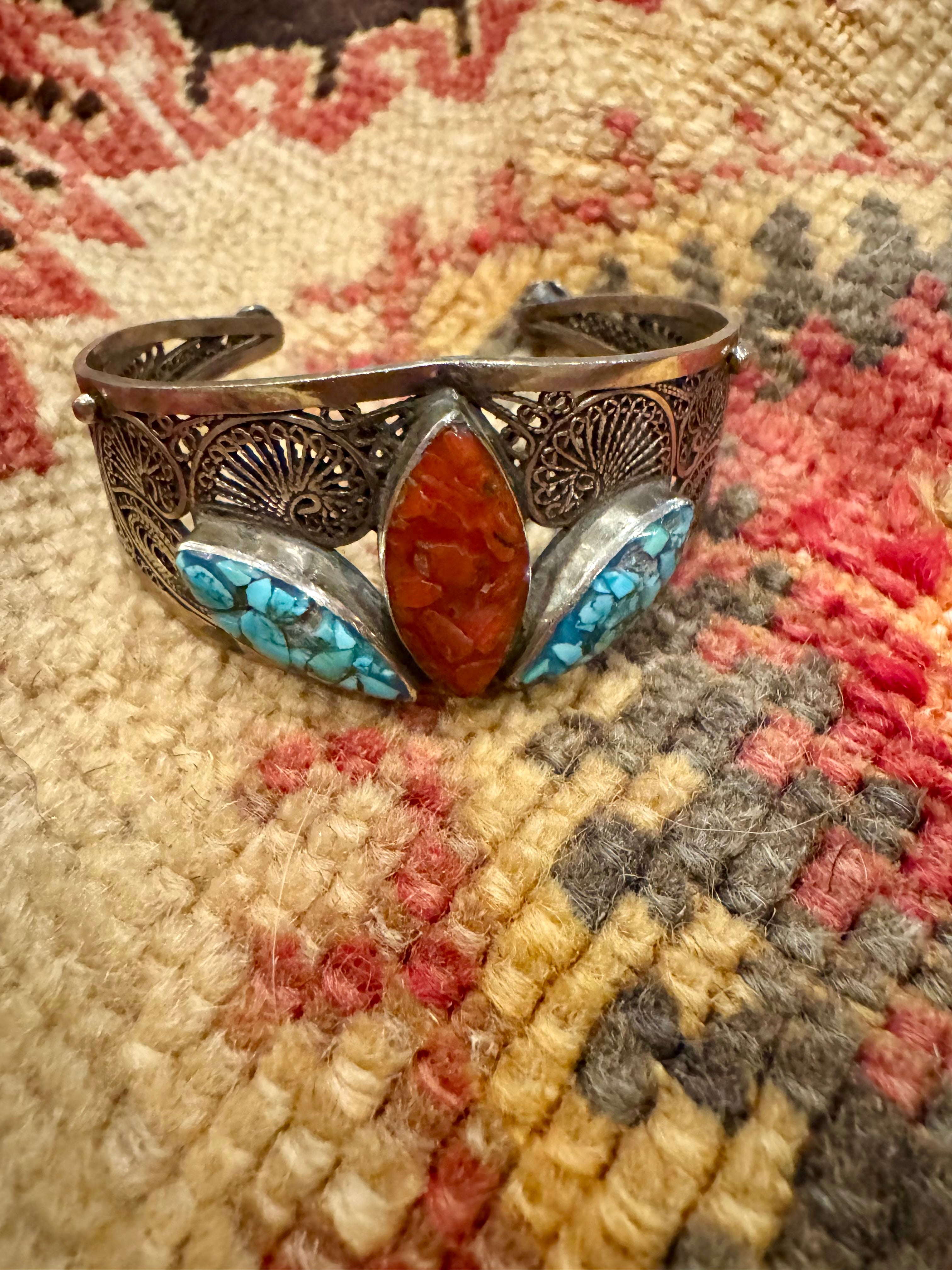 This antique Native American sterling silver turquoise and coral cuff showcases a beautiful filigree design, adding a touch of elegance to any outfit. The adjustable open fit makes it comfortable and easy to wear. Crafted with expert precision, this timeless and versatile cuff uplifts even a simple t shirt.