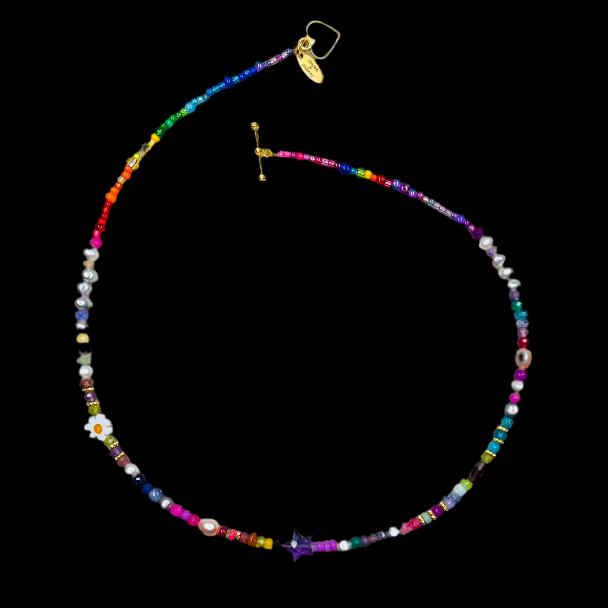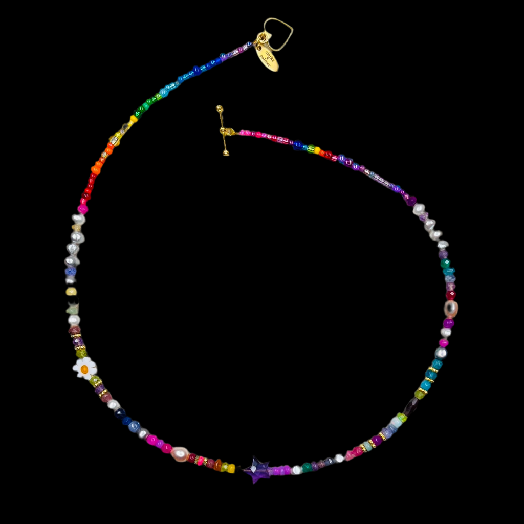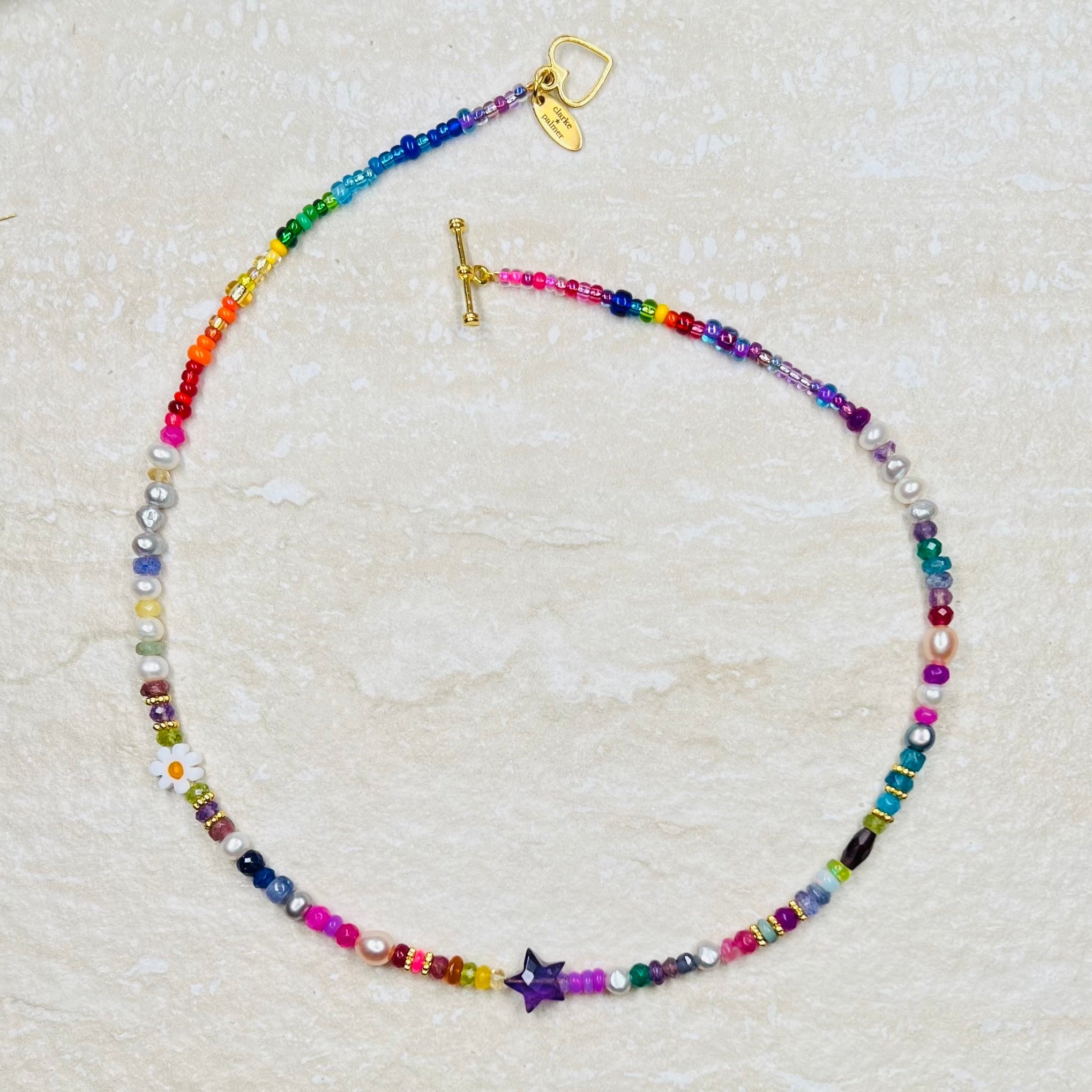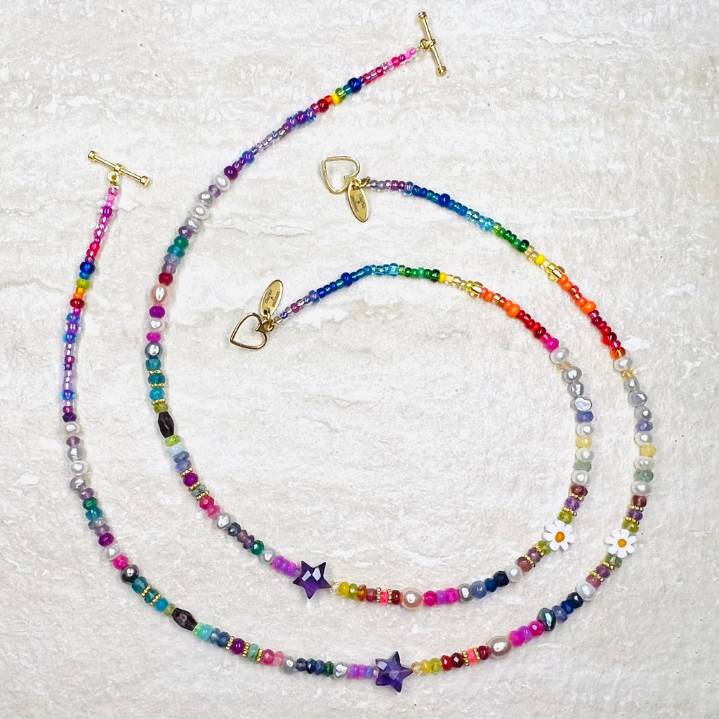 This beautiful necklace is handmade from a rich mix of rainbow shades of semi precious sustainably sourced rondelles, including Ethiopian opals, freshwater pearls, peridot, sapphire, ruby, emerald, moonstone, amethyst, garnet, citrine and tanzanite. It is centred by a hand cut amethyst star.