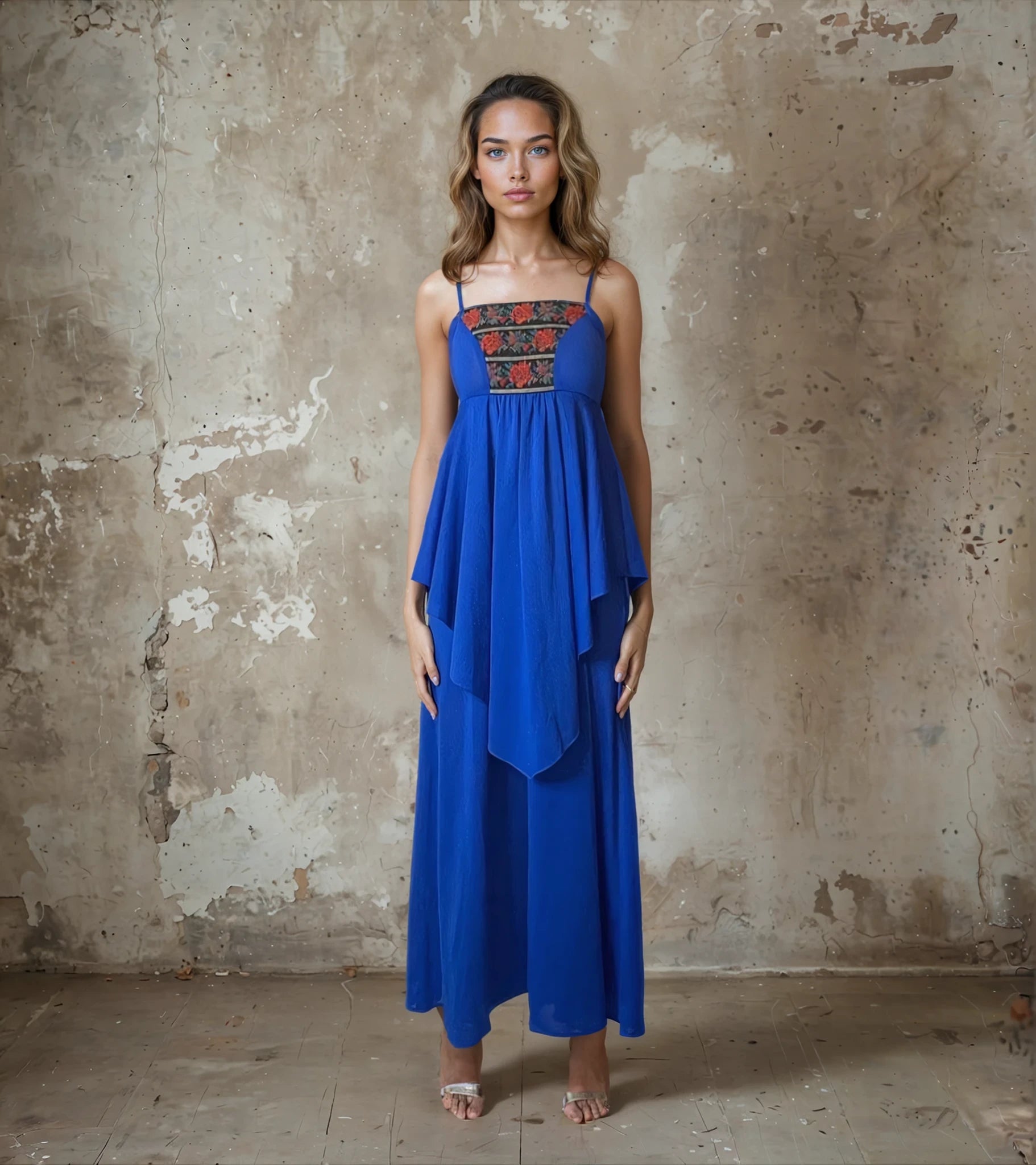This Original Beautiful 1970's Vintage Floral Trim Blue Strapped Dress is a super cute dress by "Mr Darren". It has a lovely floral trim around the top part of the dress and 2 straps. It says it is a UK size 8 - 10 but please do check measurements to avoid disappointment.