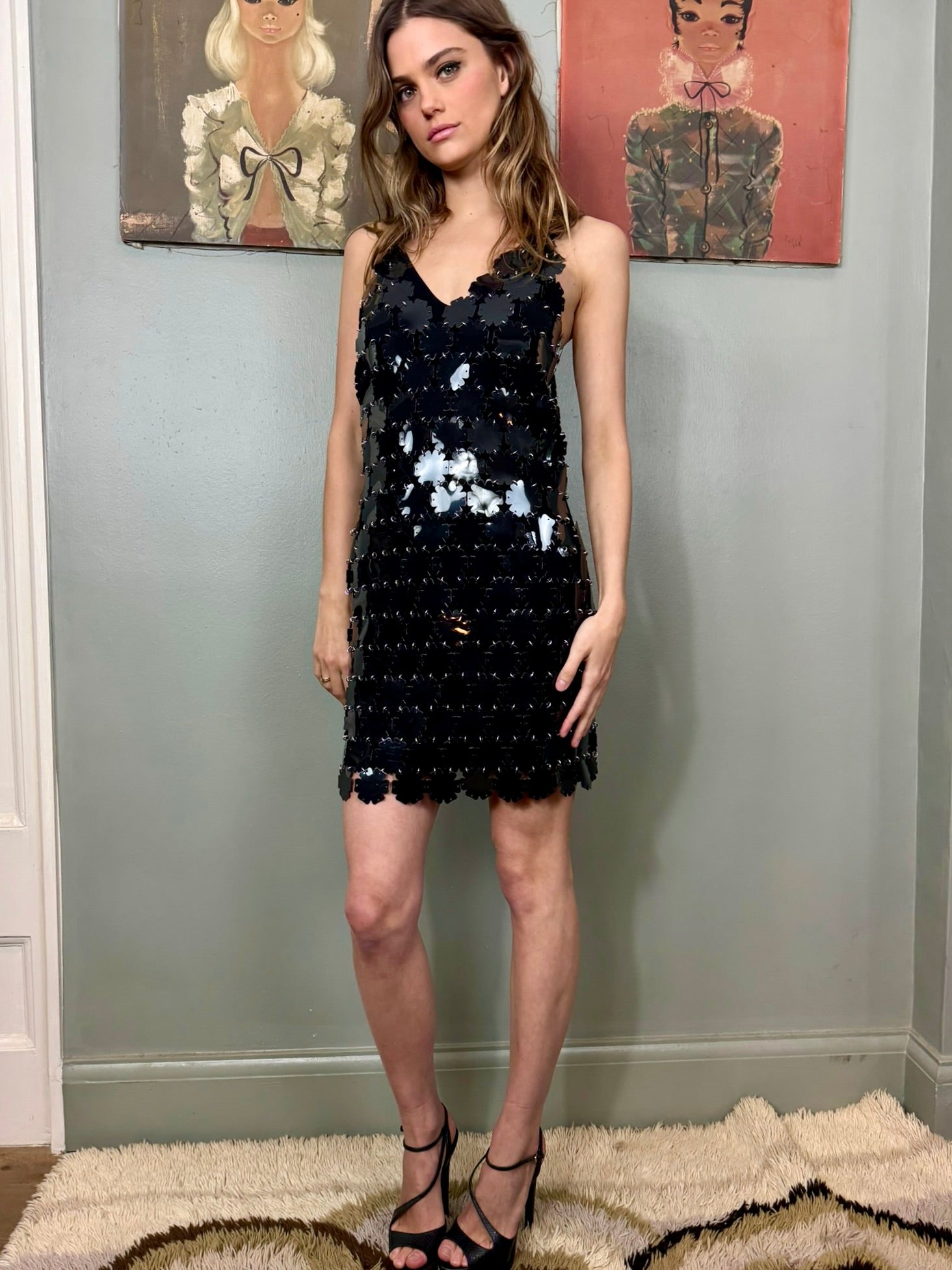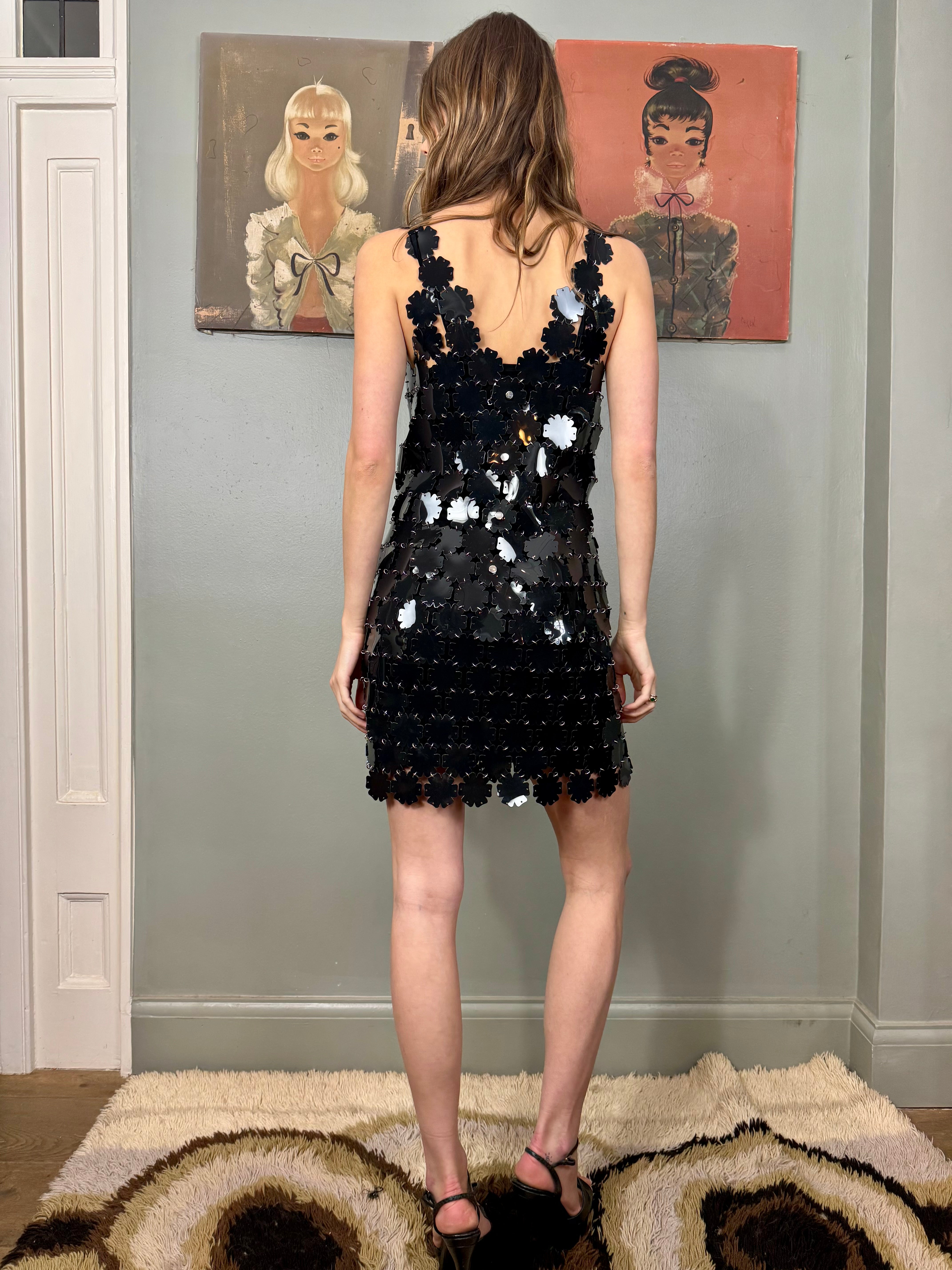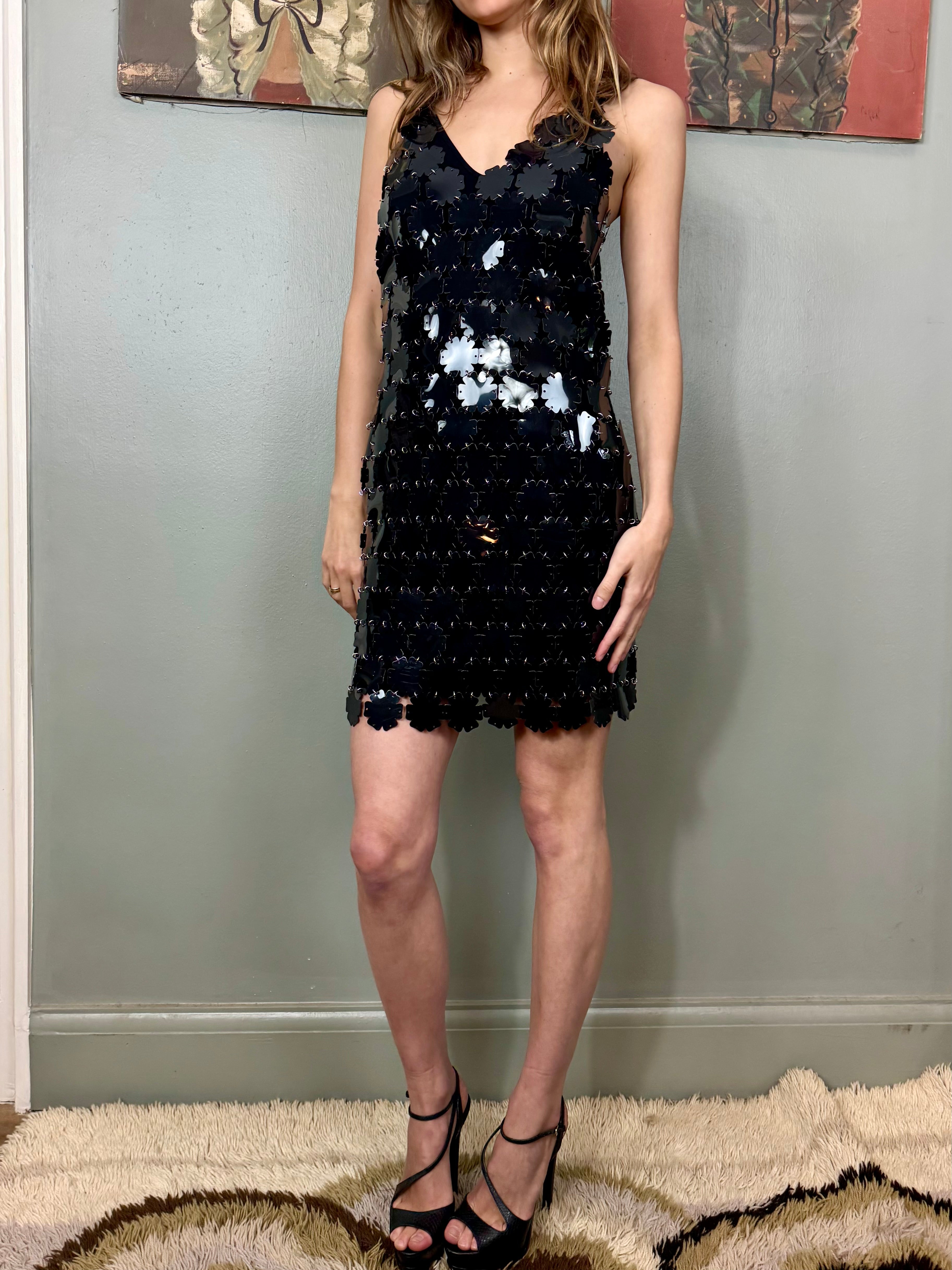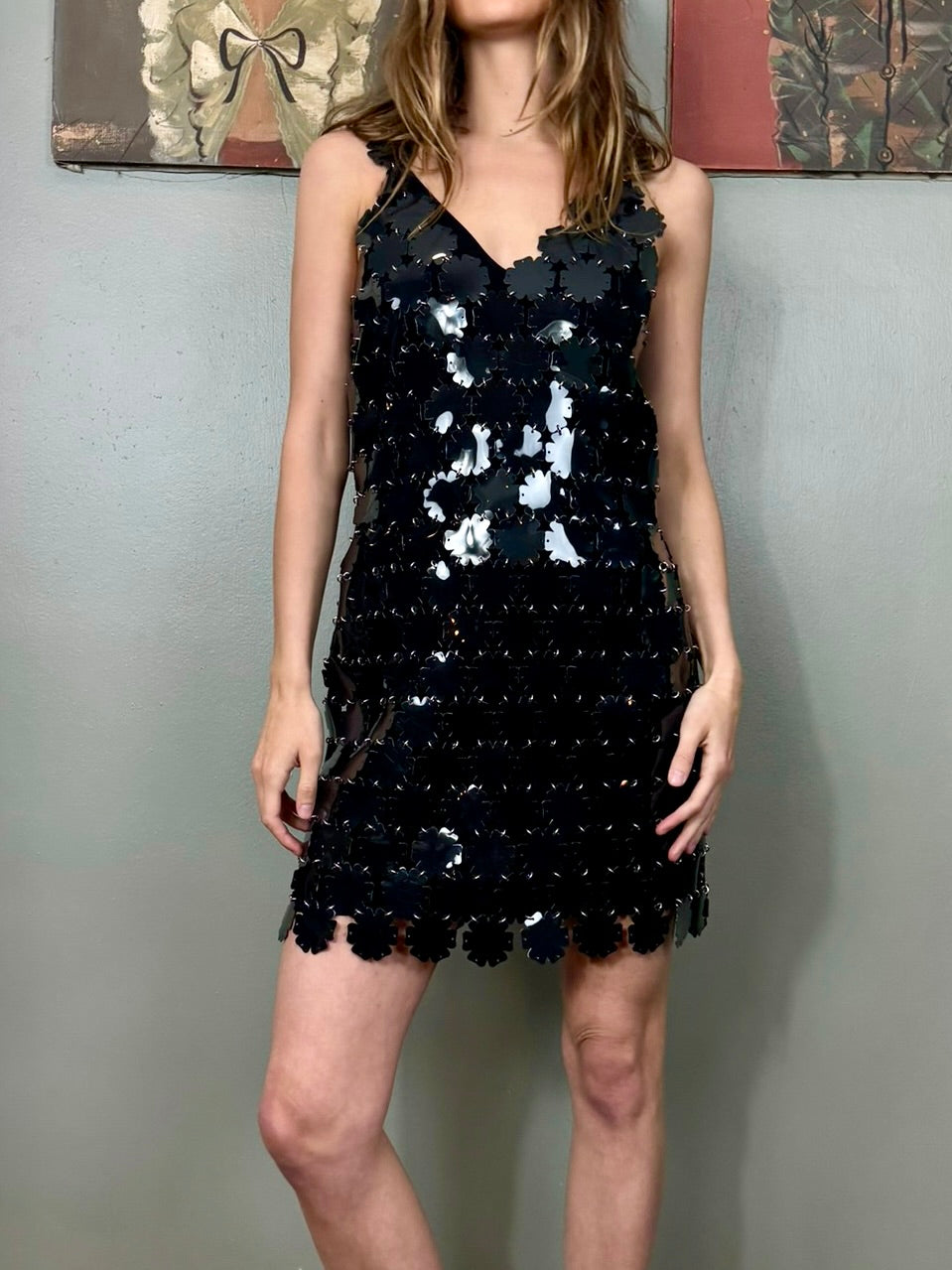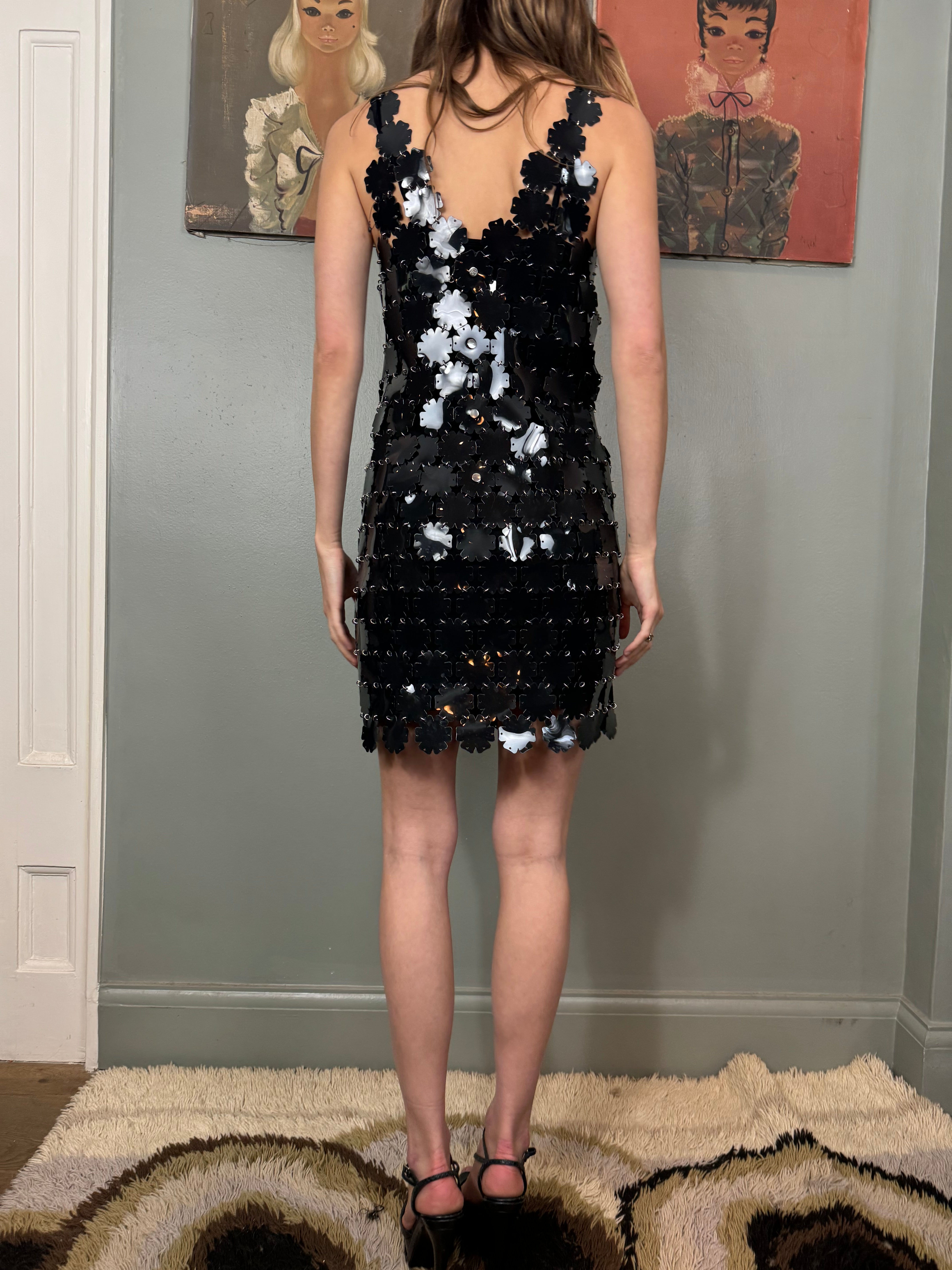 Discover the iconic Pacco Rabanne Y2K black floral PVC link mini dress. Featuring a back and front V-neck, with magnetic buttons for easy wear. Comes with a slip lining for added comfort and style. Elevate your look with this collectable and modern piece.