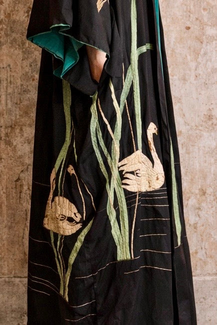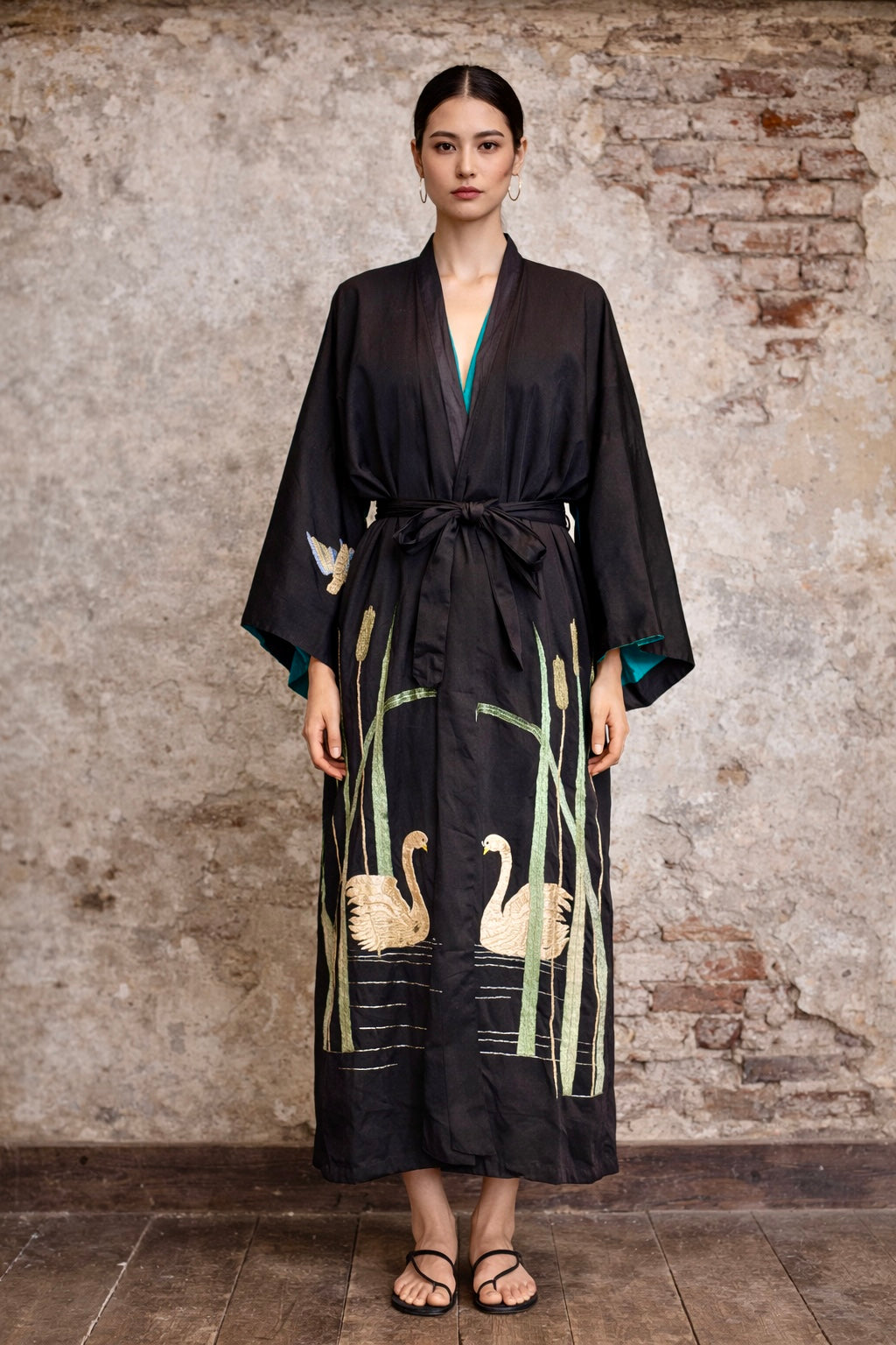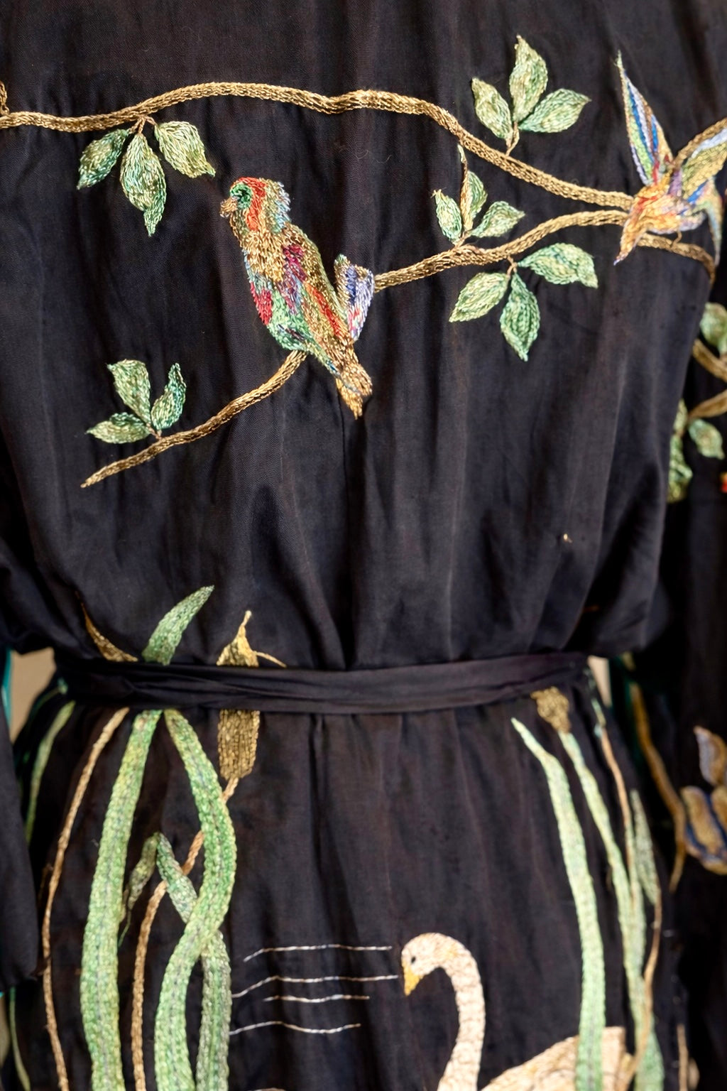 Expertly crafted in the 40s silk, this embroidered Japanese Kimono showcases stunning traditional kimono sleeves. The sleek black silk is adorned with a delicate floral tapestry and large swans, truly capturing the essence and craftsmanship of oriental beauty. Lined in emerald green cotton, this kimono is not only stylish but comfortable as well. Has a black tie attached to the back.