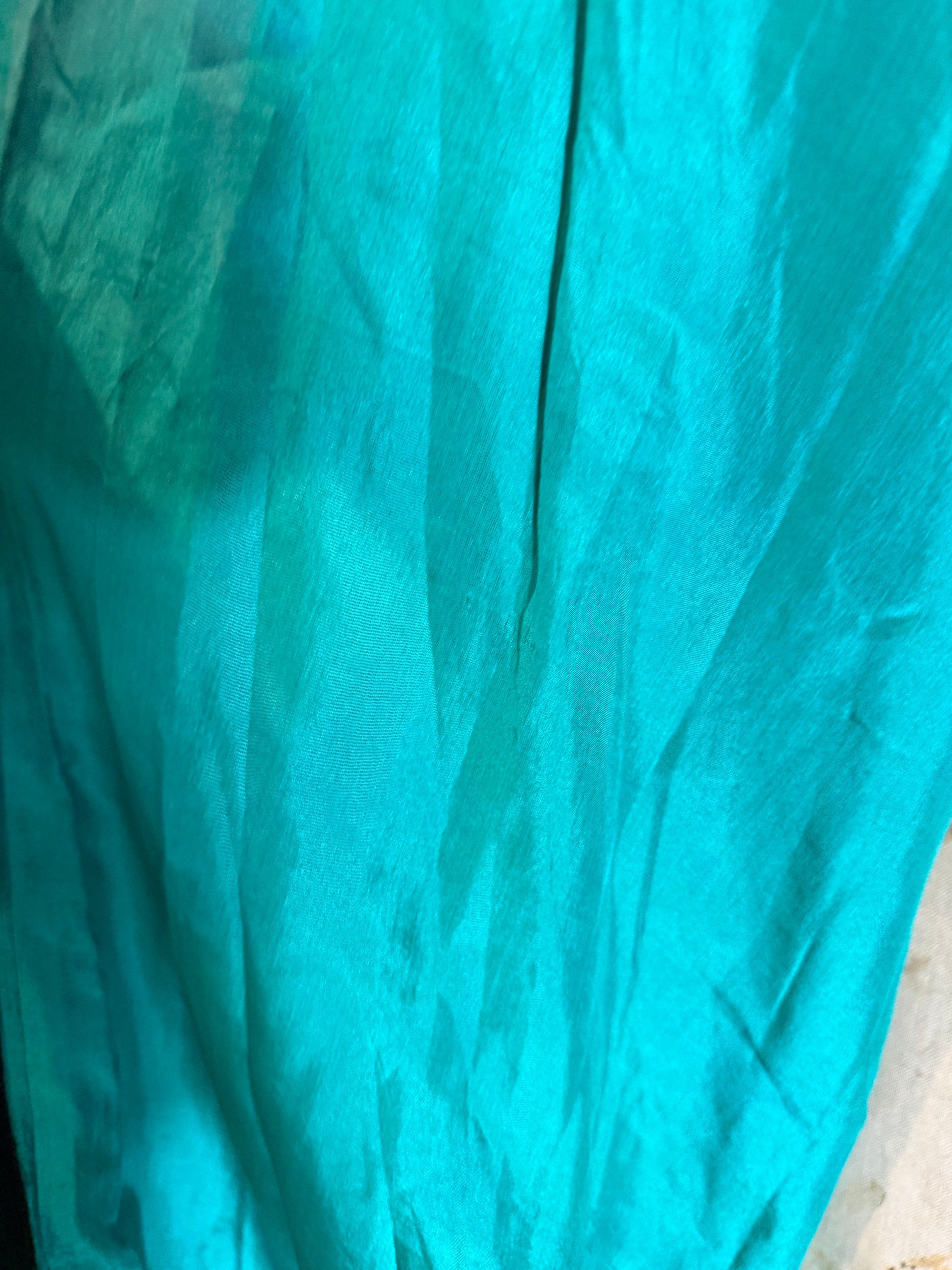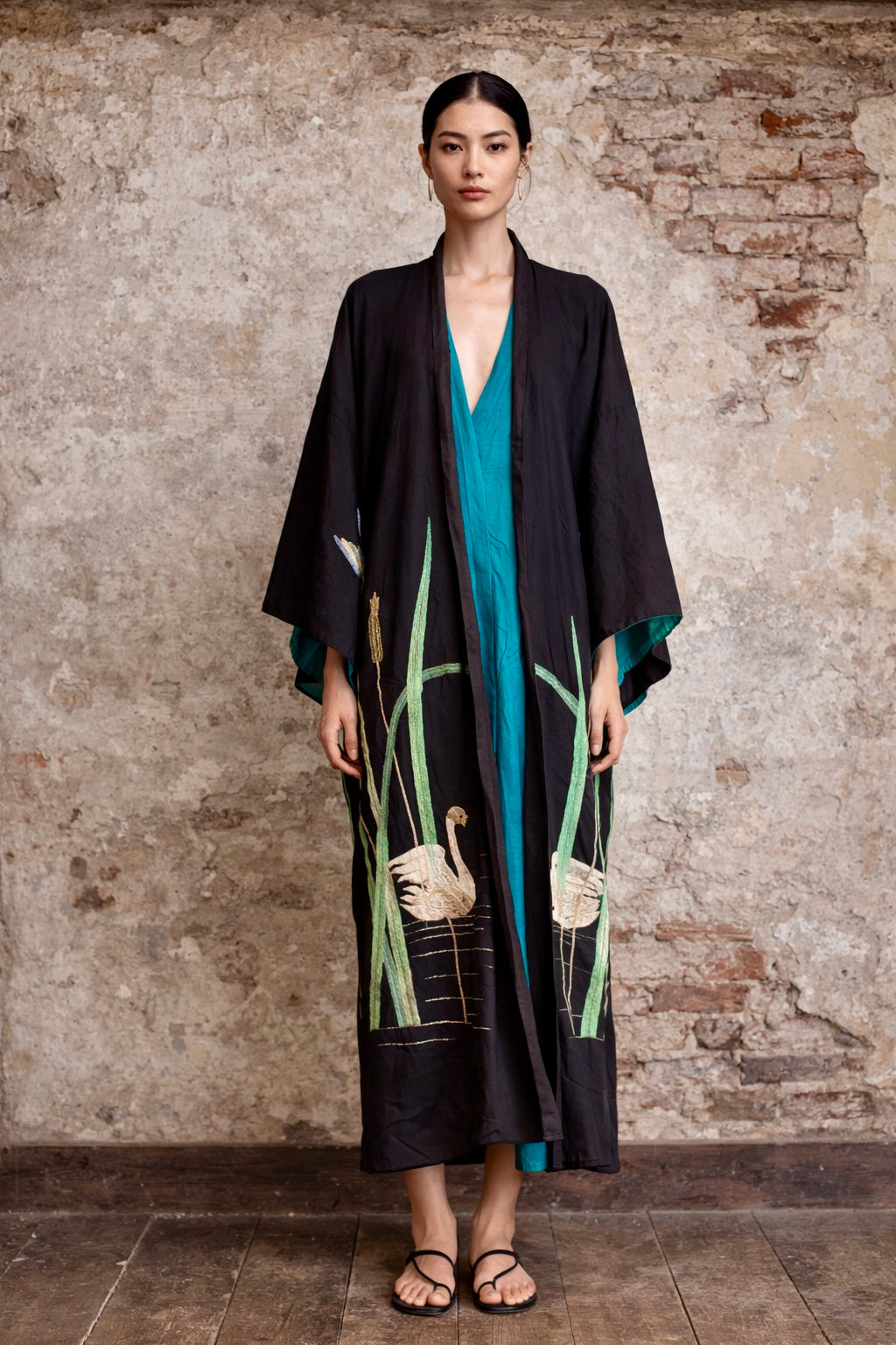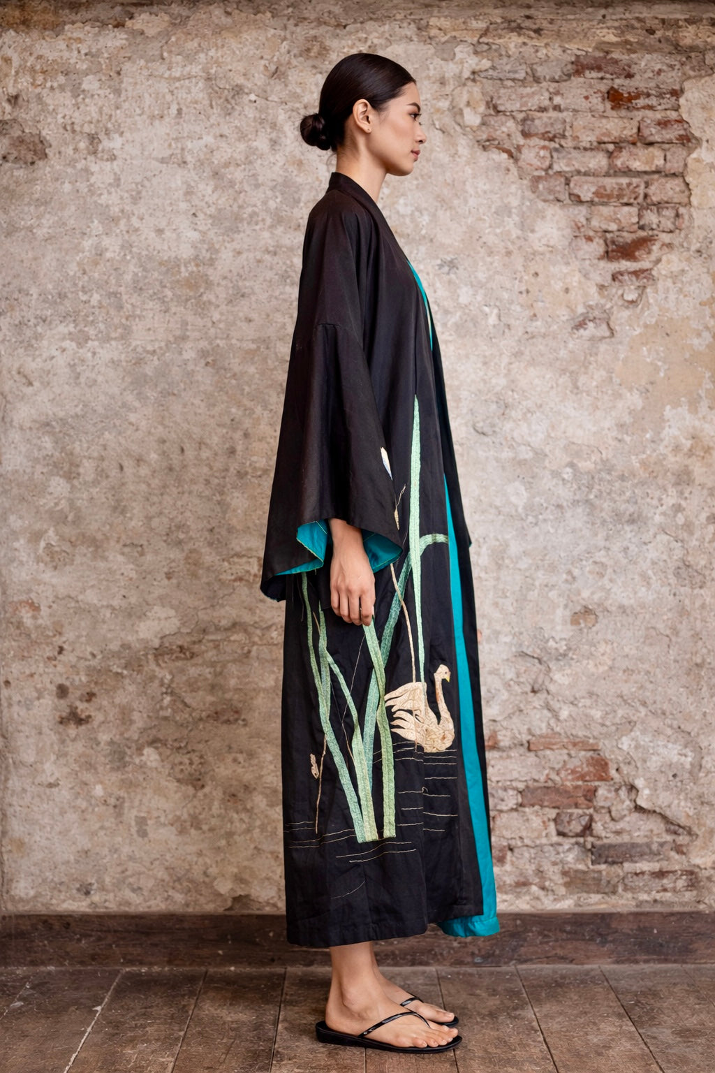 Expertly crafted in the 40s silk, this embroidered Japanese Kimono showcases stunning traditional kimono sleeves. The sleek black silk is adorned with a delicate floral tapestry and large swans, truly capturing the essence and craftsmanship of oriental beauty. Lined in emerald green cotton, this kimono is not only stylish but comfortable as well. Has a black tie attached to the back.