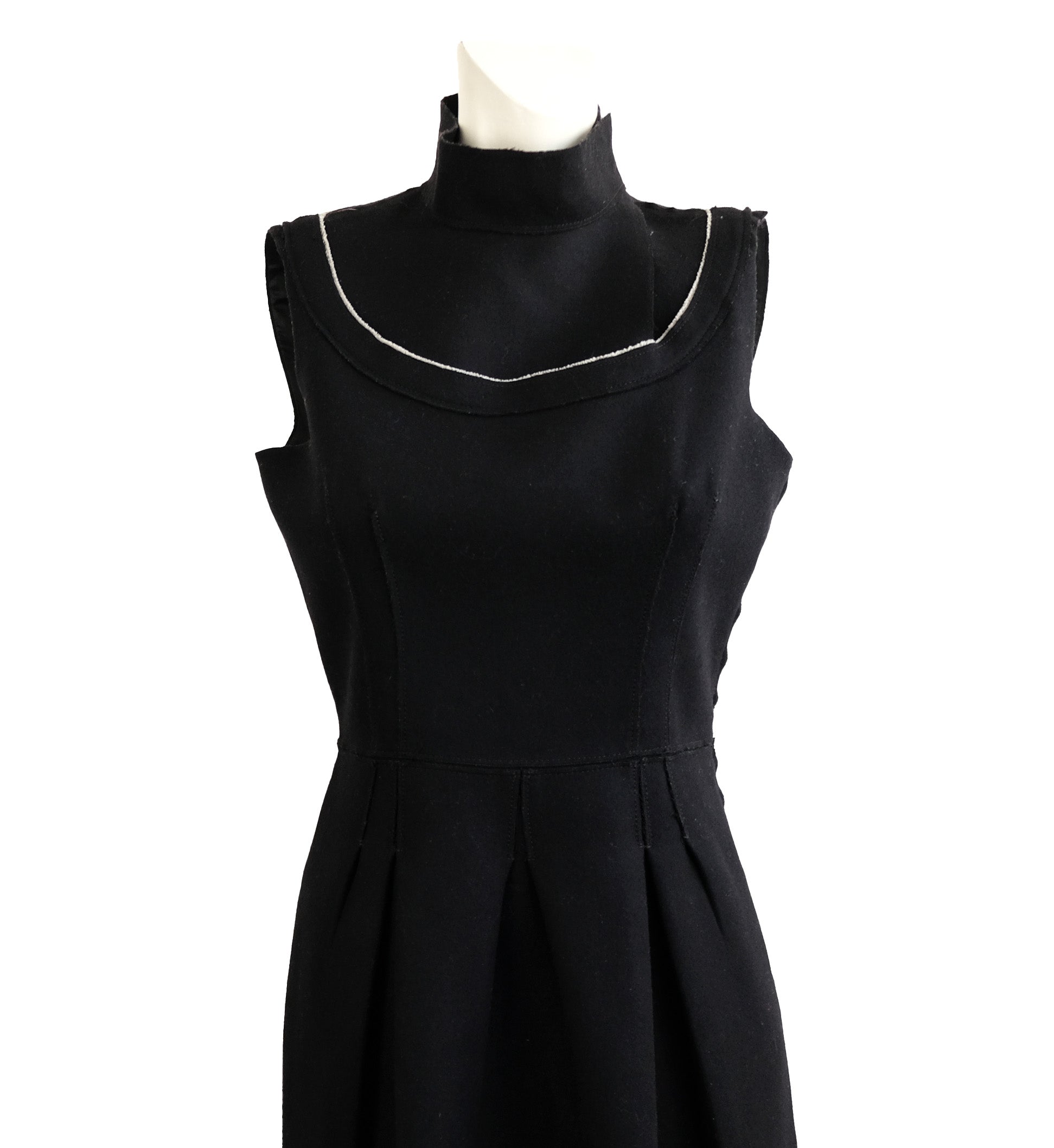 High neck fastening to the side with poppers, on a circular yoke trimmed with a thin white line. Darted bodice and fitted skirt with small tucks at the waist and split at the back. Below knee length.