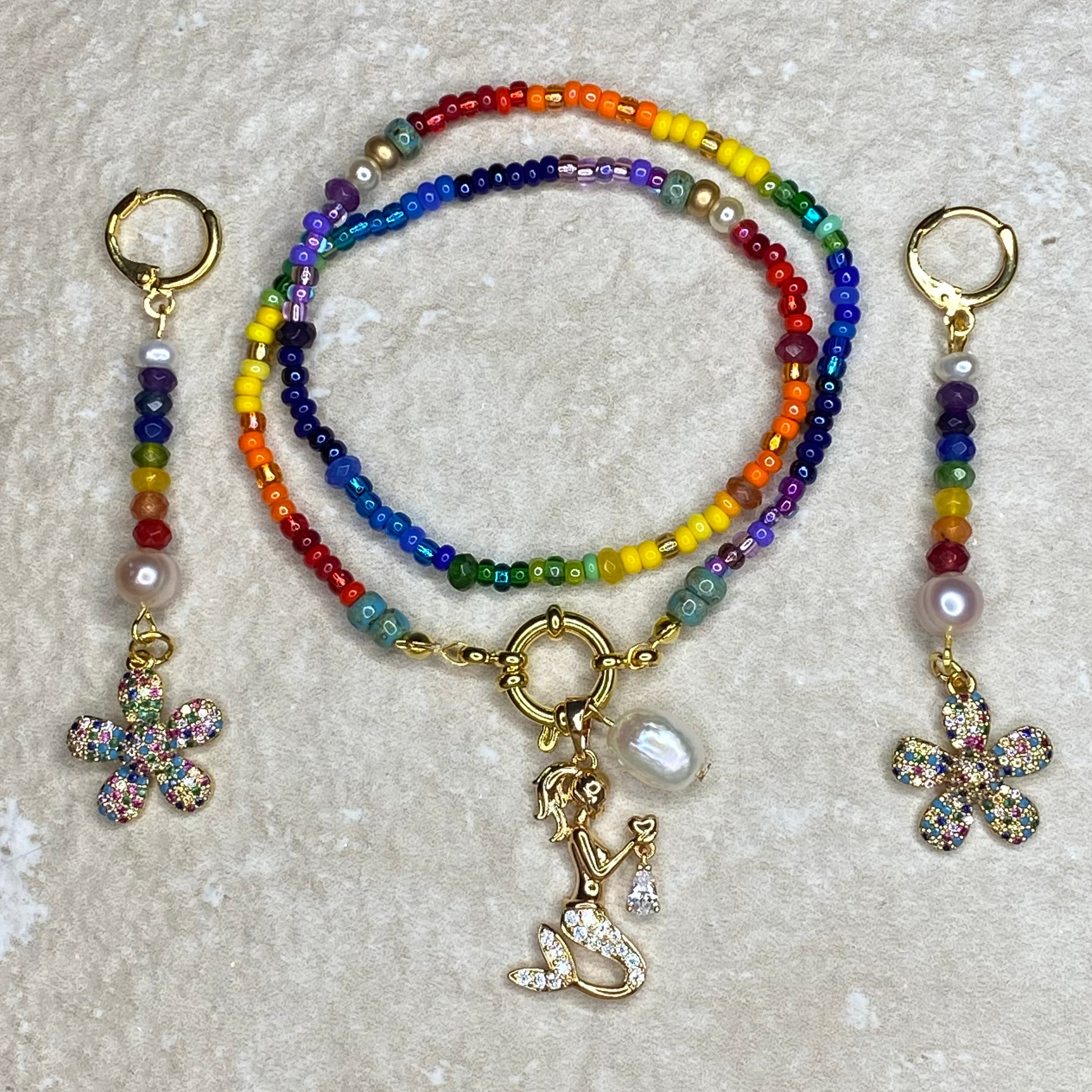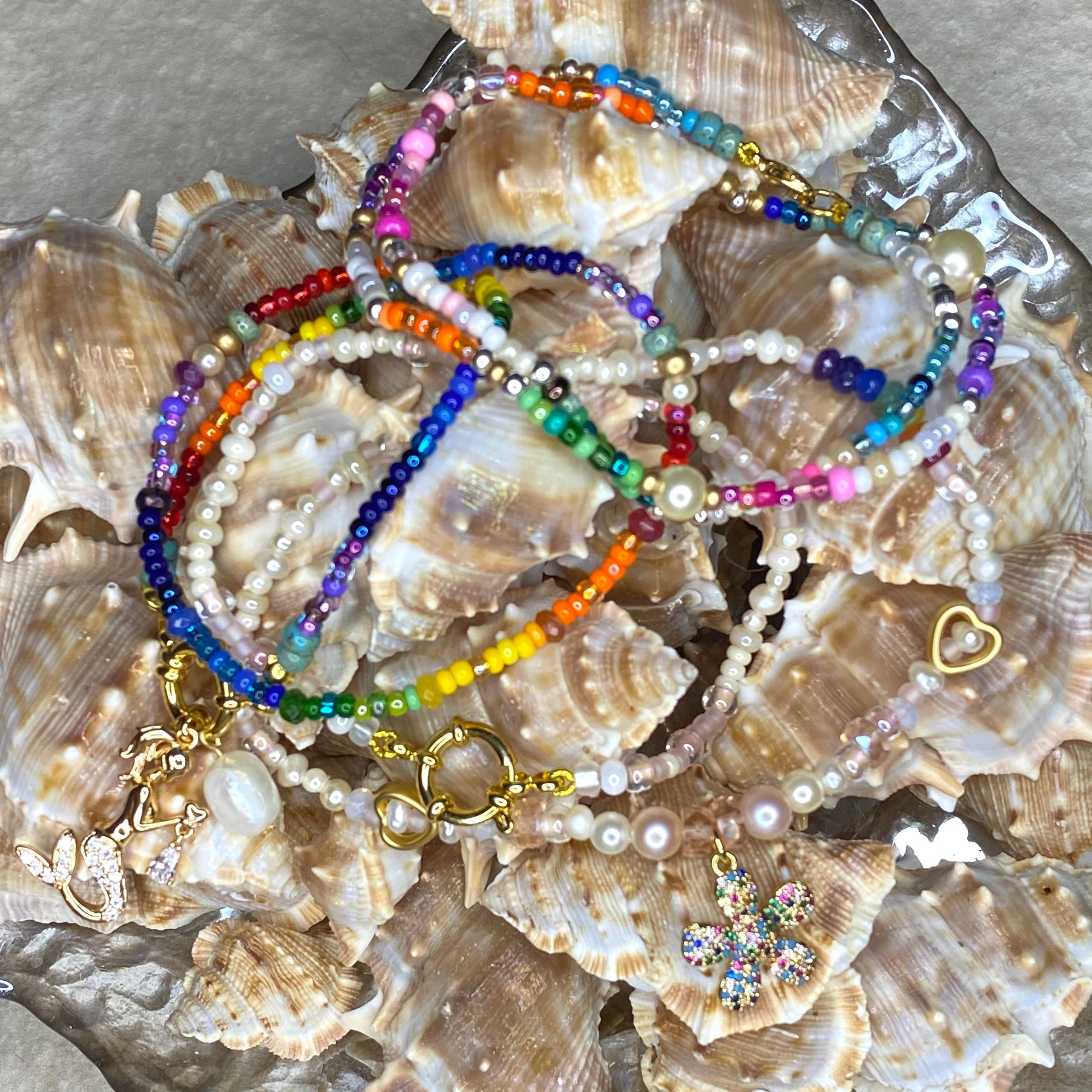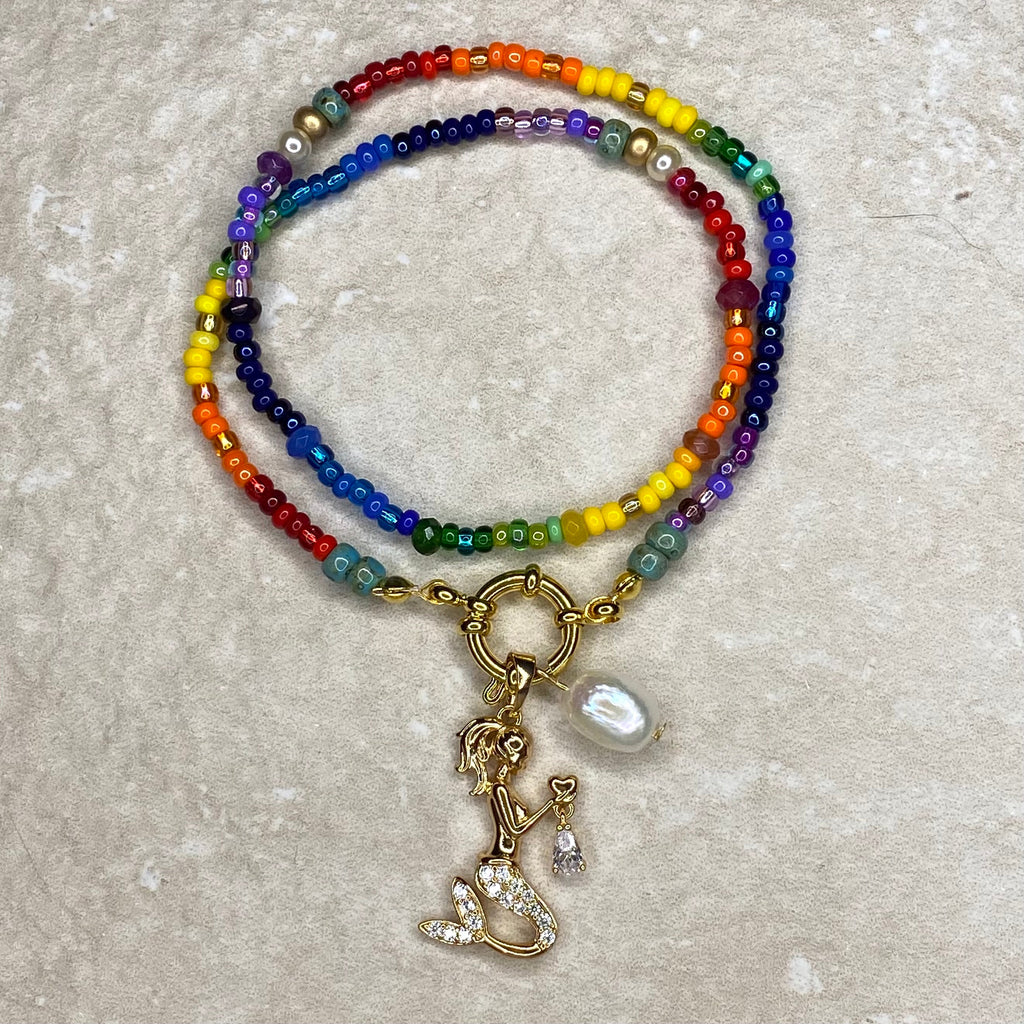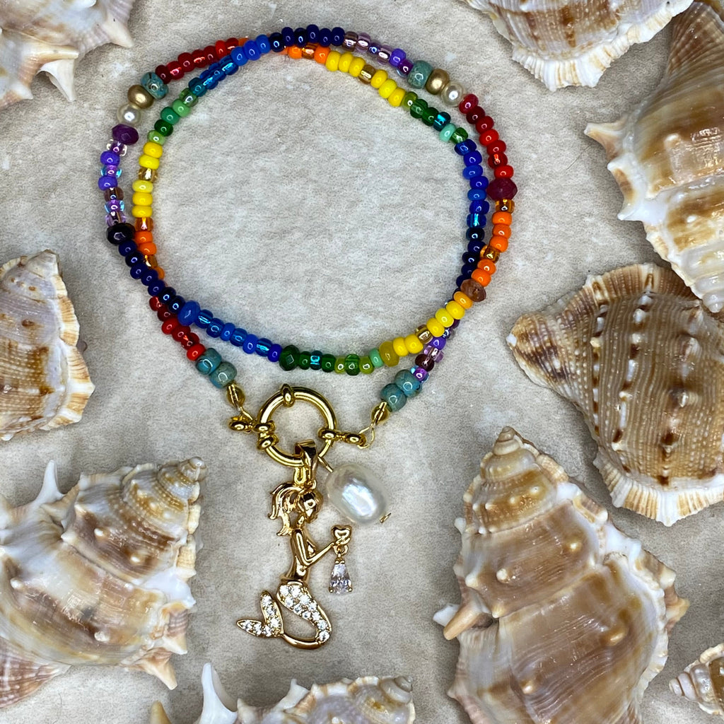 The Rainbow Semi-Precious Charm Necklace is handmade from Preciosa and Miyuki glass beads and agates.