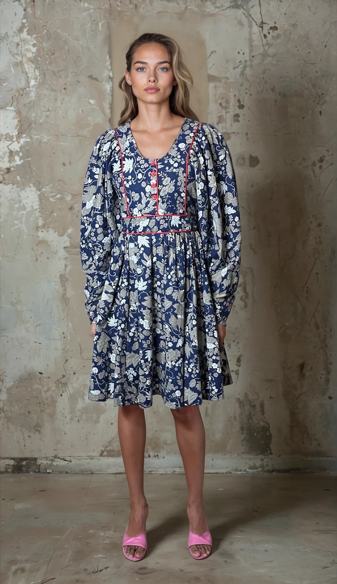 This rare and original vintage 1970's navy floral dress is a unique and stylish piece with a romantic floral design. It fits sizes 10-14, giving you a flattering look. Perfect for adding a romantic twist to your wardrobe.