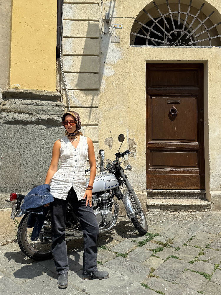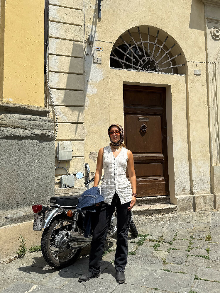 Discover timeless elegance with The Sandglass Waistcoat, a one-of-a-kind piece crafted from pure Italian linen and reworked by hand in Florence. Designed with an hourglass silhouette, this reimagined vintage waistcoat combines classic Italian tailoring with a modern, effortless edge.