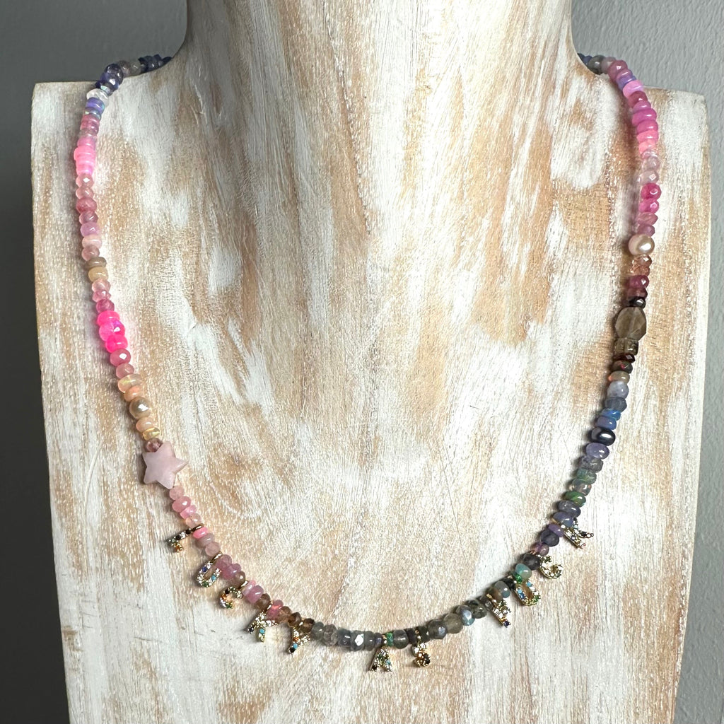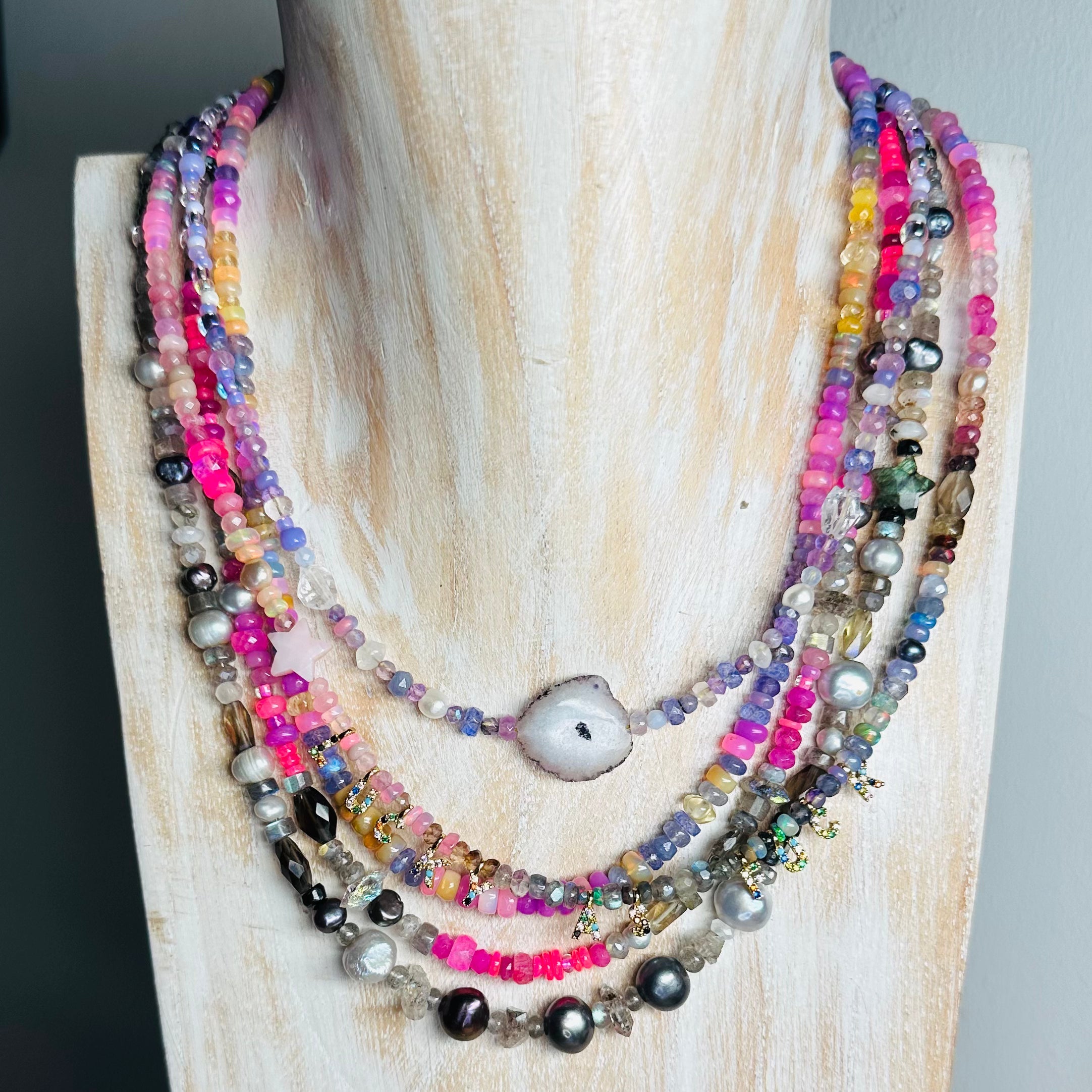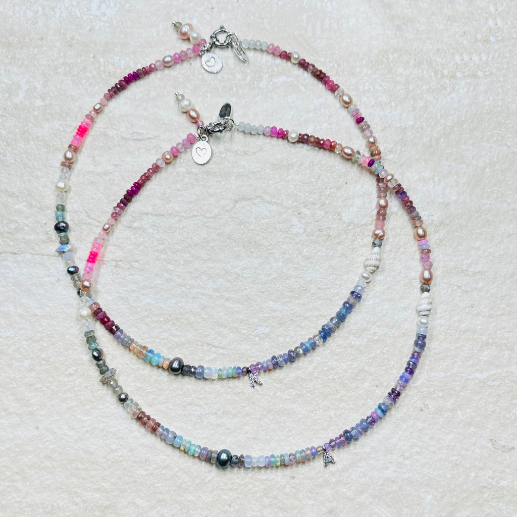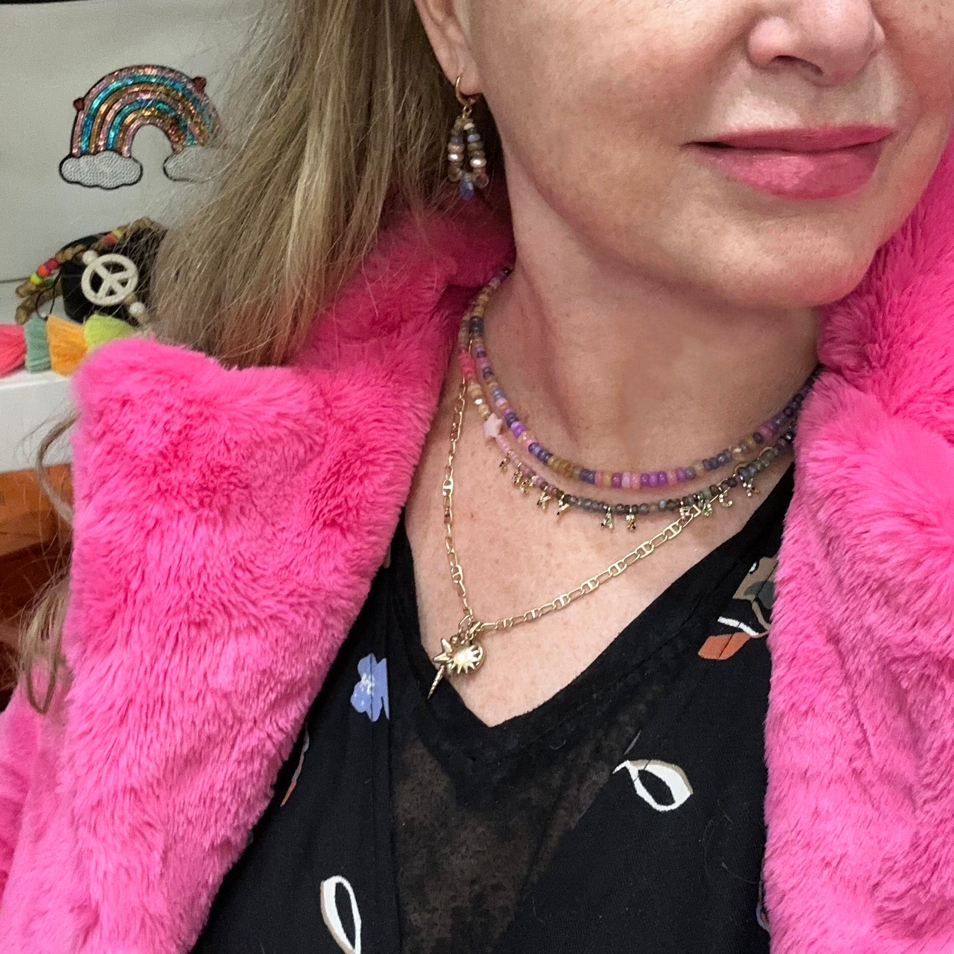 Our Rose Violet necklace is handmade from ombré shades of purple, delphinium blue and pink sustainably sourced gemstones. Including a handcut pale pink opal star it also includes hand cut opal, moonstone, tanzanite, tourmaline, pearl, sapphire, amethyst and ruby rondelles.tones including garnet, ruby, agate, opal, moonstone, pearls. You can choose between heart shaped toggle or sailor clasp in 24 kt gold vermeil.