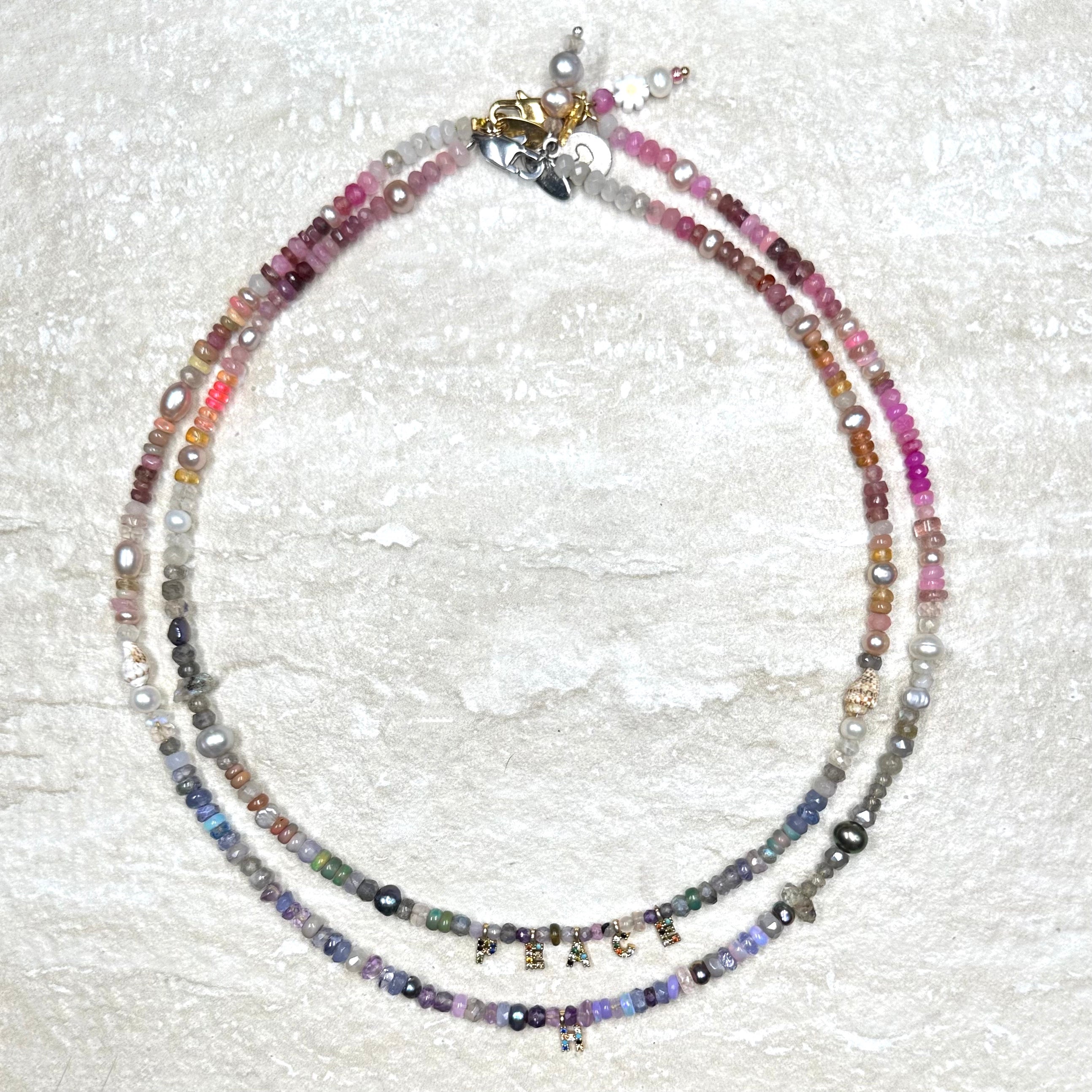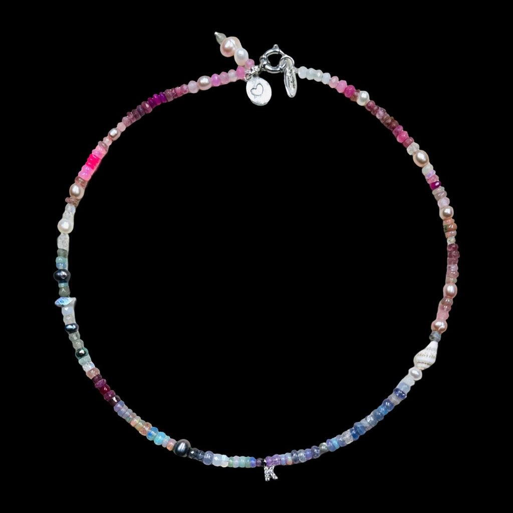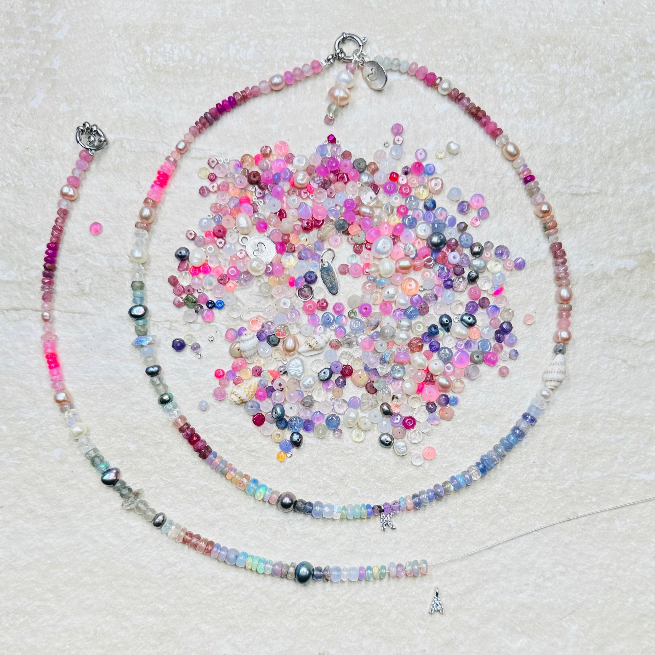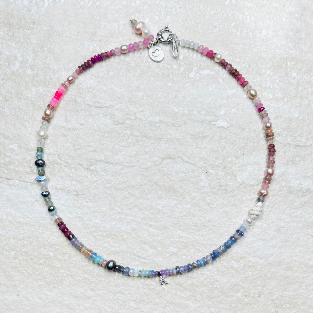 Our Rose Violet necklace is handmade from ombré shades of purple, delphinium blue and pink sustainably sourced gemstones. Including a handcut pale pink opal star it also includes hand cut opal, moonstone, tanzanite, tourmaline, pearl, sapphire, amethyst and ruby rondelles.tones including garnet, ruby, agate, opal, moonstone, pearls. You can choose between heart shaped toggle or sailor clasp in 24 kt gold vermeil.