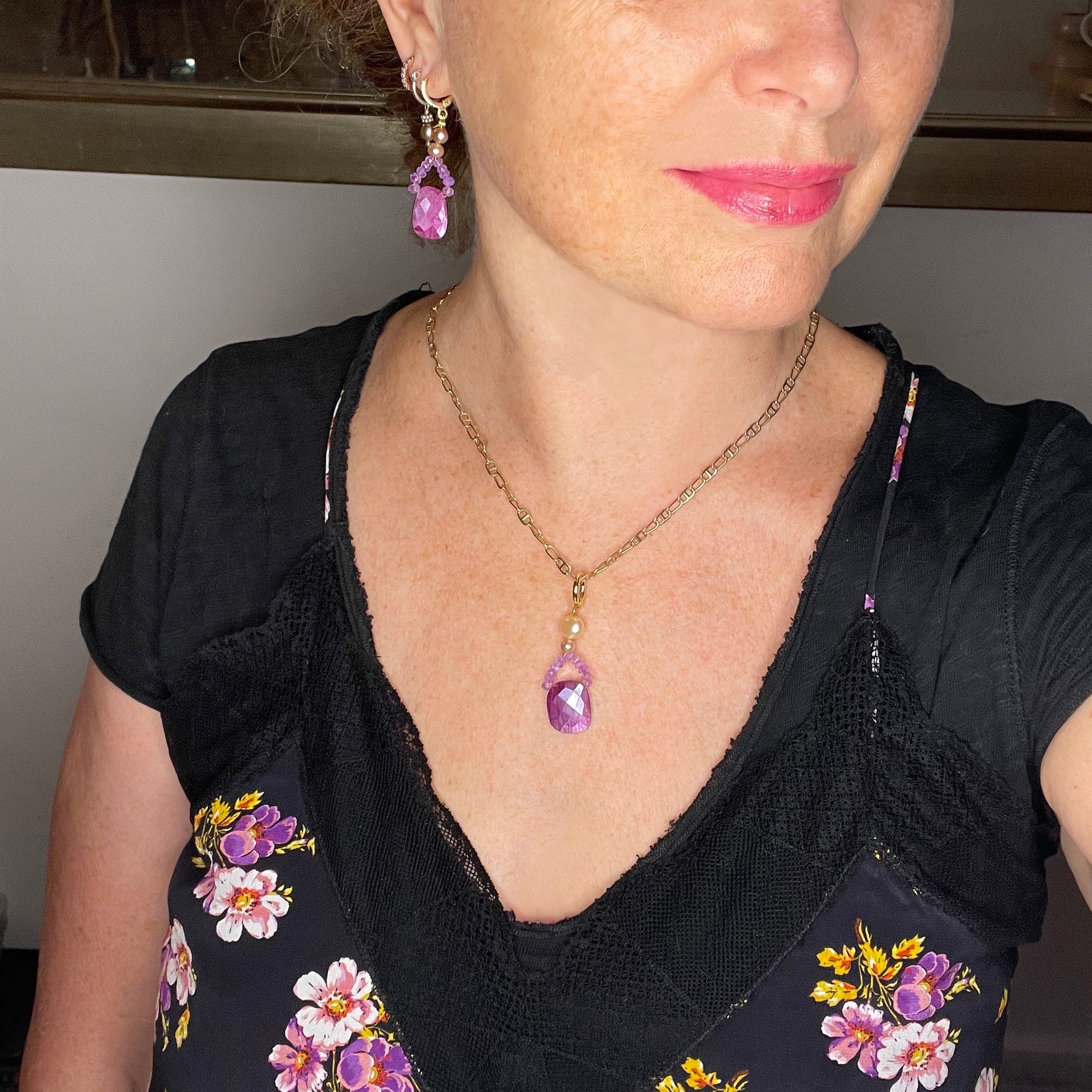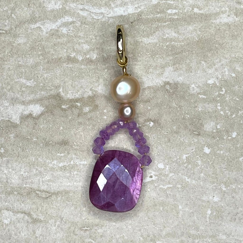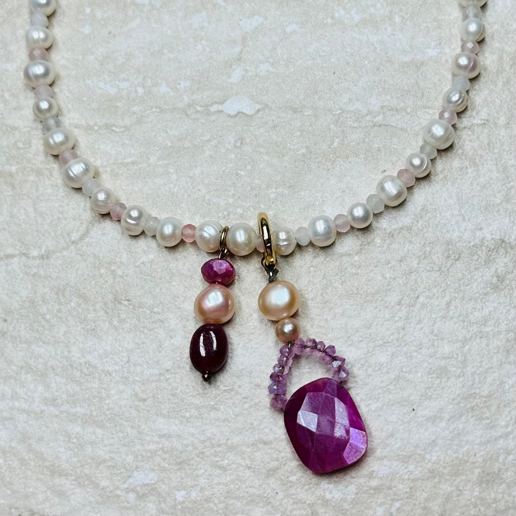 Part of our Precious Elements Collection, this 'Peony' pendant is handmade from a hand cut faceted precious metal coated ruby moonstone focal drop, moonstone rondelles and creamy pink pearls.