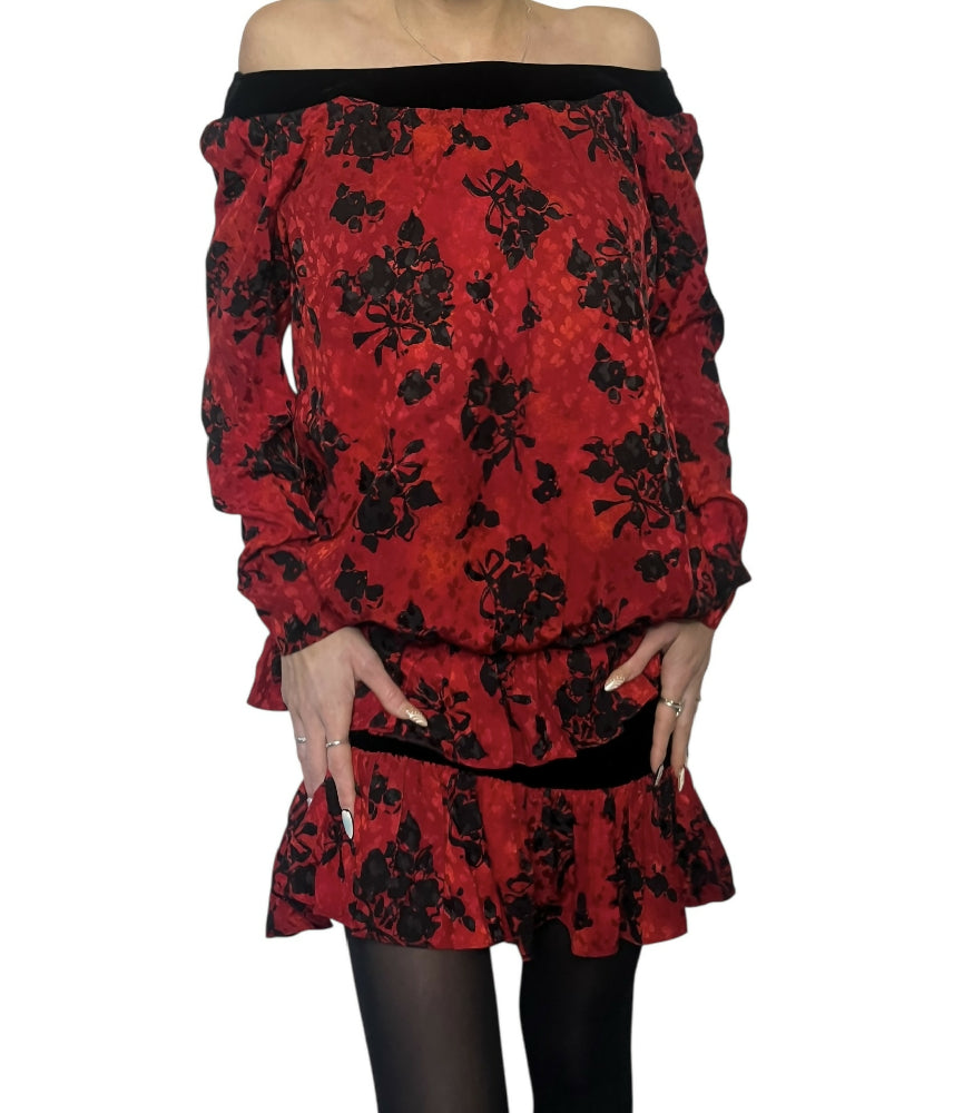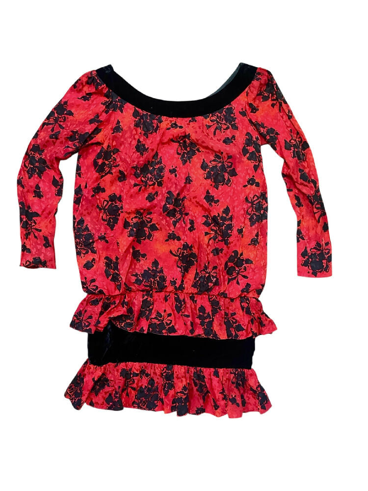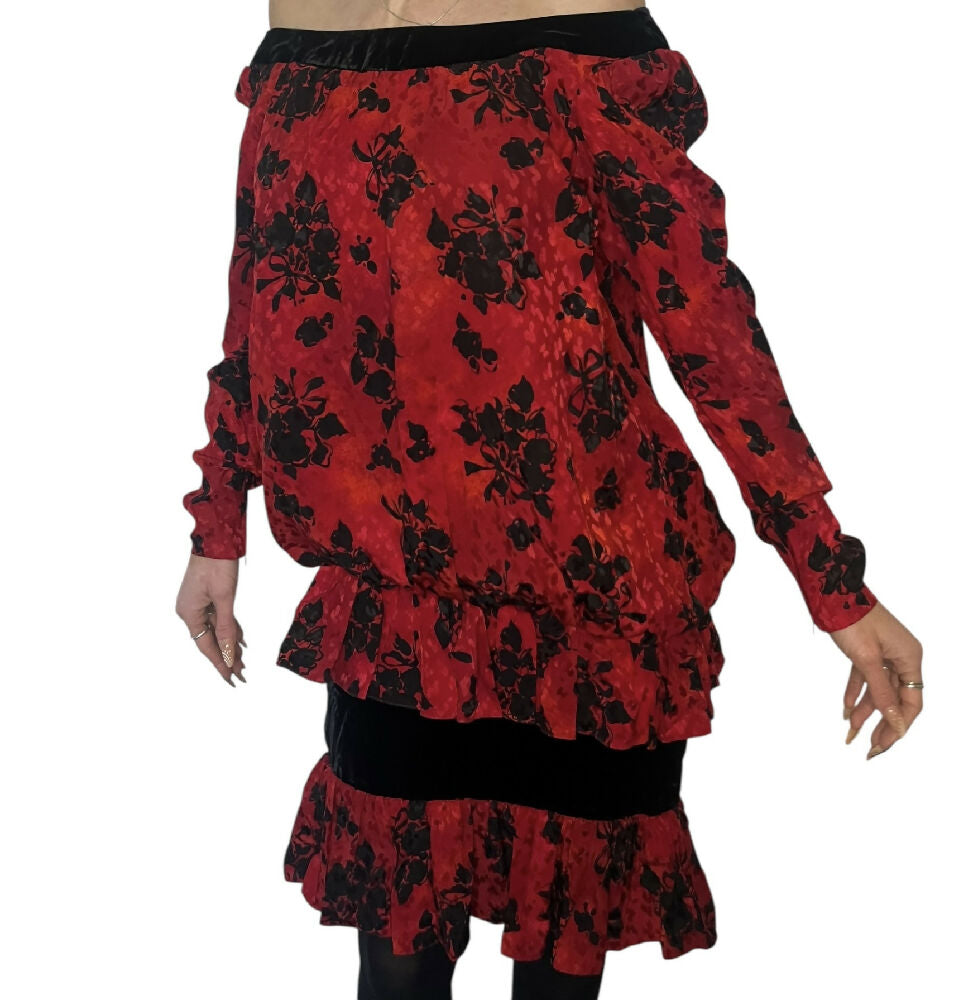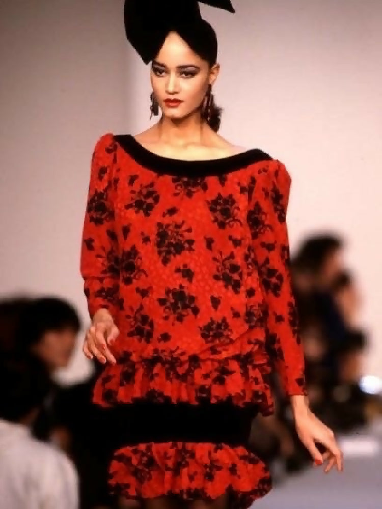 This dramatic floral dress from Saint Laurent is a stunning example of their bright and bold 1980s runway pieces. From the Autumn/Winter 1987/88 collection, as seen on the runway.p, this piece features stunning draped and ruched fabrics in a bright blood red, contrasted with black velvet trims and floral sequin detailing. It truly is a unique piece that is meant for someone who loves to be daring.