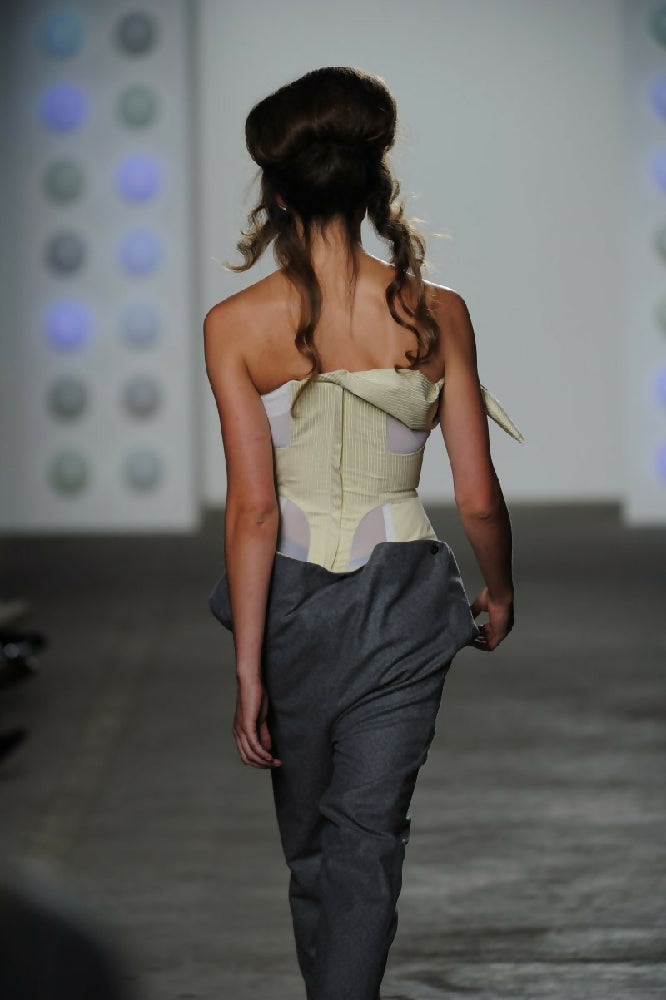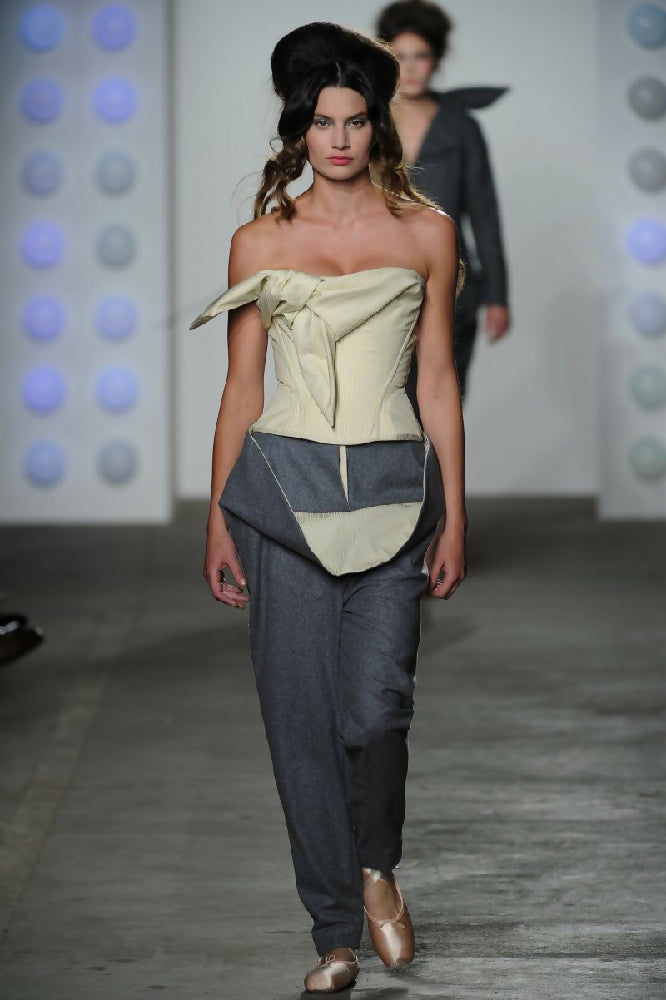 Skeleton Trouser S/S 2011: The low crotch Trouser is cut with an outer drape and a kangaroo style pocket across the centre front. The outside front part of the trouser has an oversize drape, exposing the inside buttons and front placket. The top of the outer drape has button holes sewn in near the top edge which loops over the buttons that are sewn in around the top of the trouser waist. Fabric: Outer: 90% wool,10% ws ; Lining:100% cotton in pale yellow and white pinstripe, Size 10 LAST ONE