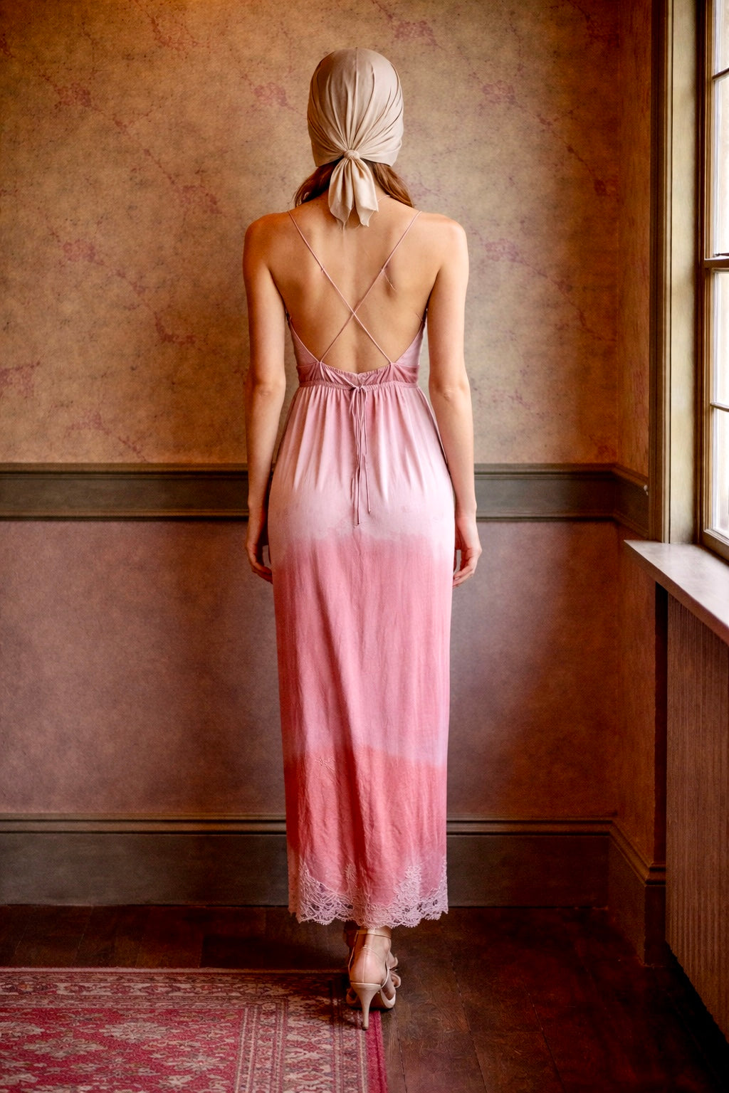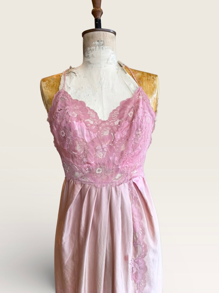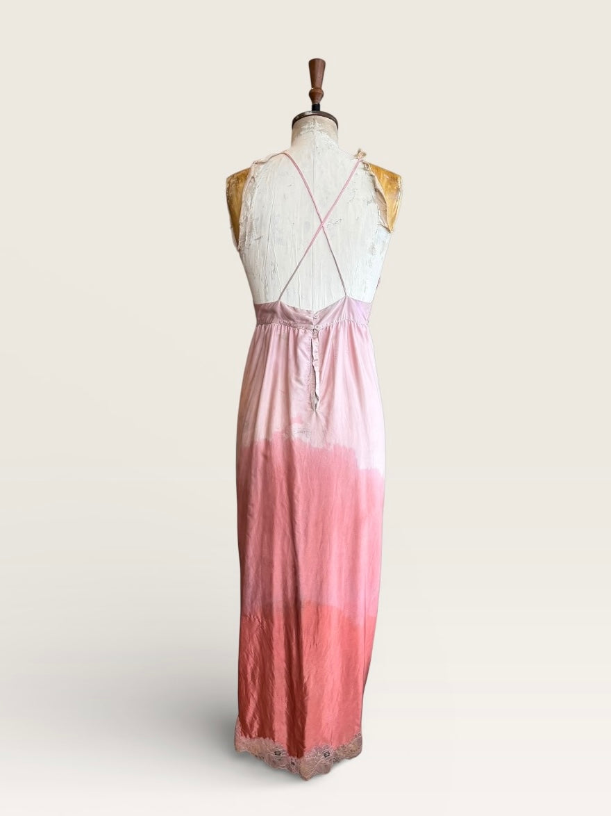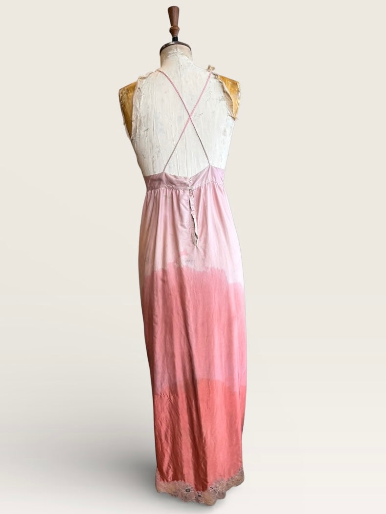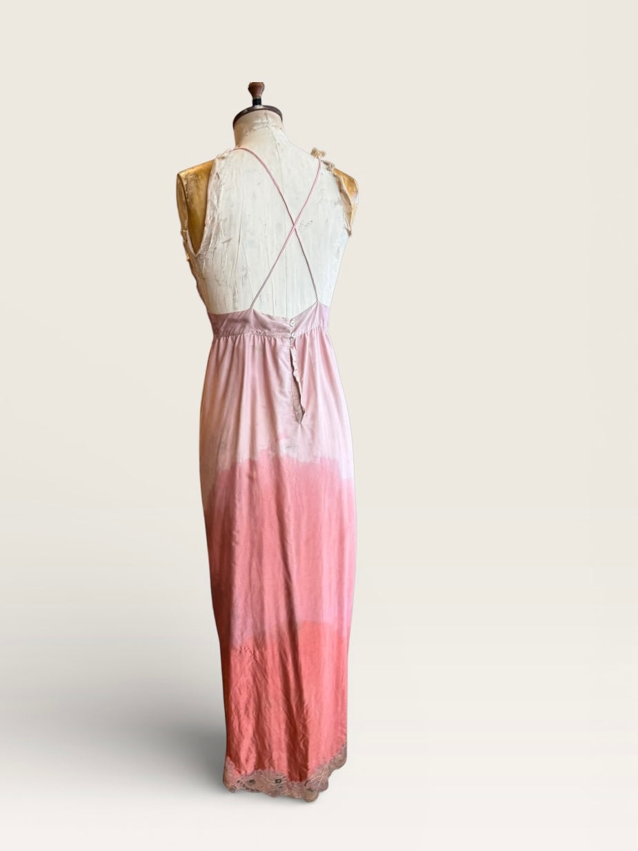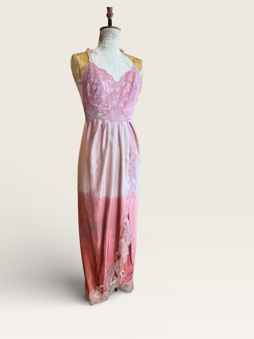 This original 1970s silk and lace slip dress features a delicate front lace V-neck and a petal design with lace trim hem. The hand-dyed ombré effect in pink and terracotta ensures a unique earthy yet feminine aesthetic, making it an exceptional addition to any vintage collection. Its composition provides comfort and luxury while enhancing style versatility. Has back buttons for a neat fit.
