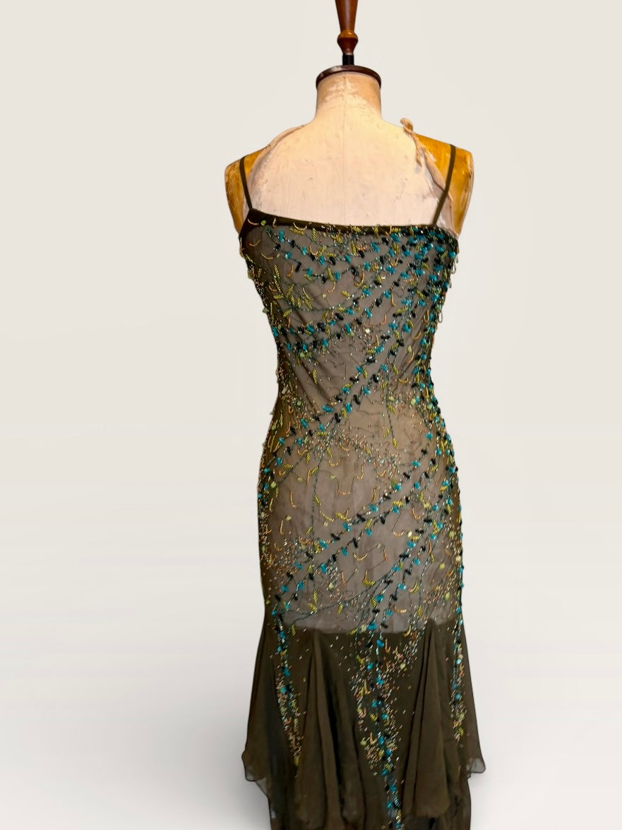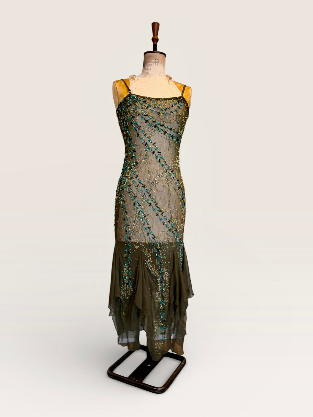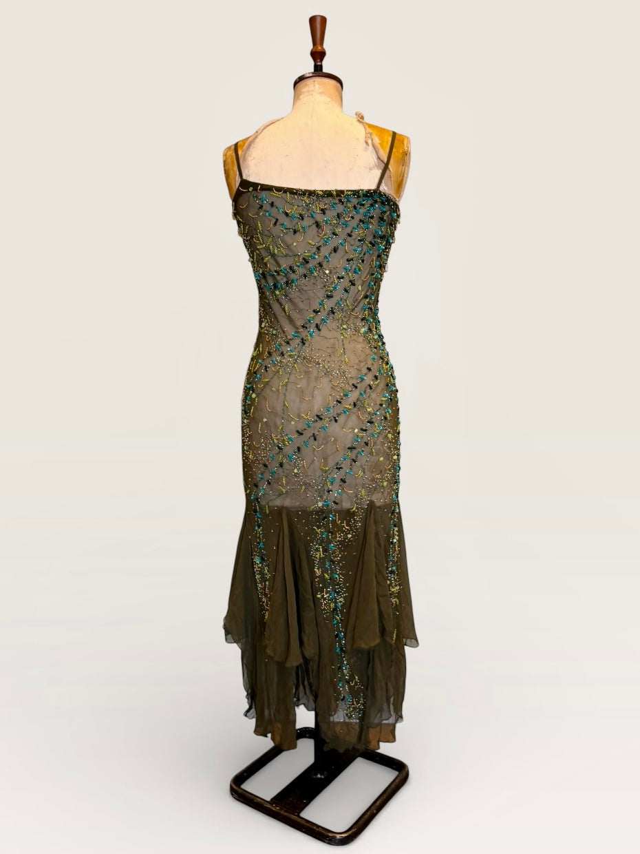 Introducing a mesmerising 90s original, crafted from sumptuous kaki chiffon silk that falls elegantly to embrace the form. The delicate thin straps and enchanting iridescent beading shimmers across the body and ends in delicate chiffon handkerchiefs , imbuing a sense of opulence. This exquisite creation, designed with a discreet side zip, is a celebration of timeless design.