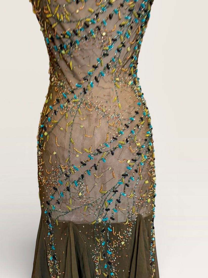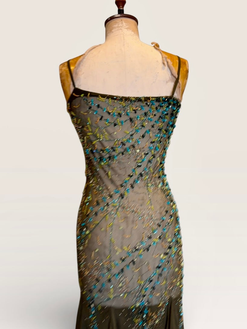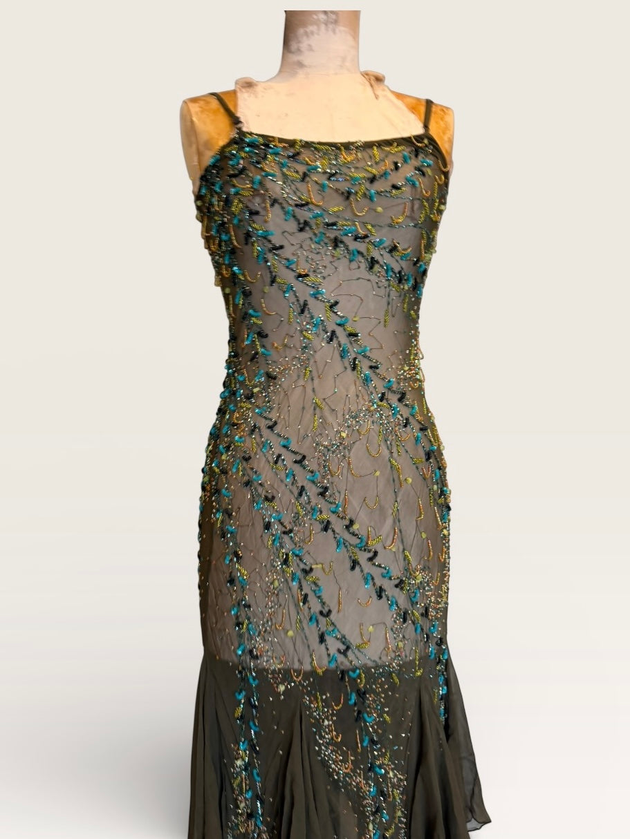 Introducing a mesmerising 90s original, crafted from sumptuous kaki chiffon silk that falls elegantly to embrace the form. The delicate thin straps and enchanting iridescent beading shimmers across the body and ends in delicate chiffon handkerchiefs , imbuing a sense of opulence. This exquisite creation, designed with a discreet side zip, is a celebration of timeless design.