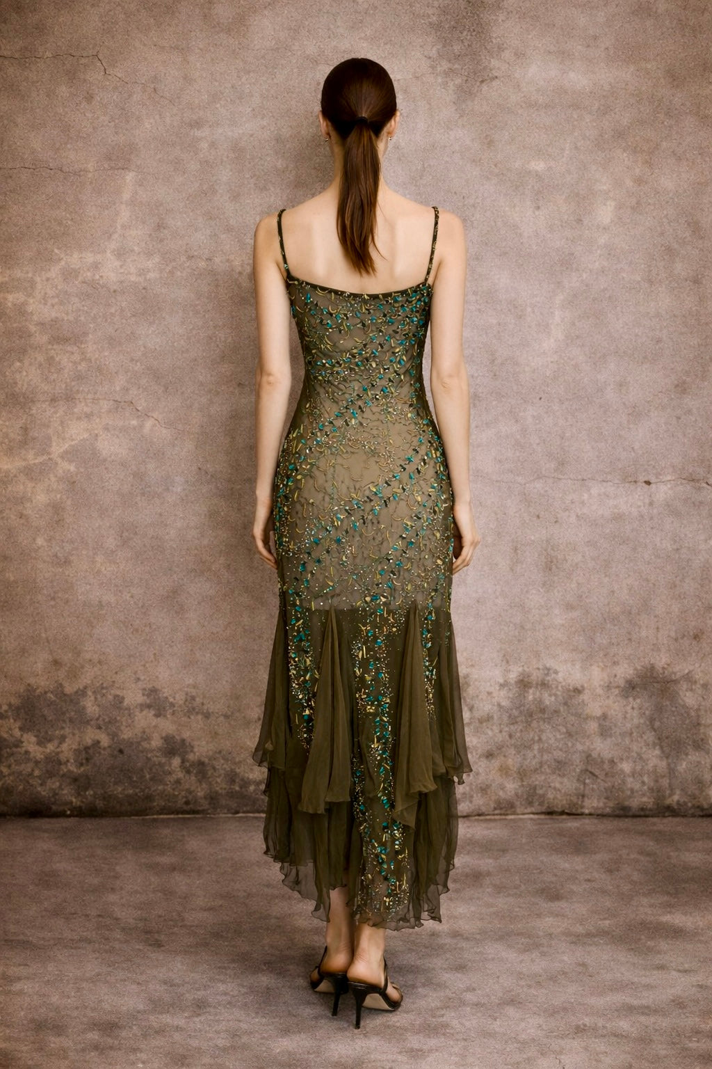 Tory, 90s beaded kaki green bias cut chiffon handkerchief dress