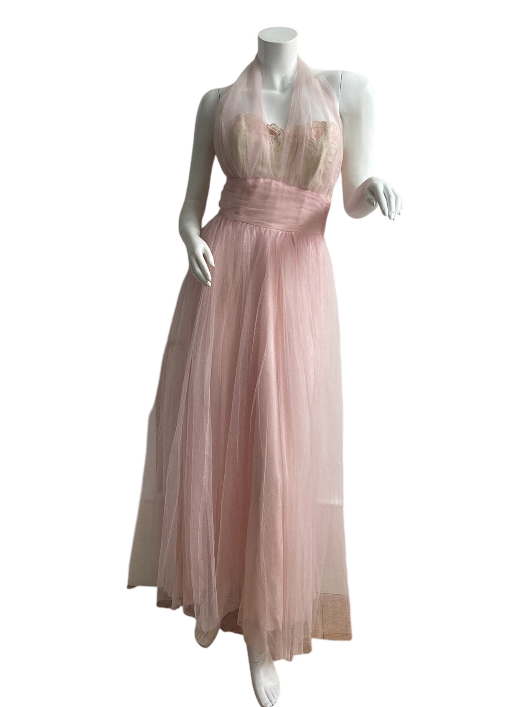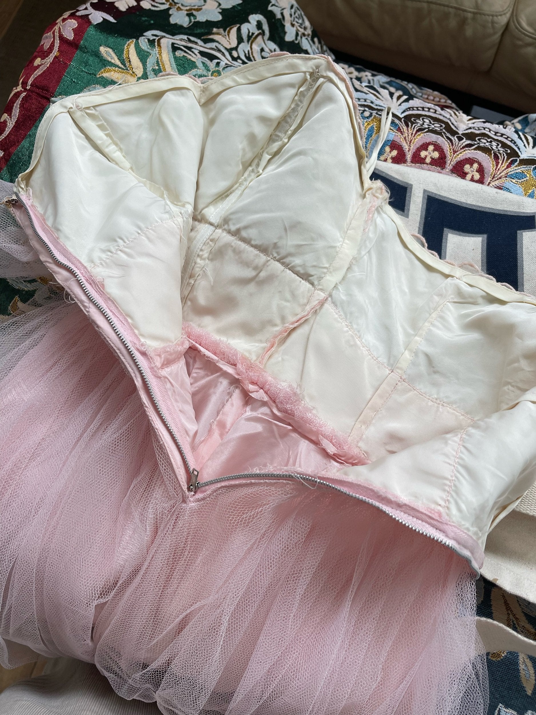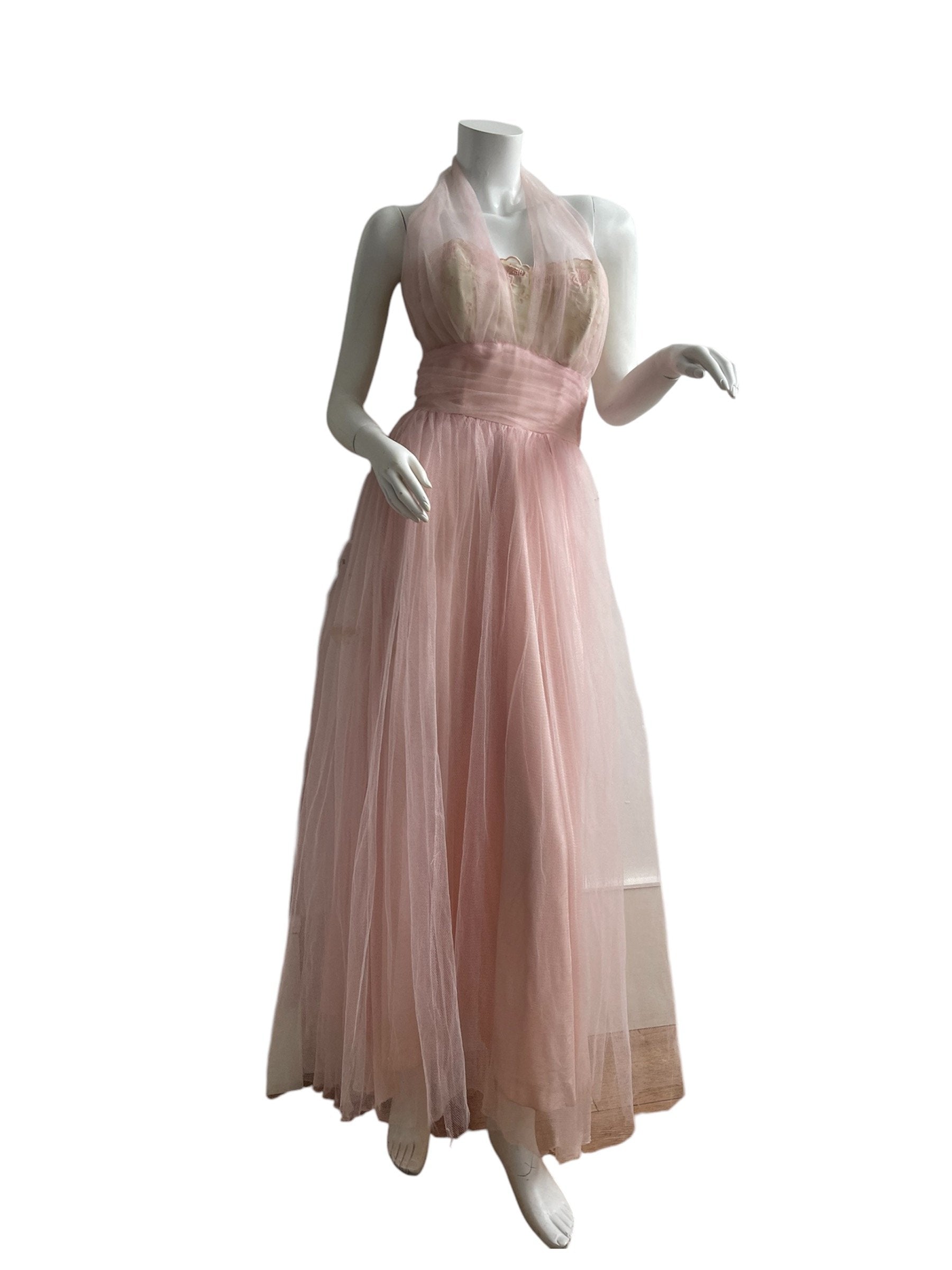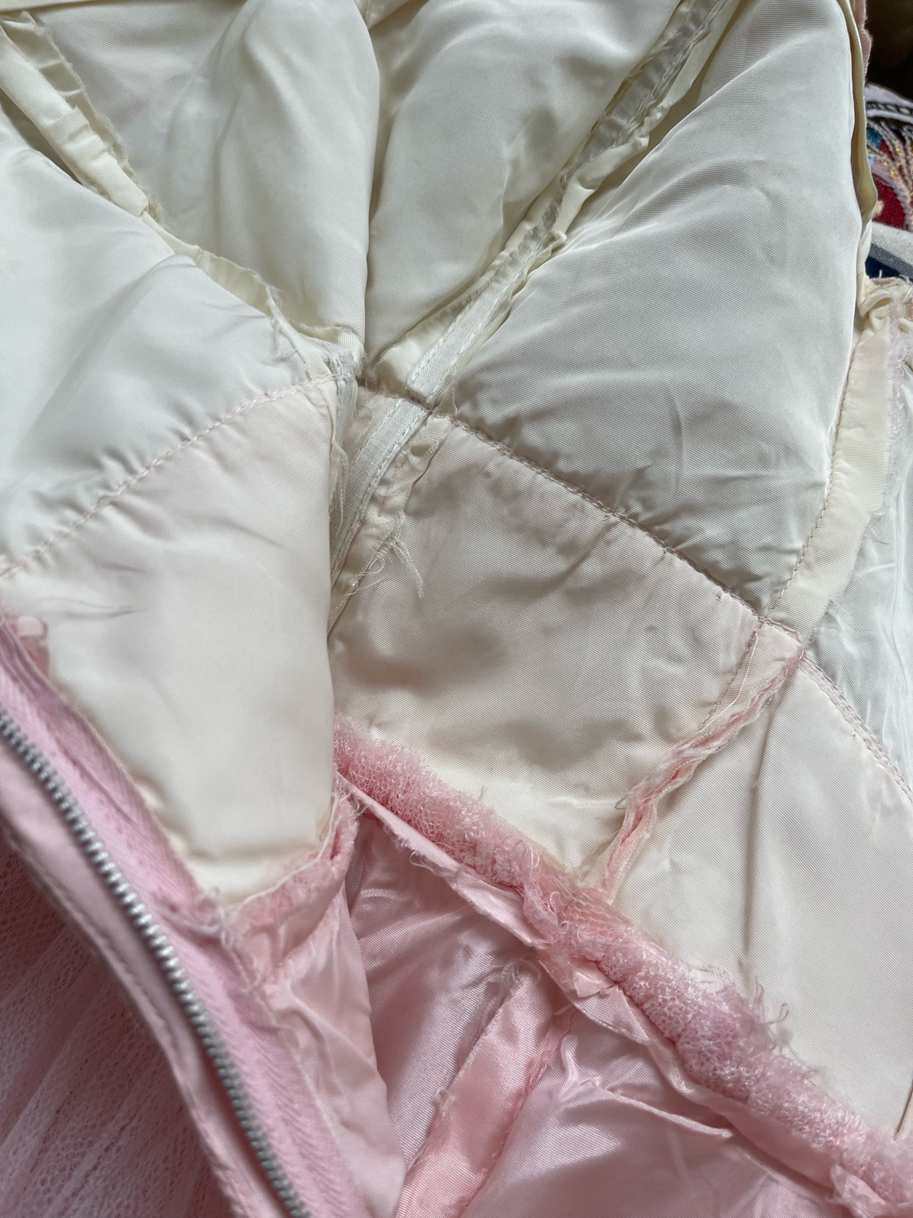 This original vintage 1950s gown is a stunning example of timeless elegance, perfect for any vintage lover or collector. In a UK size 12, this pink and cream beauty features a flattering corseted bodice that accentuates the waist, with layers of delicate tulle creating a romantic, princess-like silhouette. Though it has been gently worn and shows a few marks, along with a minor repair needed on the netting, this gown remains a gorgeous and highly wearable piece.