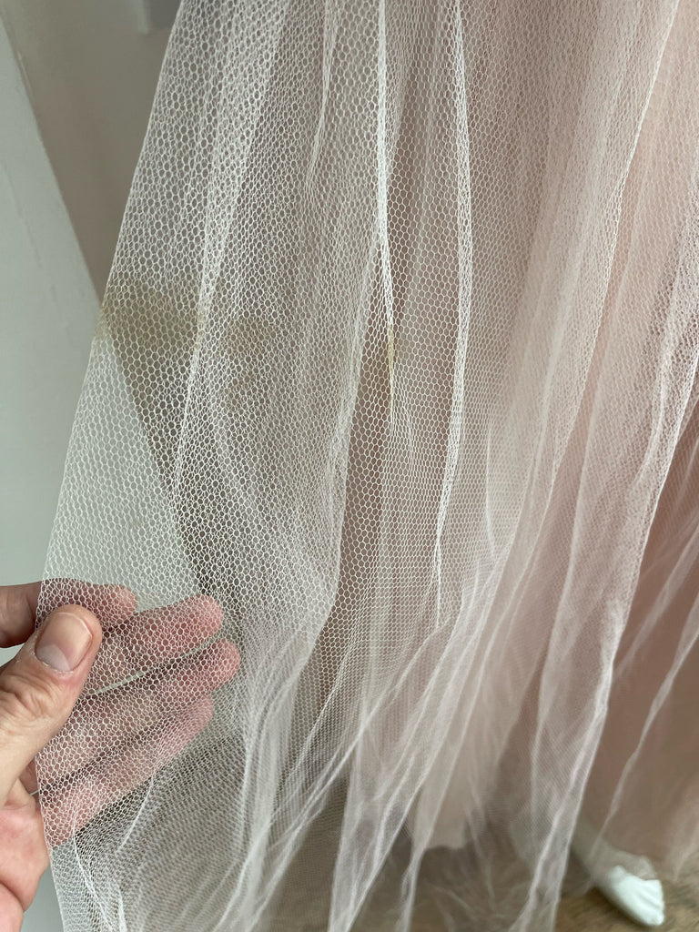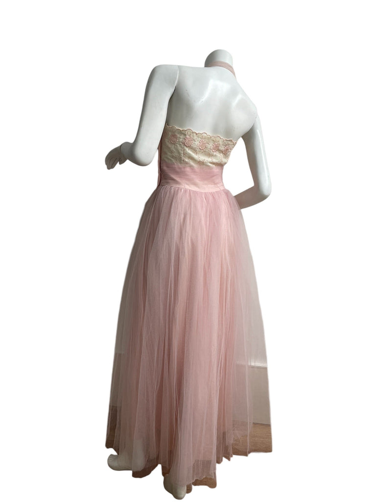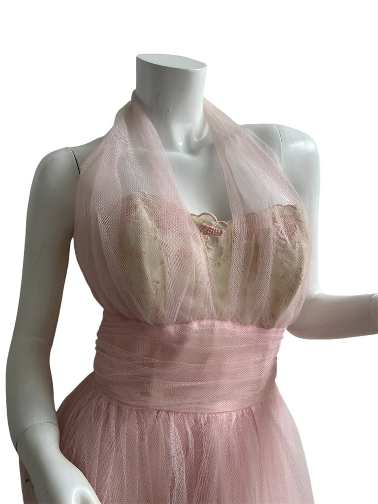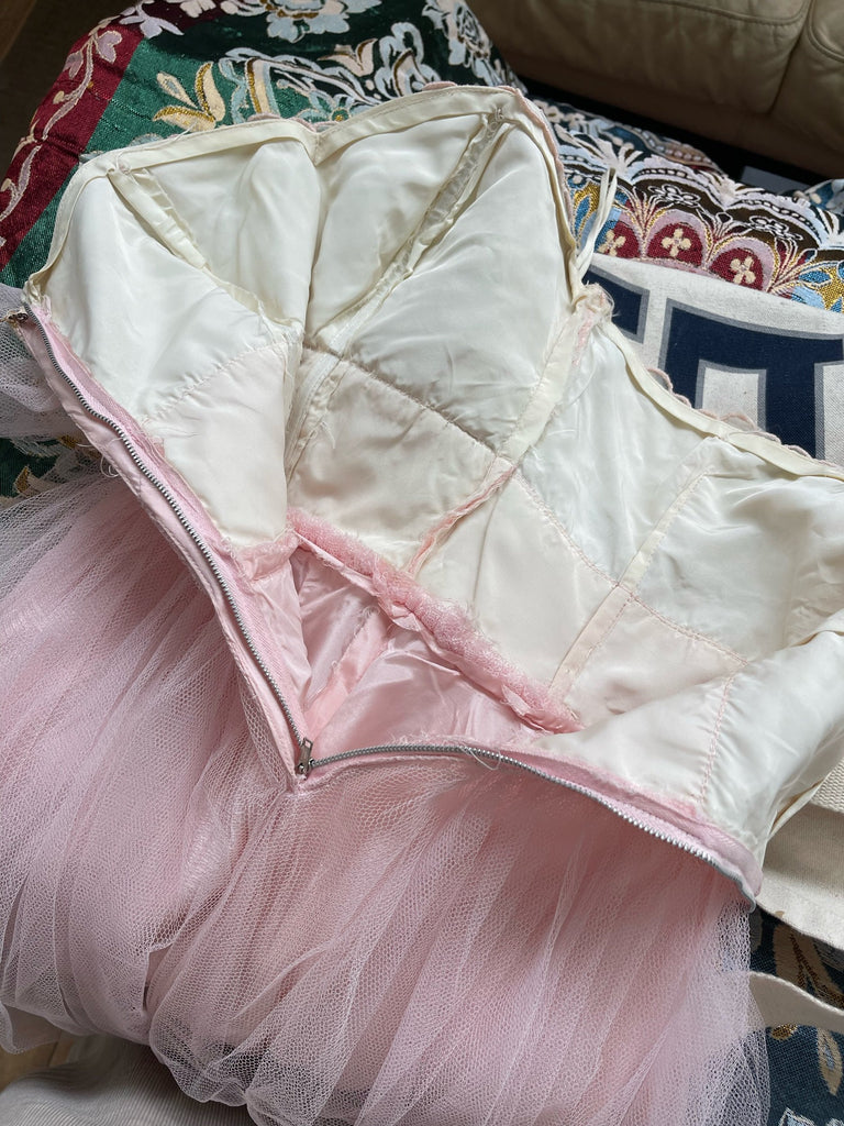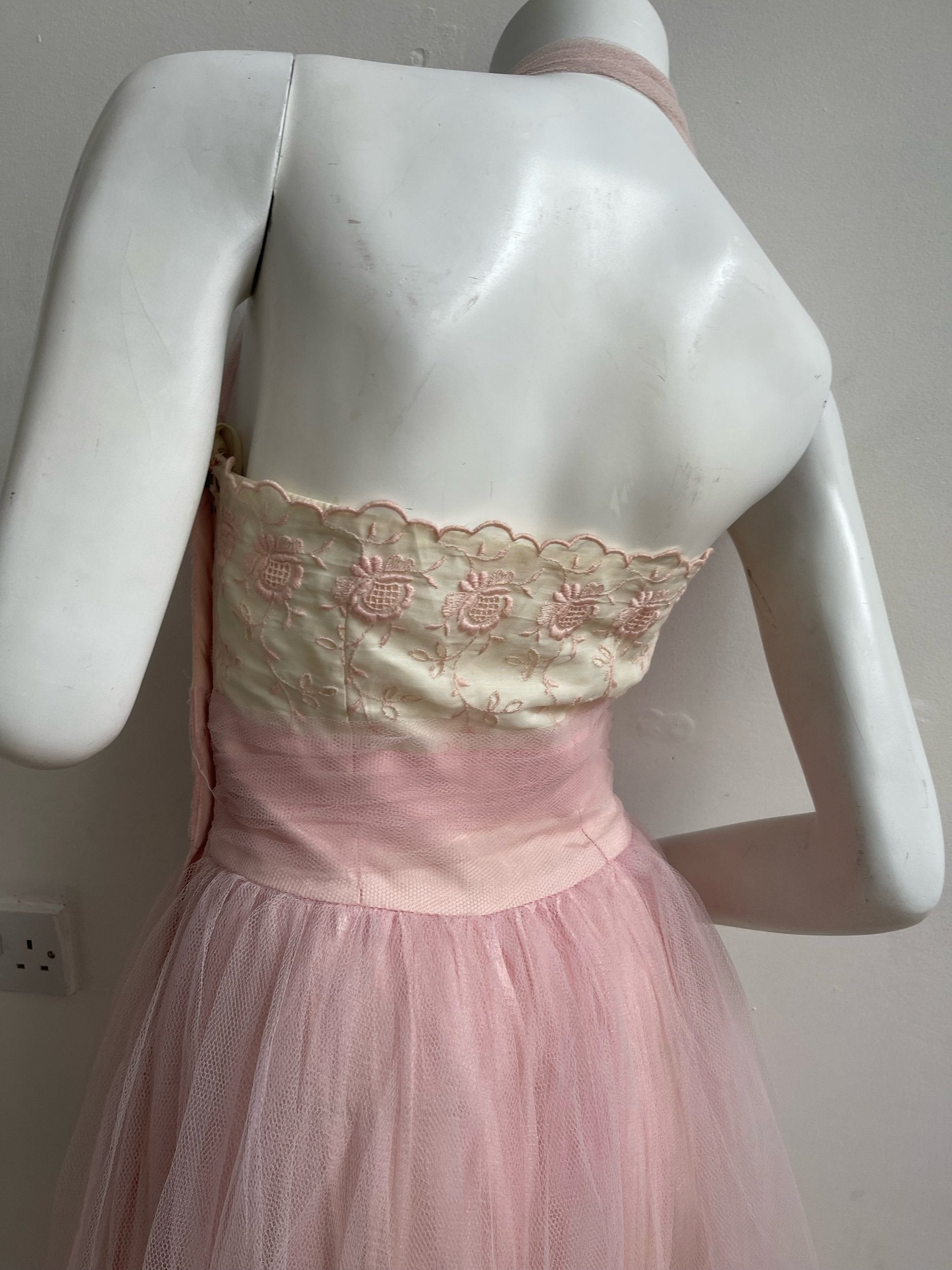 This original vintage 1950s gown is a stunning example of timeless elegance, perfect for any vintage lover or collector. In a UK size 12, this pink and cream beauty features a flattering corseted bodice that accentuates the waist, with layers of delicate tulle creating a romantic, princess-like silhouette. Though it has been gently worn and shows a few marks, along with a minor repair needed on the netting, this gown remains a gorgeous and highly wearable piece.