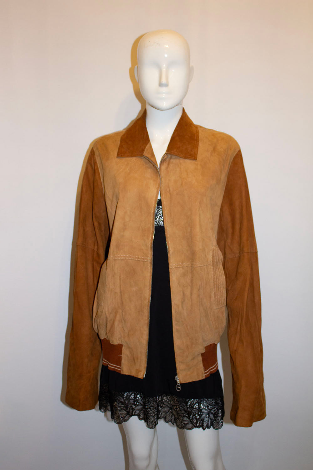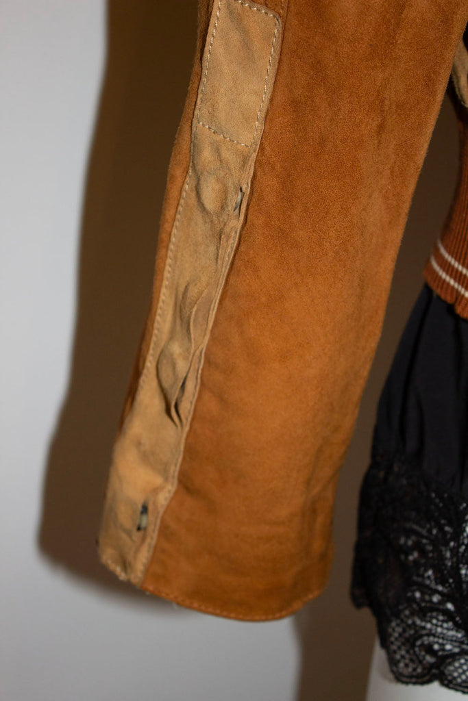 A headturning and super soft suede jacket by Italian house Trussardi . In a wonderful tan and brown colour mix , the jacket has a zip front , ribbing at the hem and button detail along the sleaves. It has two pockets on the front  and is fully lined.
