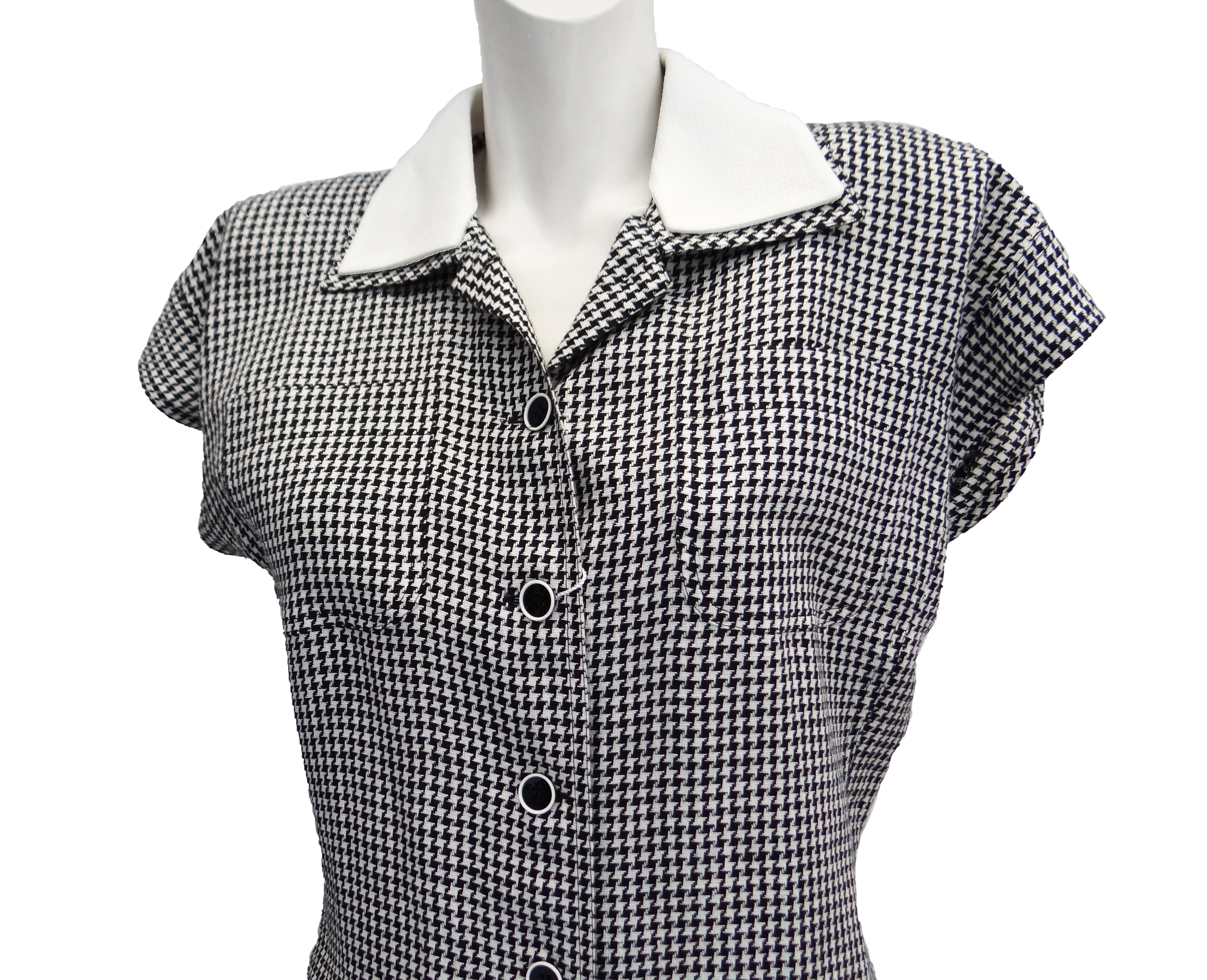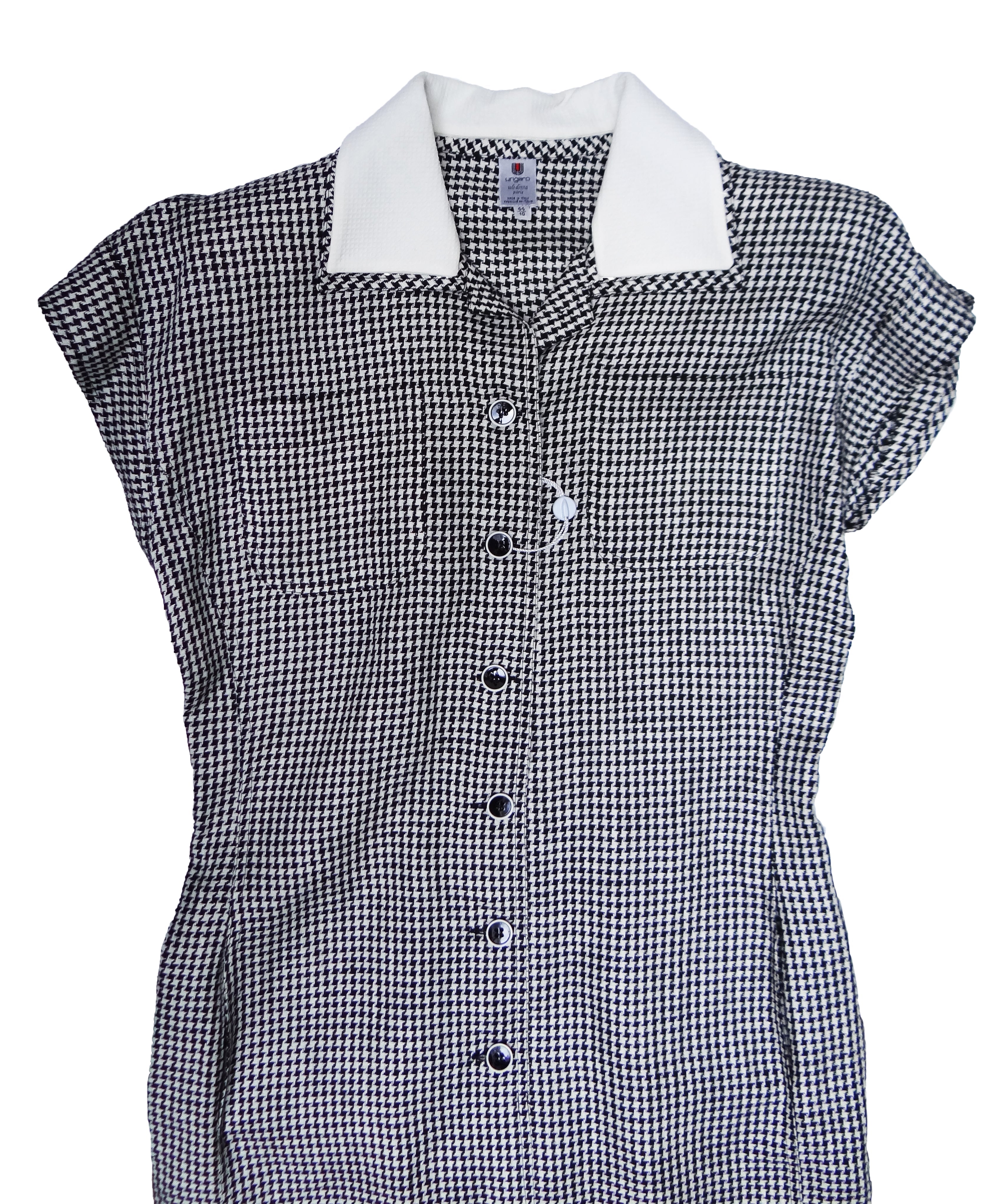 The dress is knee length, straight cut with small shoulder pads and cap sleeves. It has lovely black and white buttons down the front to the hips, and a spread collar with a second collar on top made of white pique cotton. Patch pockets to the bust and hidden side pockets. Unlined.