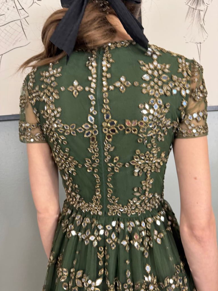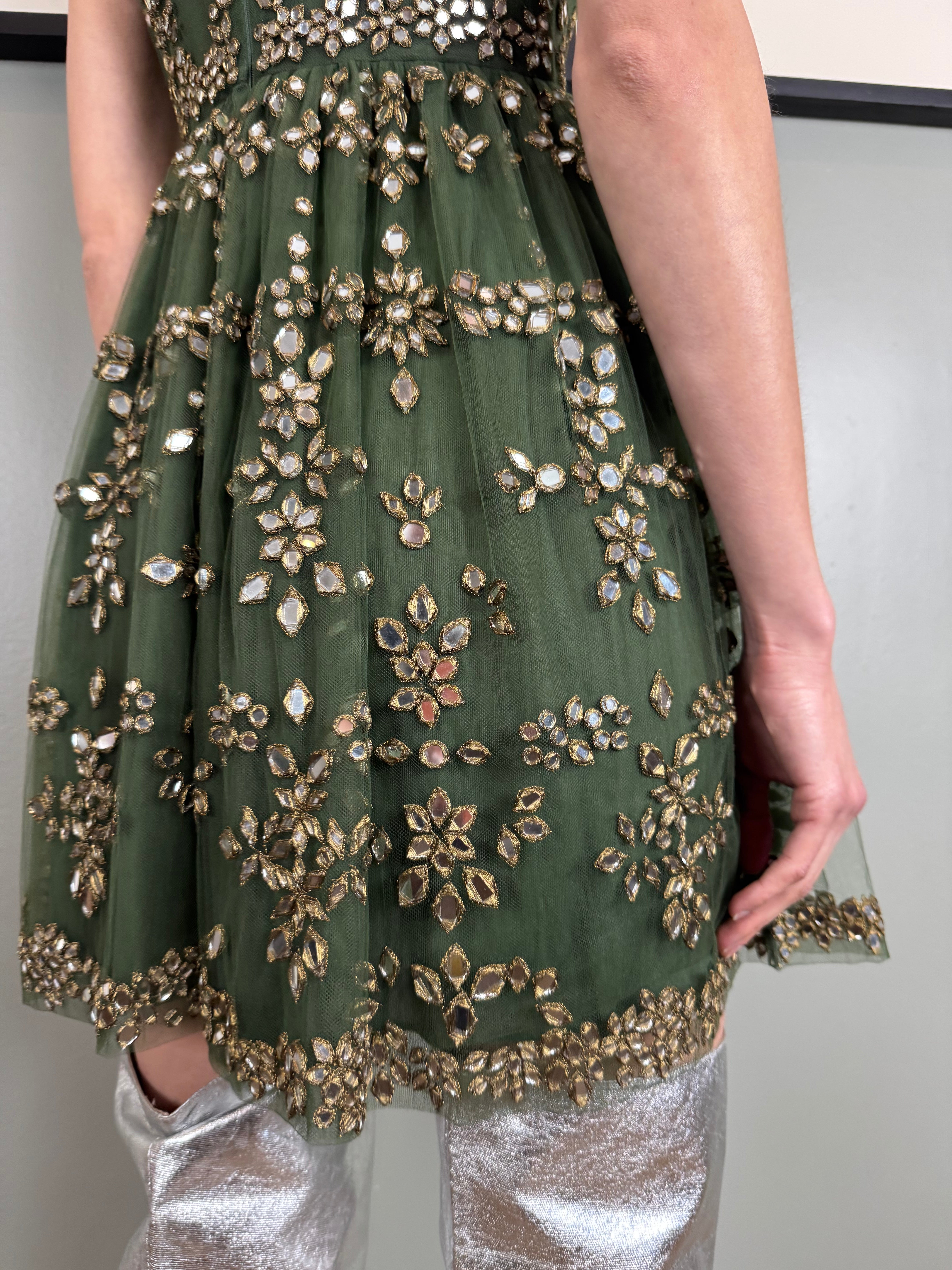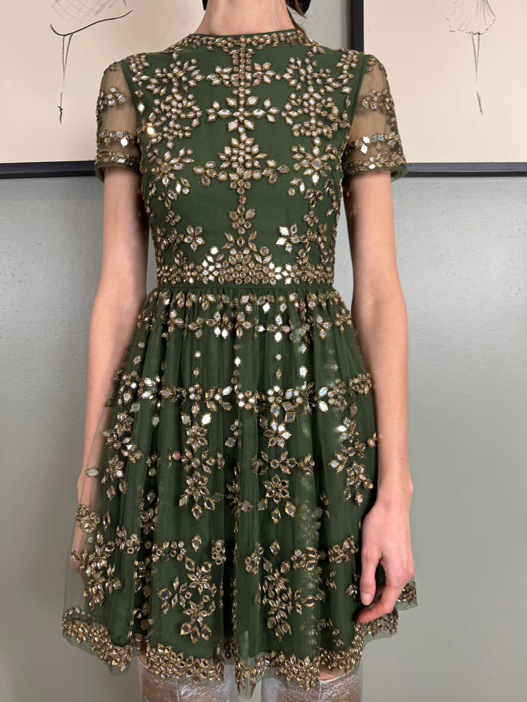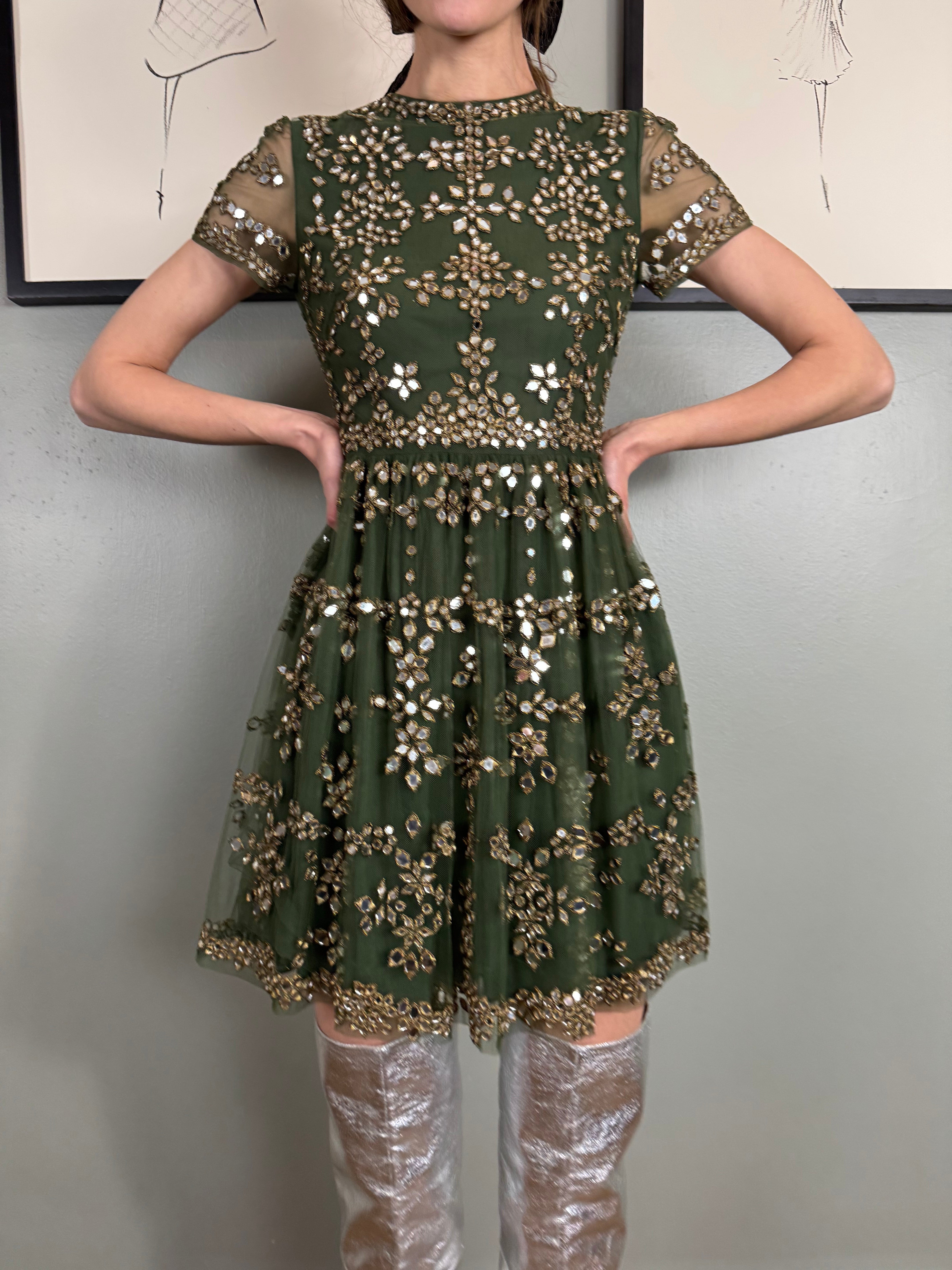 This unworn collectable Valentino by Piccioli’s creative runway dress is a rare find, featuring a baby doll silhouette, tulle fabric, and sparkling mirror embroidery throughout. With short sleeves and a full skirt, this dress is both playful and elegant. Don't miss the chance to own this unique piece from the 2019 collection.