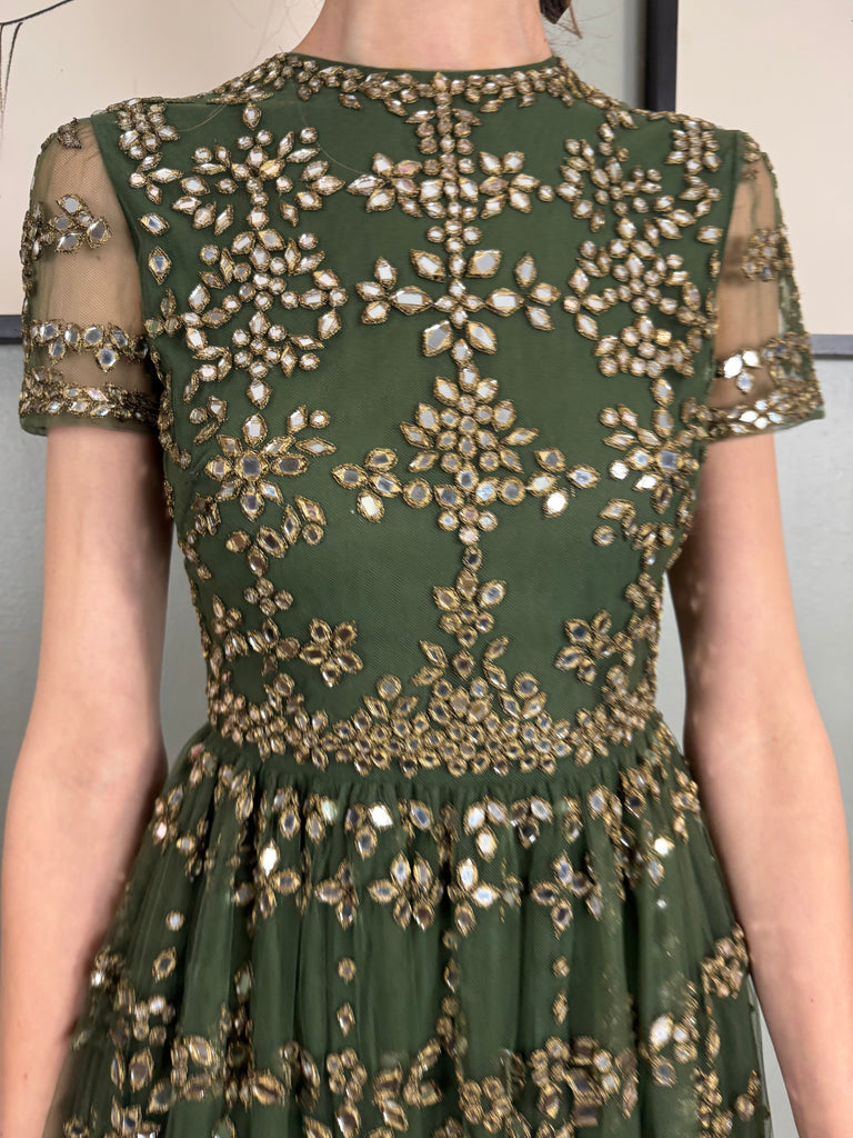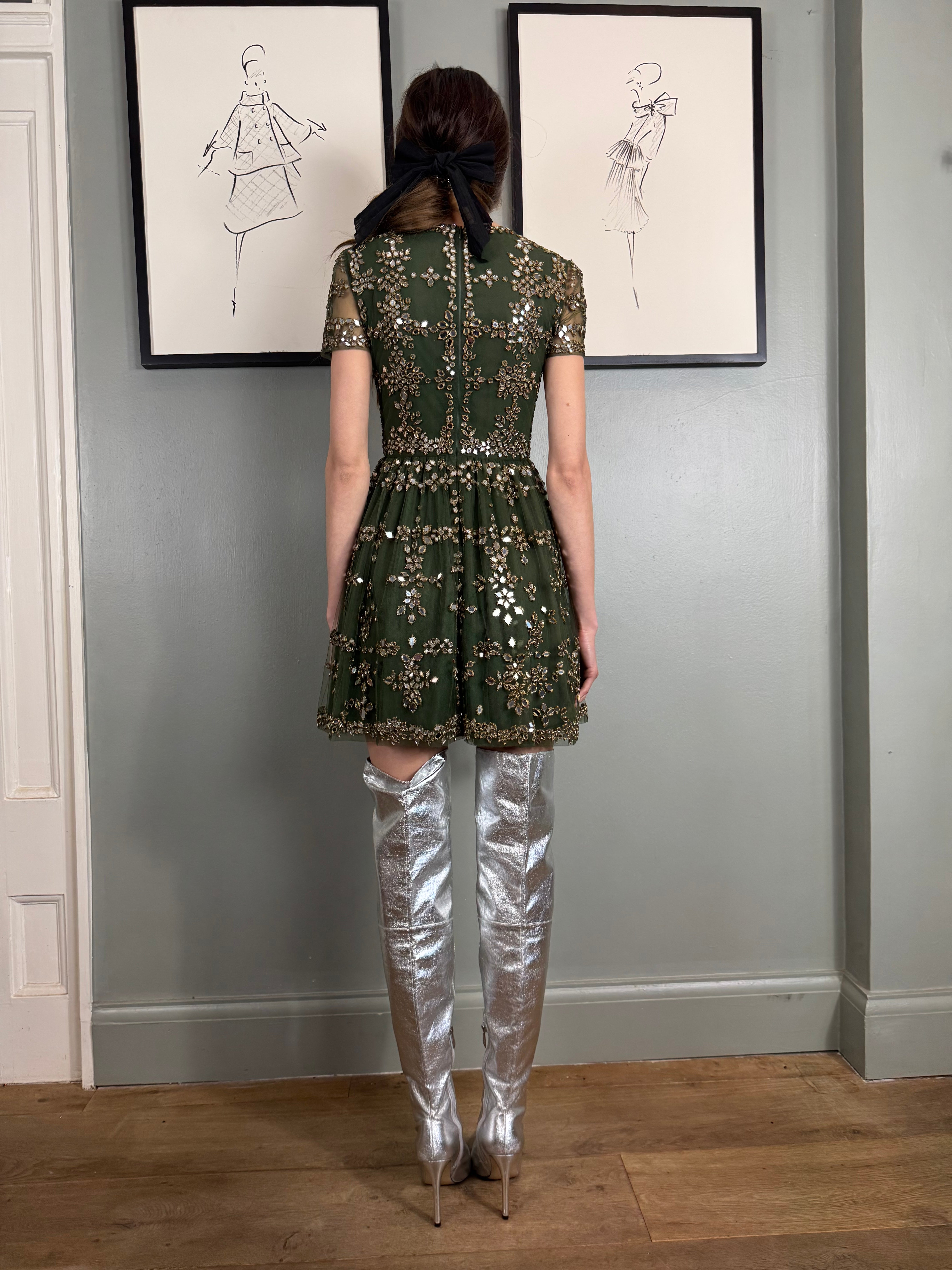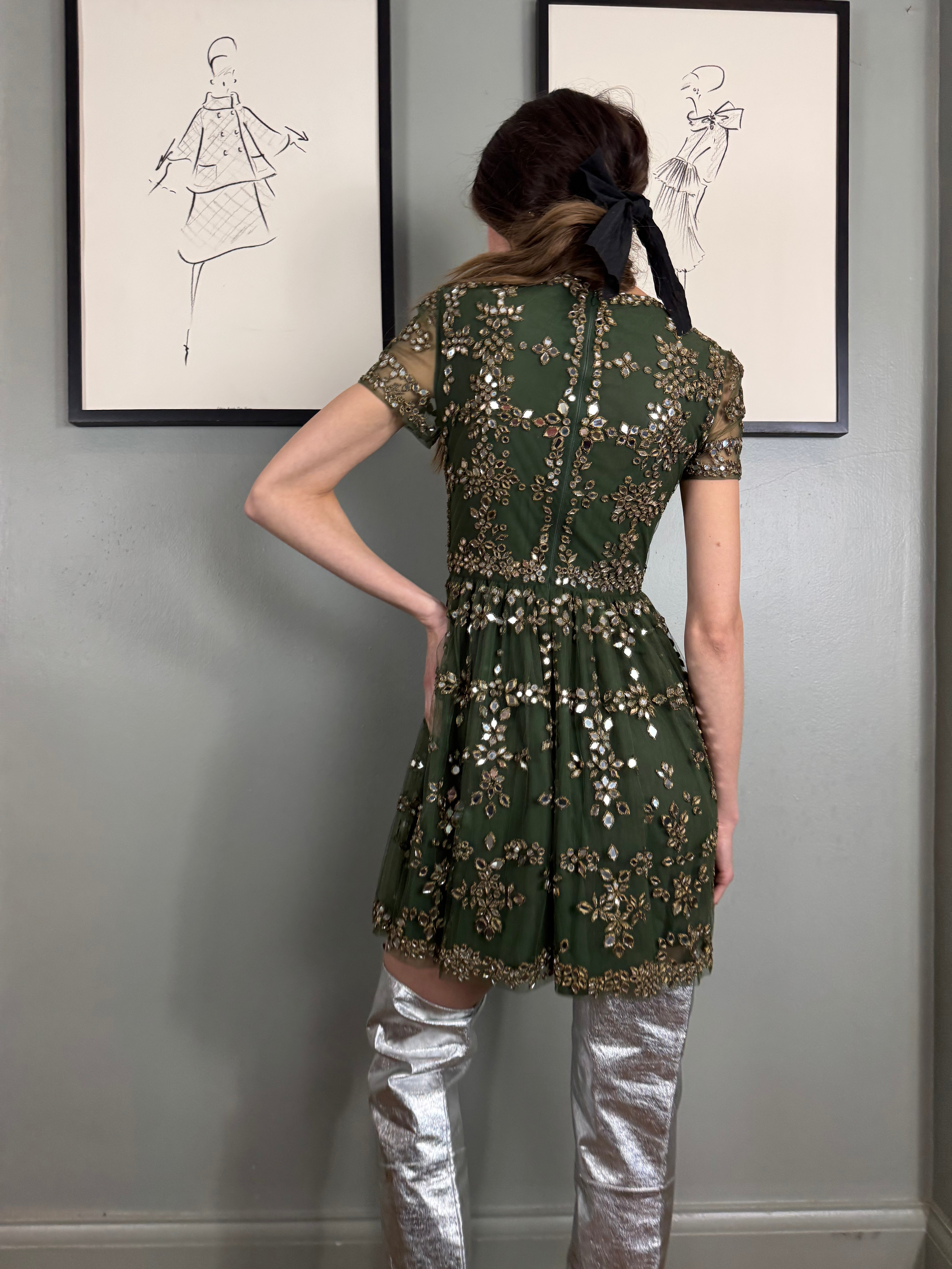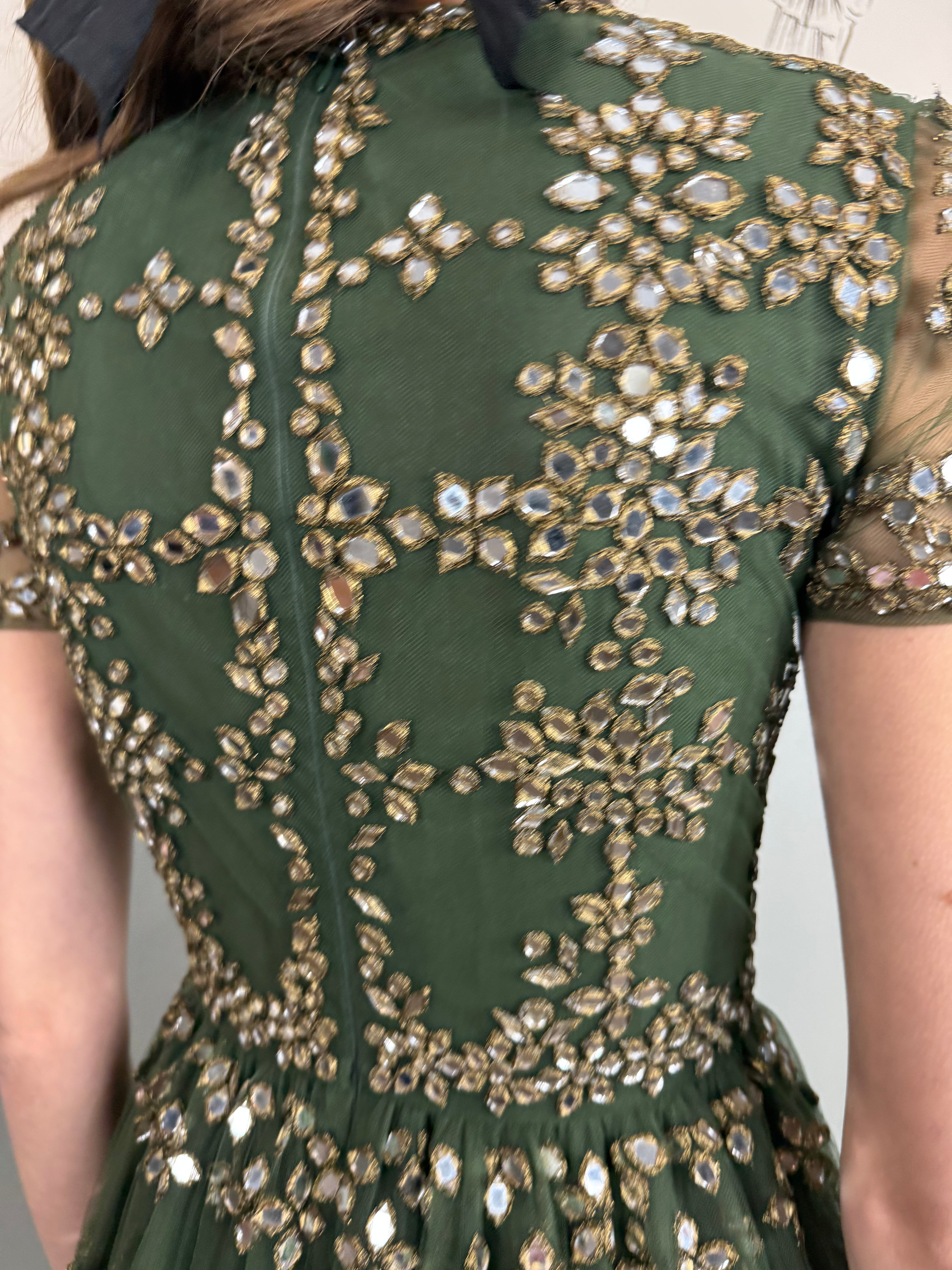 This unworn collectable Valentino by Piccioli’s creative runway dress is a rare find, featuring a baby doll silhouette, tulle fabric, and sparkling mirror embroidery throughout. With short sleeves and a full skirt, this dress is both playful and elegant. Don't miss the chance to own this unique piece from the 2019 collection.