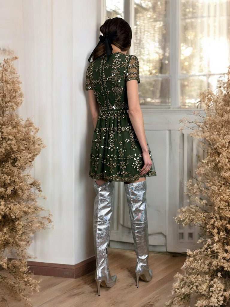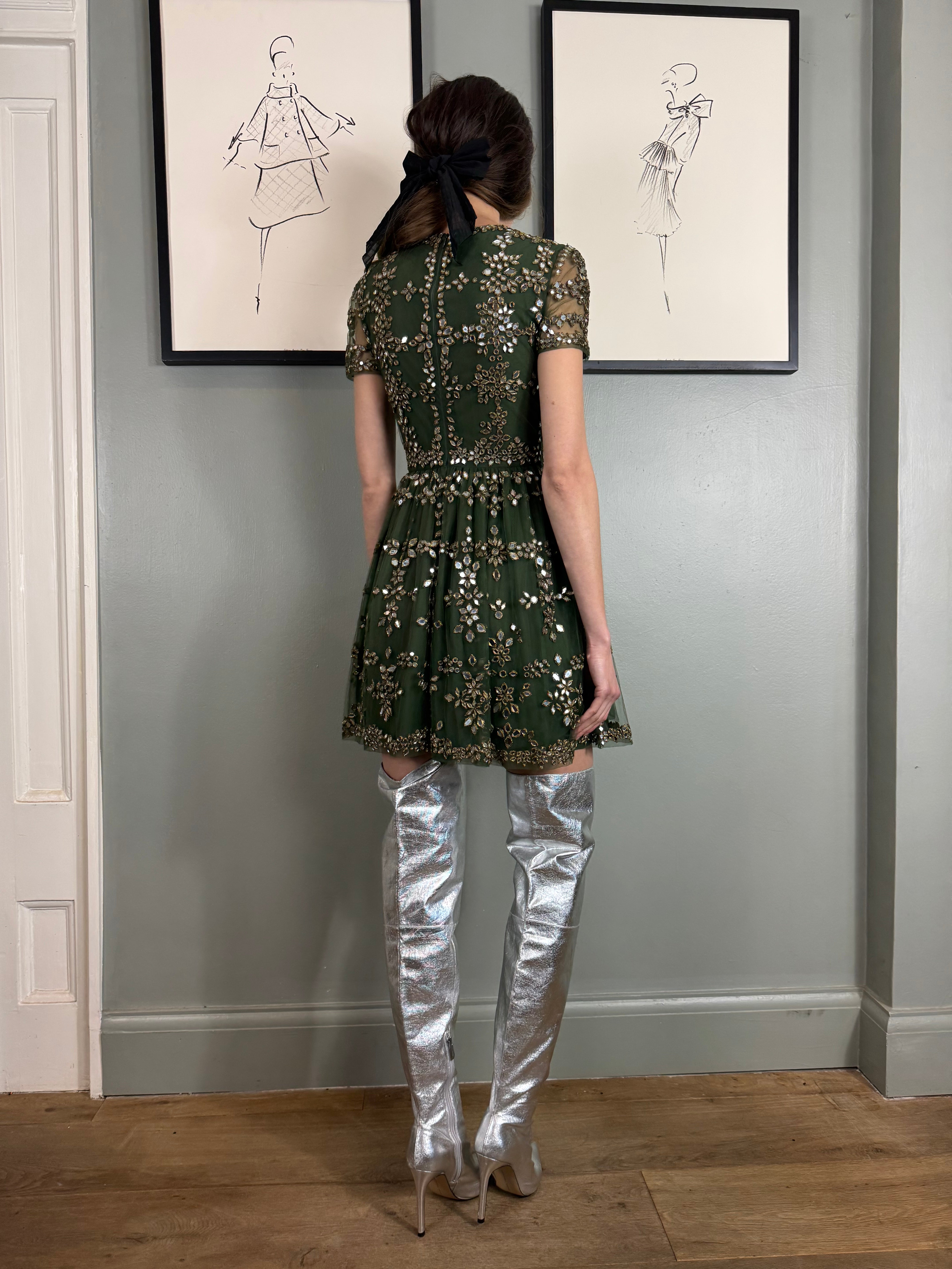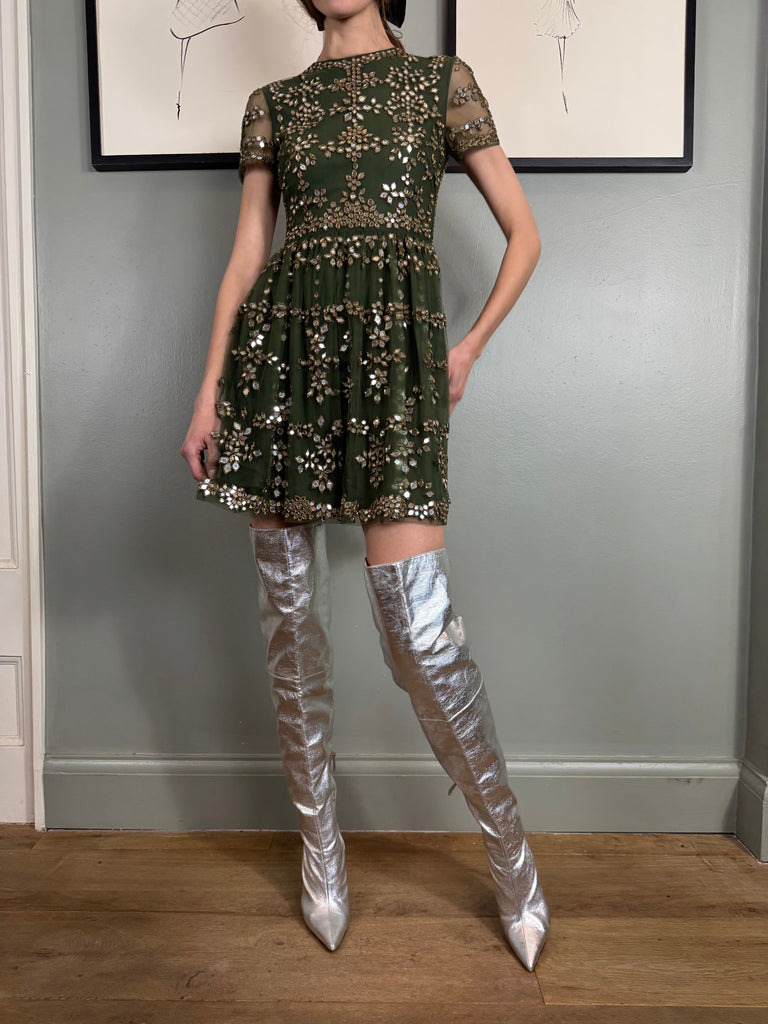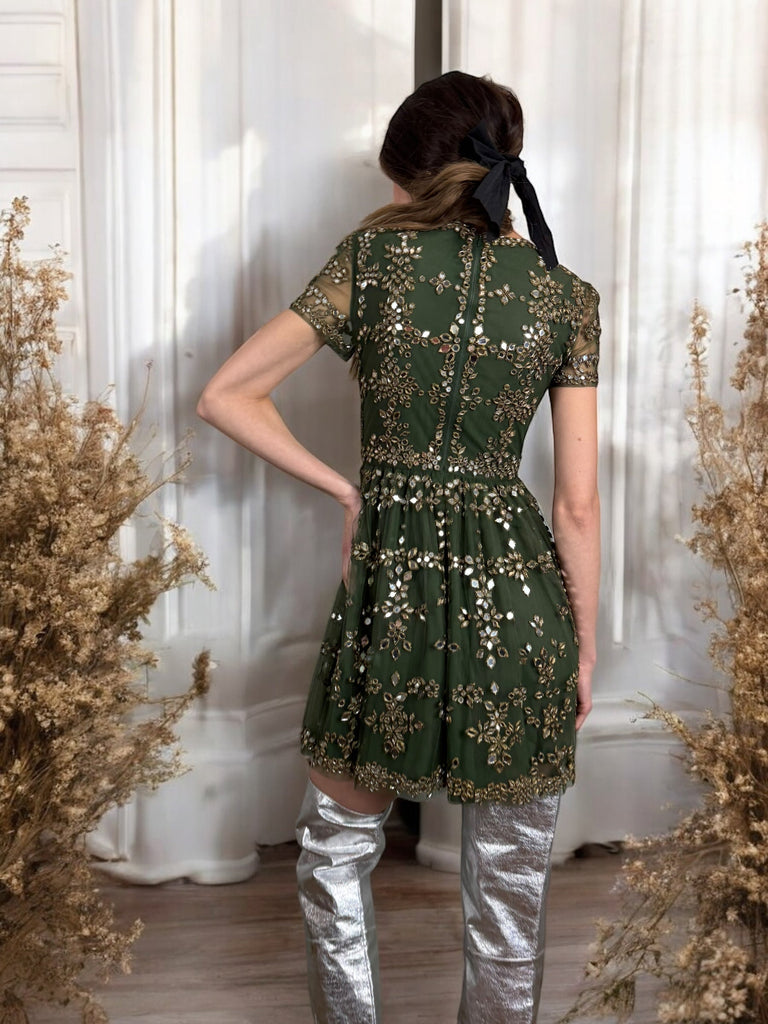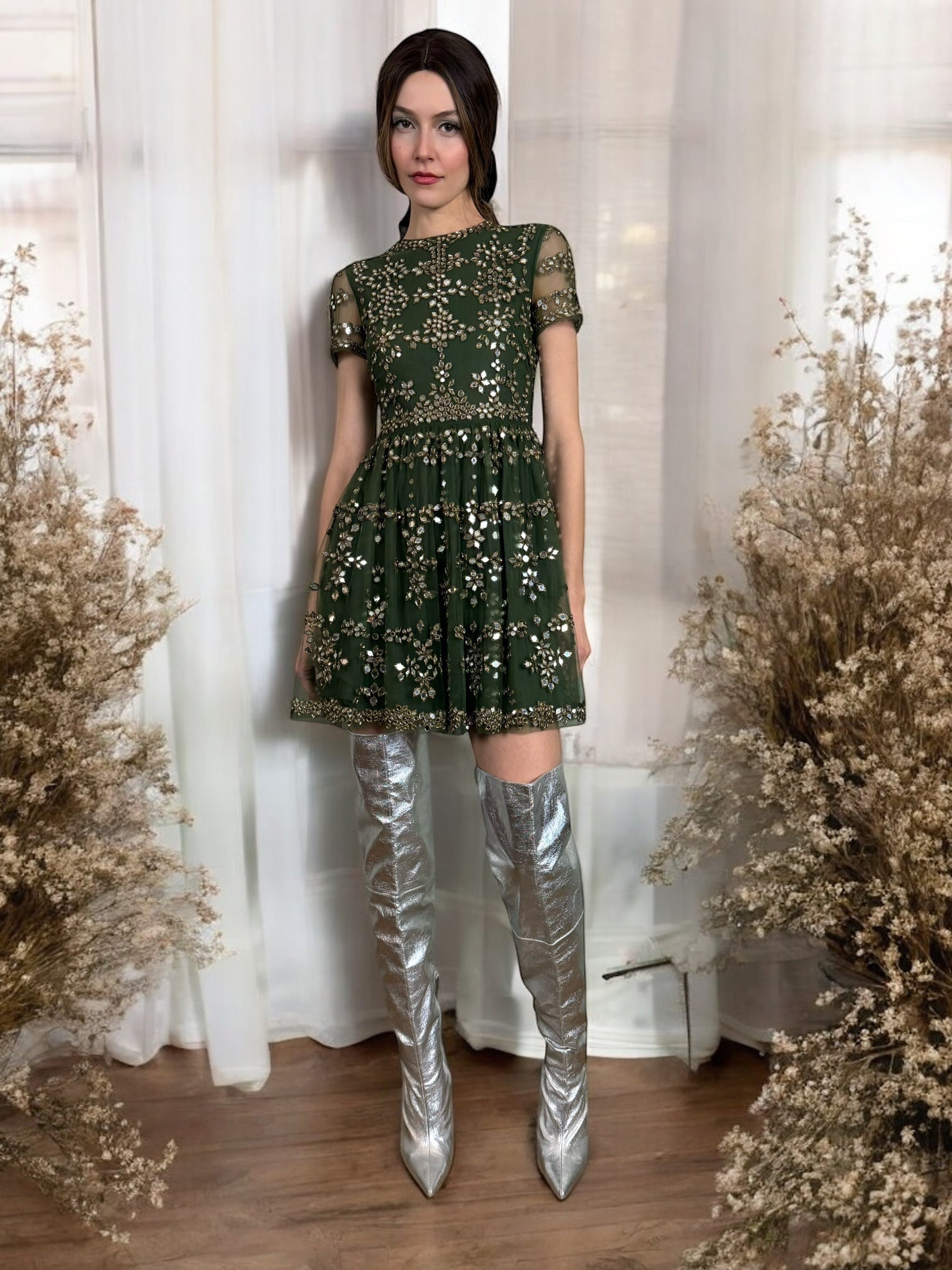 This unworn collectable Valentino by Piccioli’s creative runway dress is a rare find, featuring a baby doll silhouette, tulle fabric, and sparkling mirror embroidery throughout. With short sleeves and a full skirt, this dress is both playful and elegant. Don't miss the chance to own this unique piece from the 2019 collection.