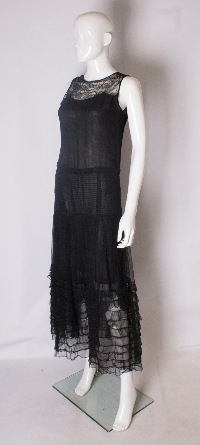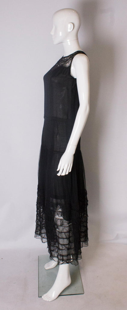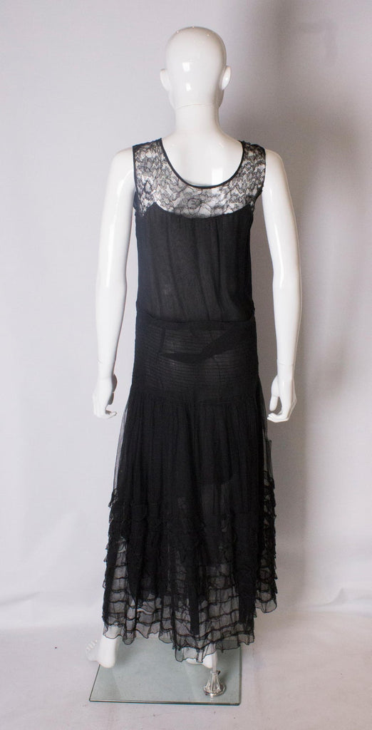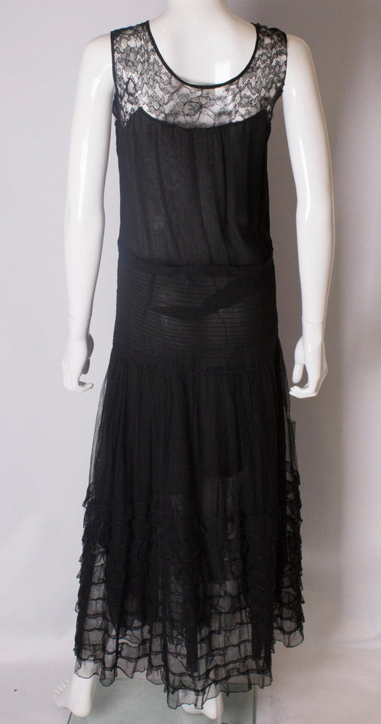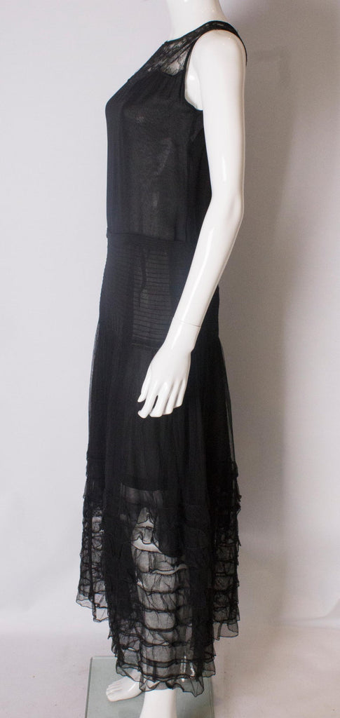 A pretty evening gown from the 1920s. The dress is sleeveless, with a lace bodice, horizontal ribbing at the hips and ruffles at the hem. It is fully lined.