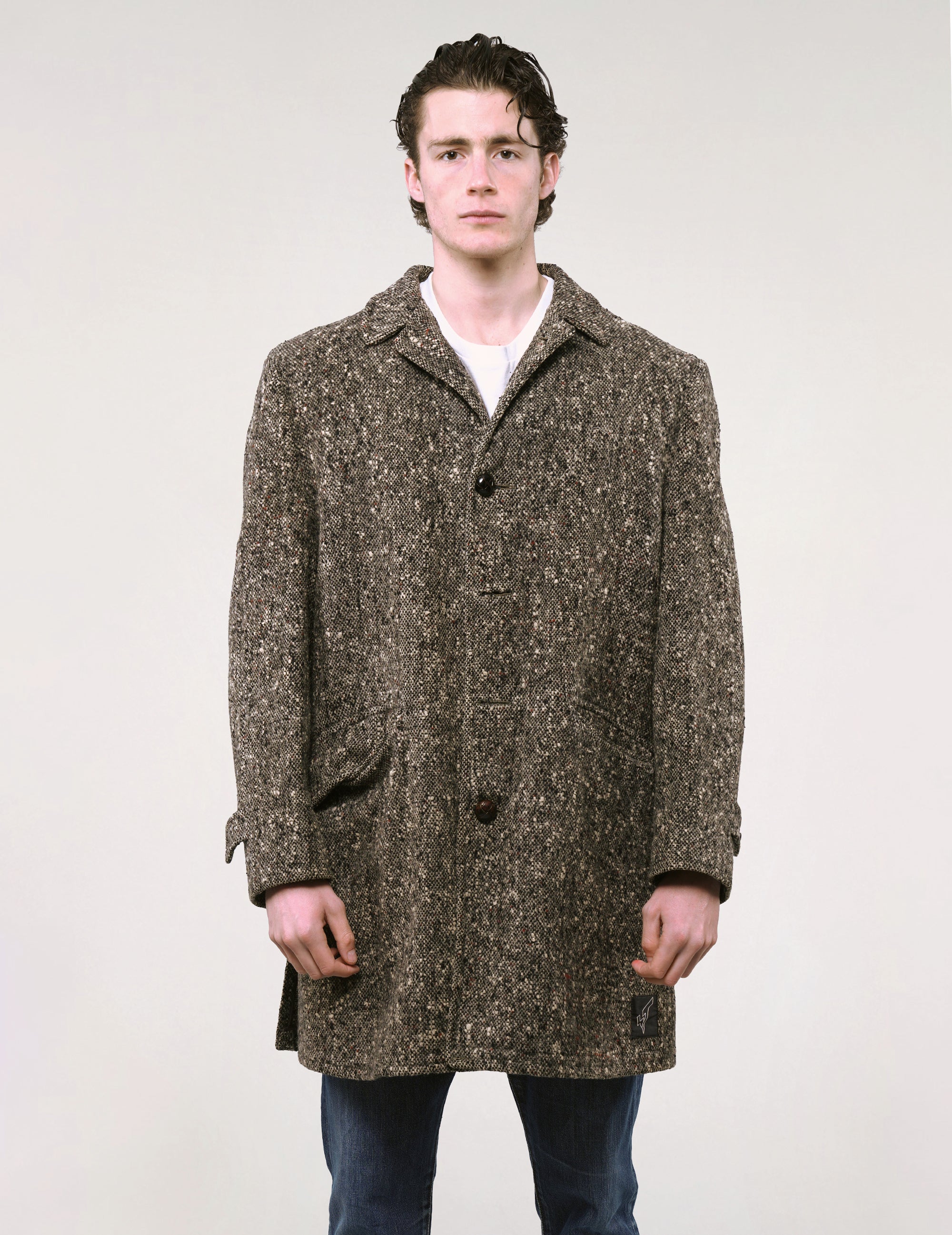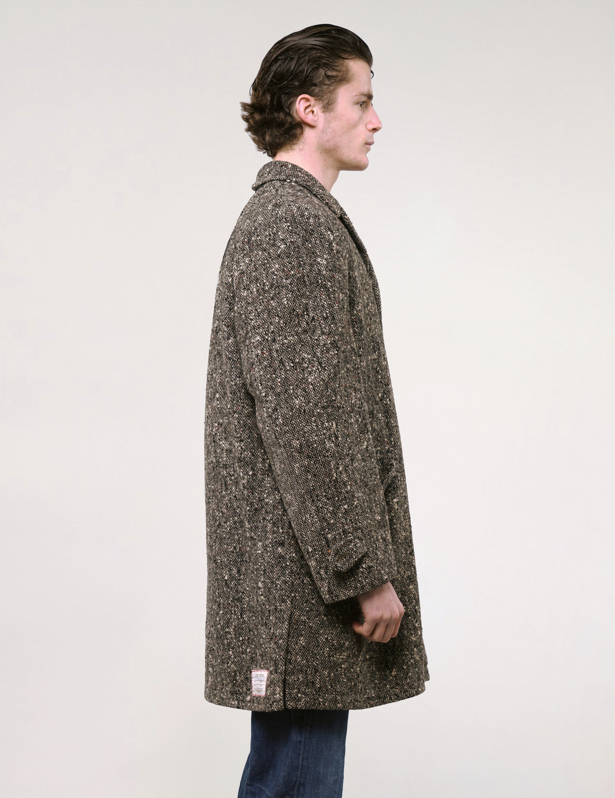 Vintage 1950s USA McGregor tweed frock coat with a shirt collar. Handcrafted in USA from exclusive Italian recycled woollen mixed tweed and lined with beautiful rayon twill inside with striped sleeve lining. A one off collectible vintage piece!