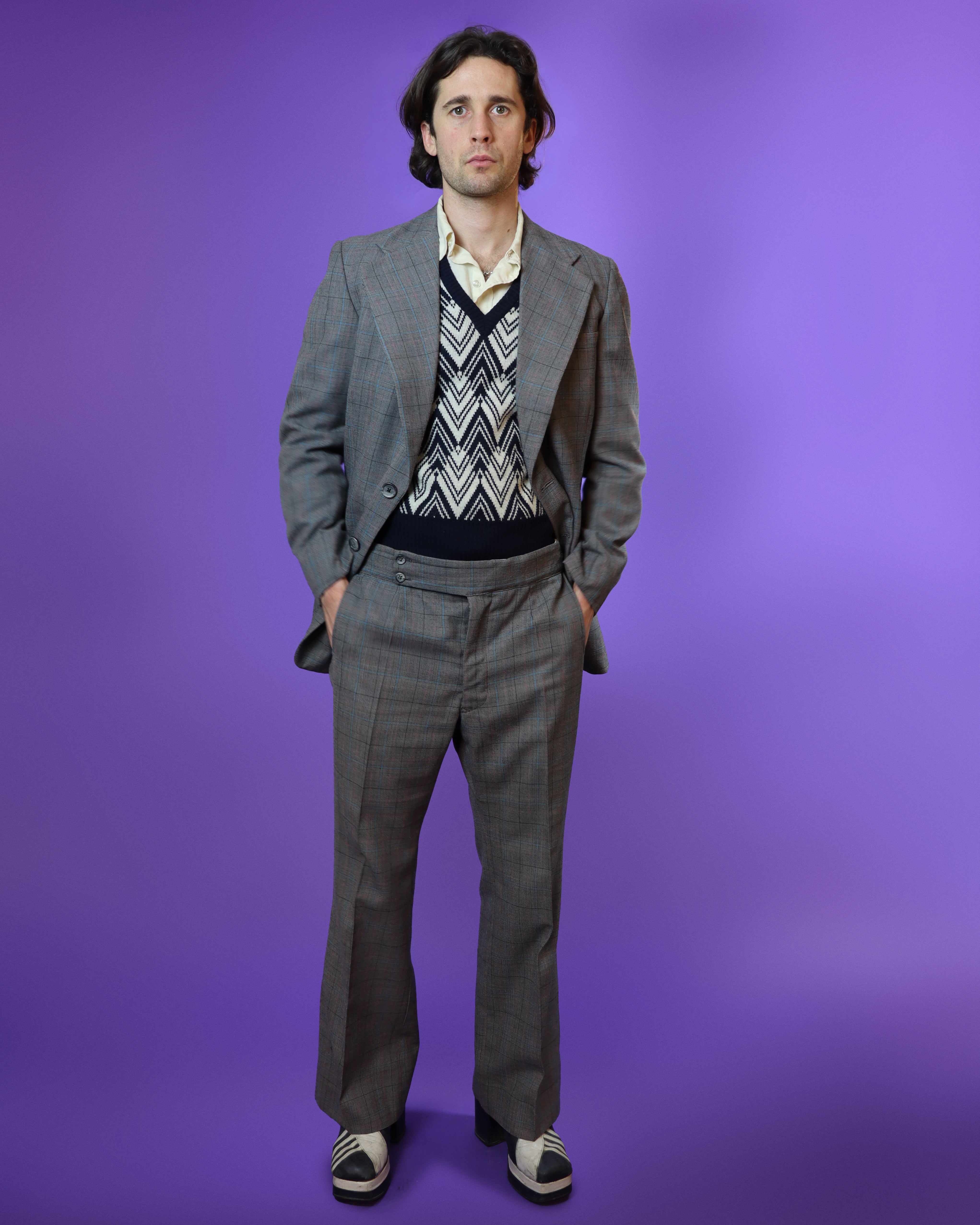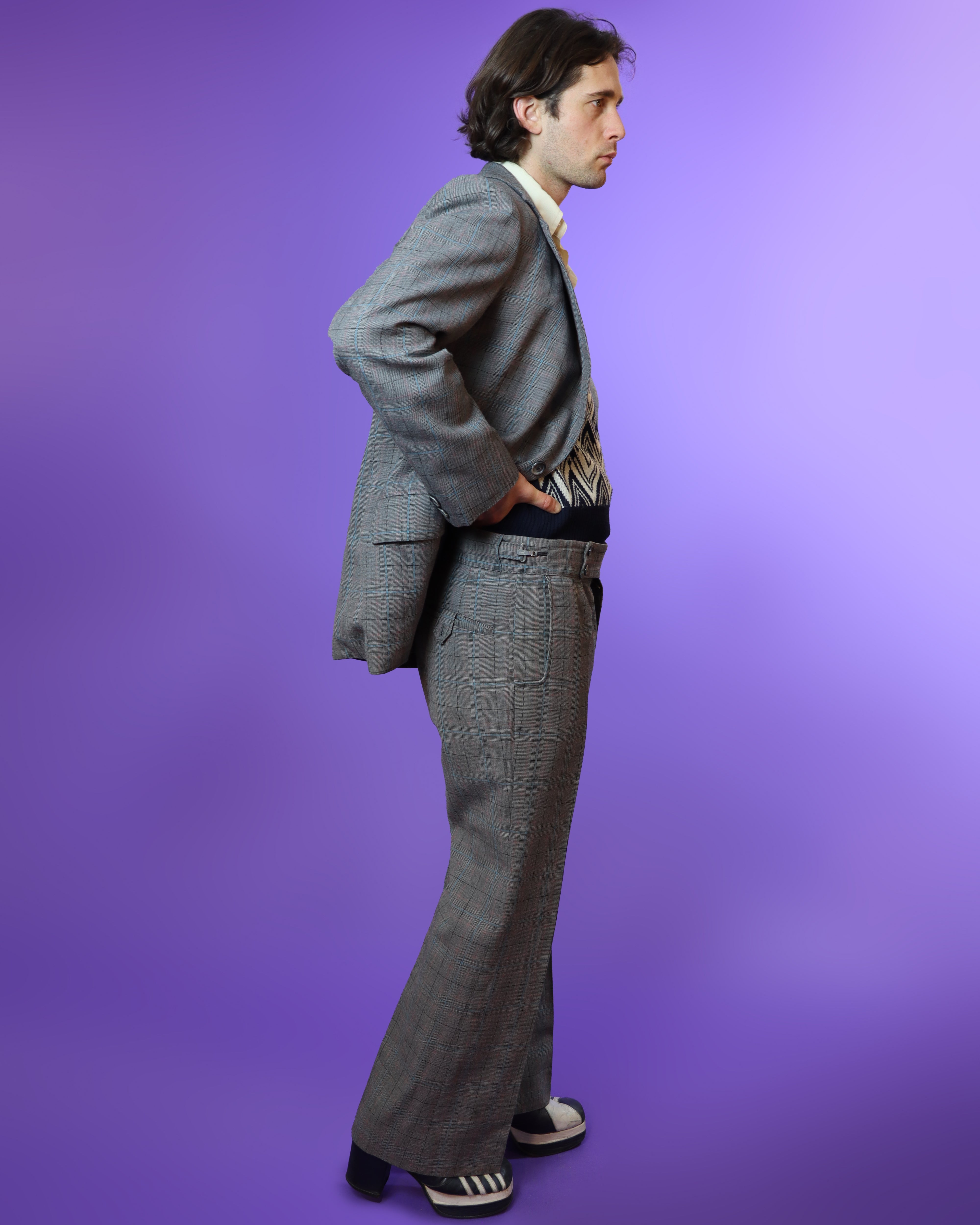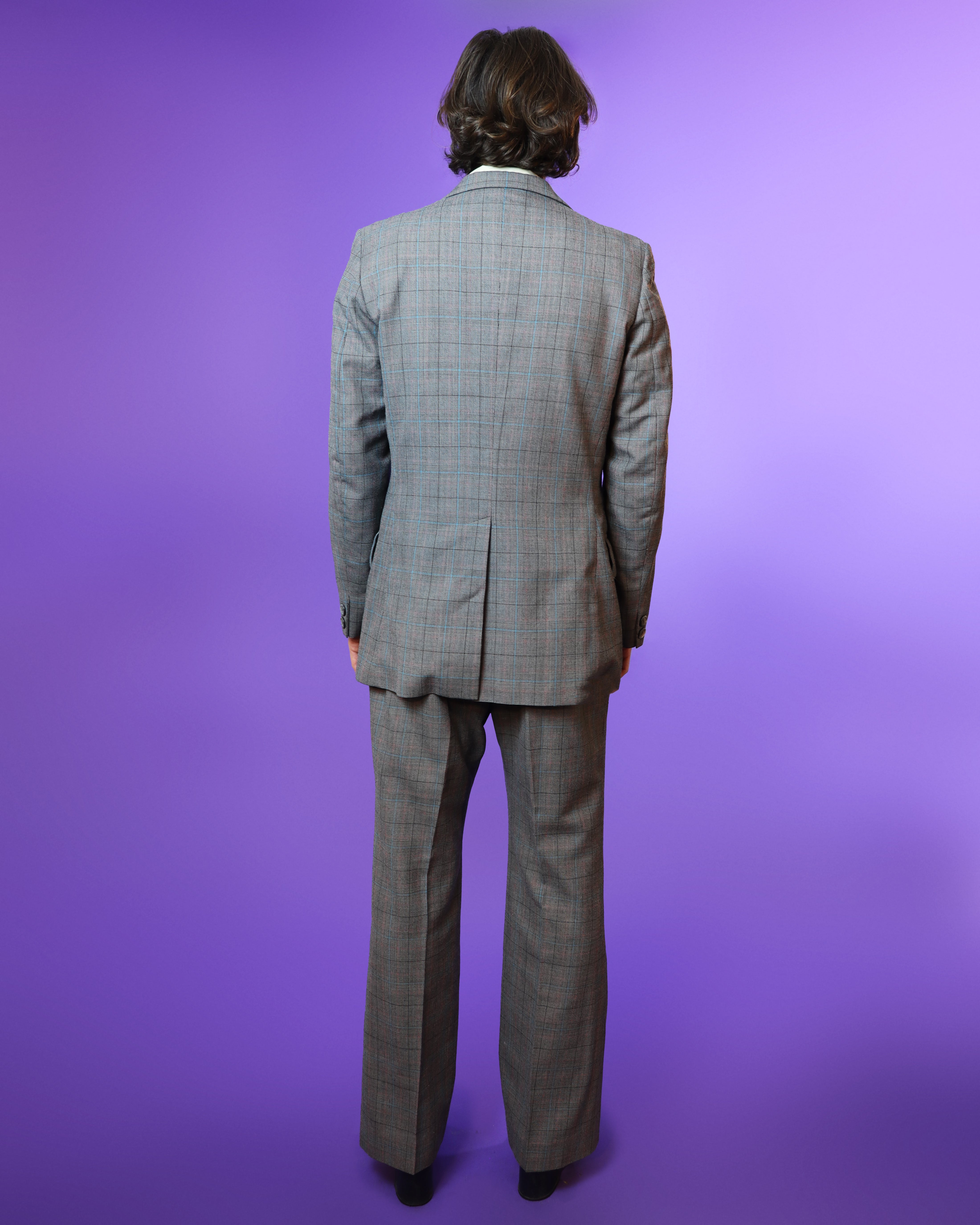 Vintage 1970s 3 piece tailored windowpane plaid suit. High quality wool mix material in grey colourway with pops of blue and pink. Cleverly cut and consisting of a wide lapel blazer and adjustable high waisted kick flares. Truly beautifully made example of suave, timeless 70s men's tailoring.