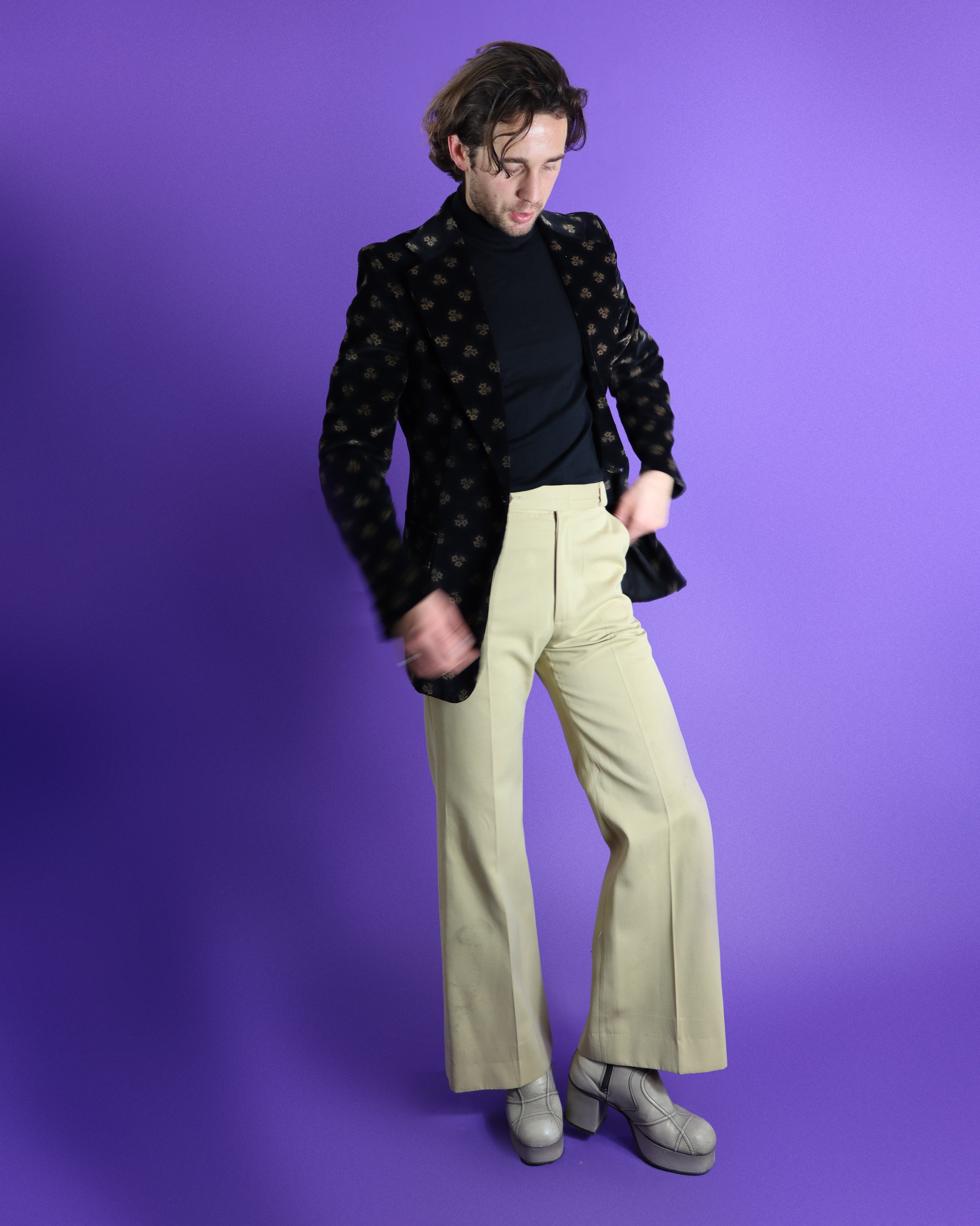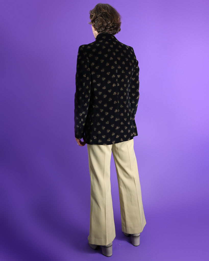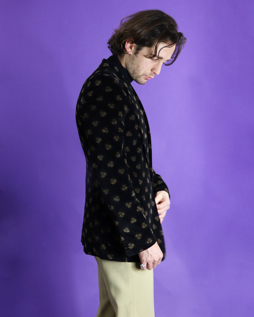 Beautiful vintage 1970s floral printed velvet blazer by 'Harold Tillman'. Lustrous black cotton velvet with stunning golden stellular floral pattern print. Cut with wide notched lapel, large patch pockets and single button closure.