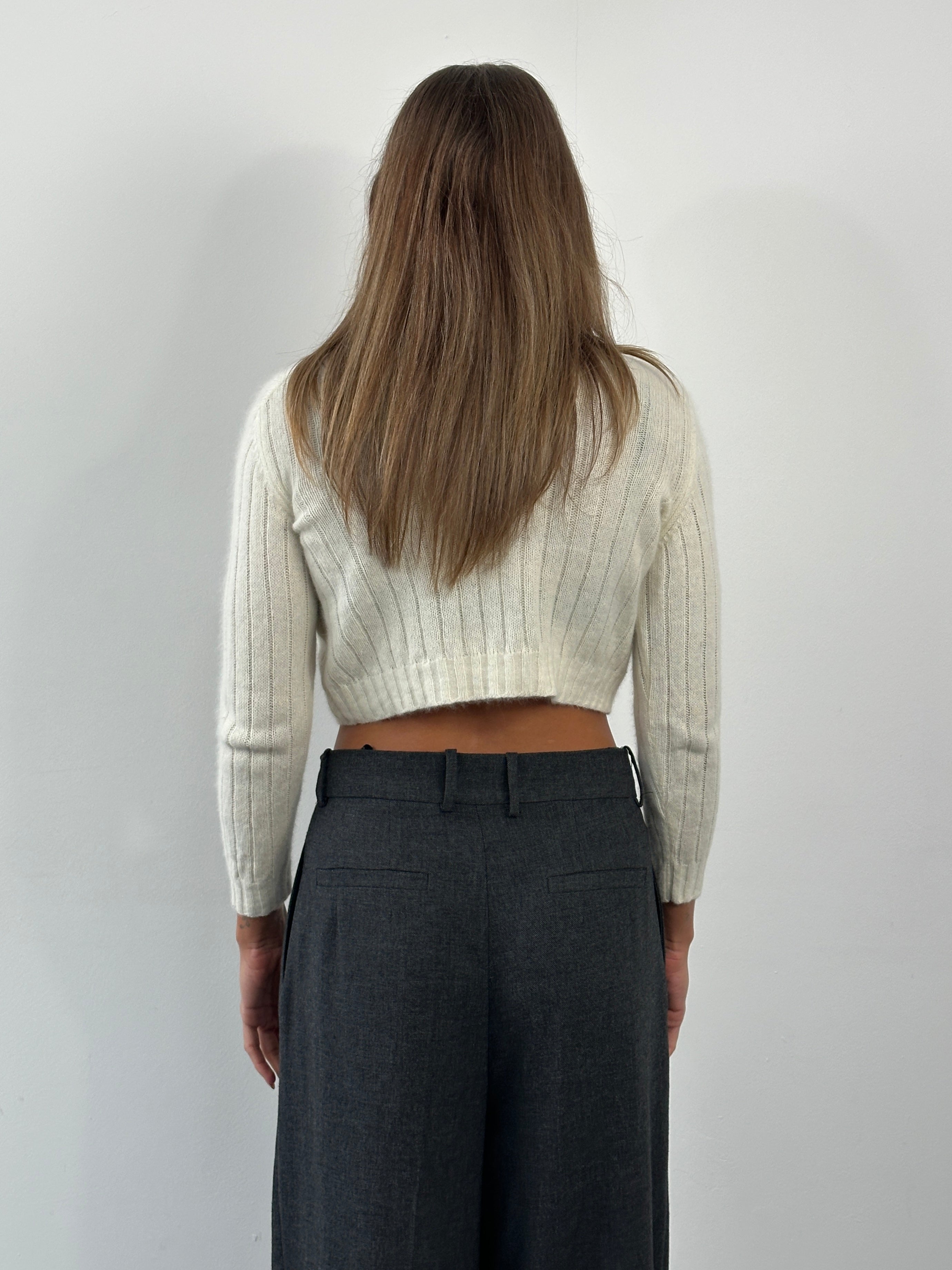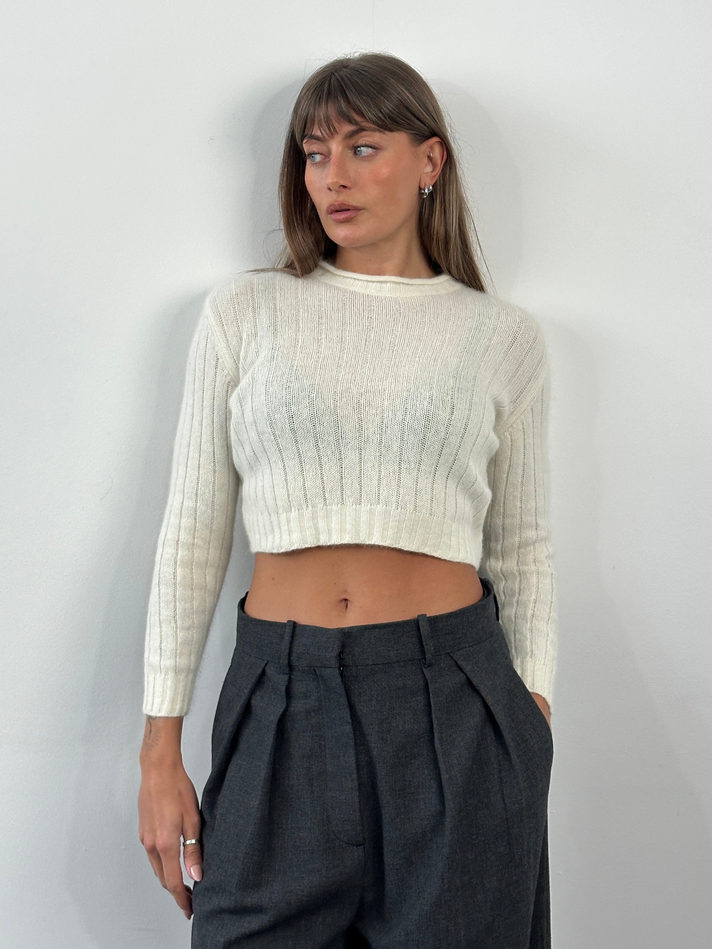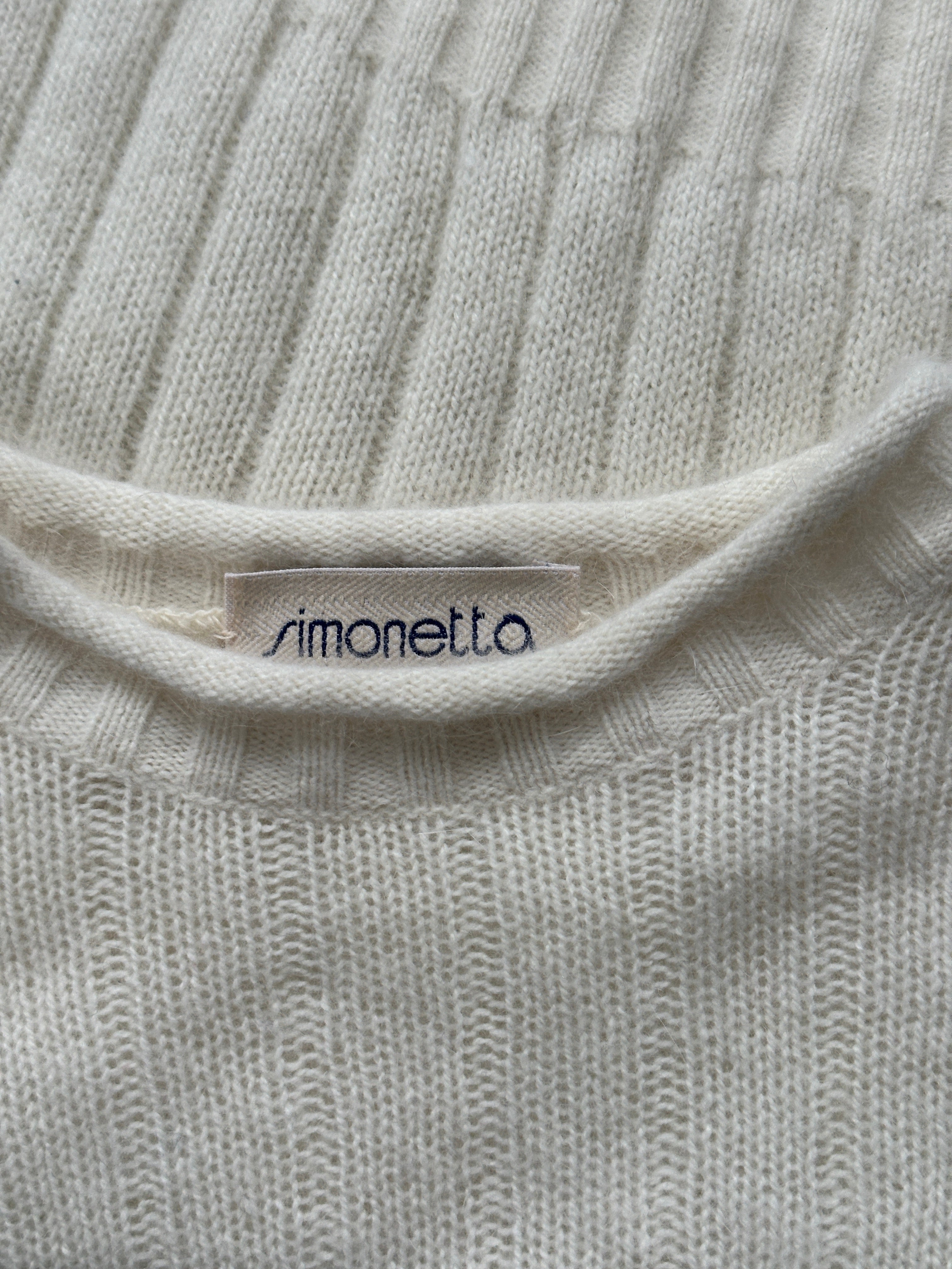 Vintage cream cropped jumper from the 1990s by Simonetta, crafted in a soft angora-blend knit with a lightly fluffy finish. Designed with a ribbed texture throughout and a clean crew neckline, offering a fitted cropped silhouette with a delicate, cosy handle and minimal detailing.