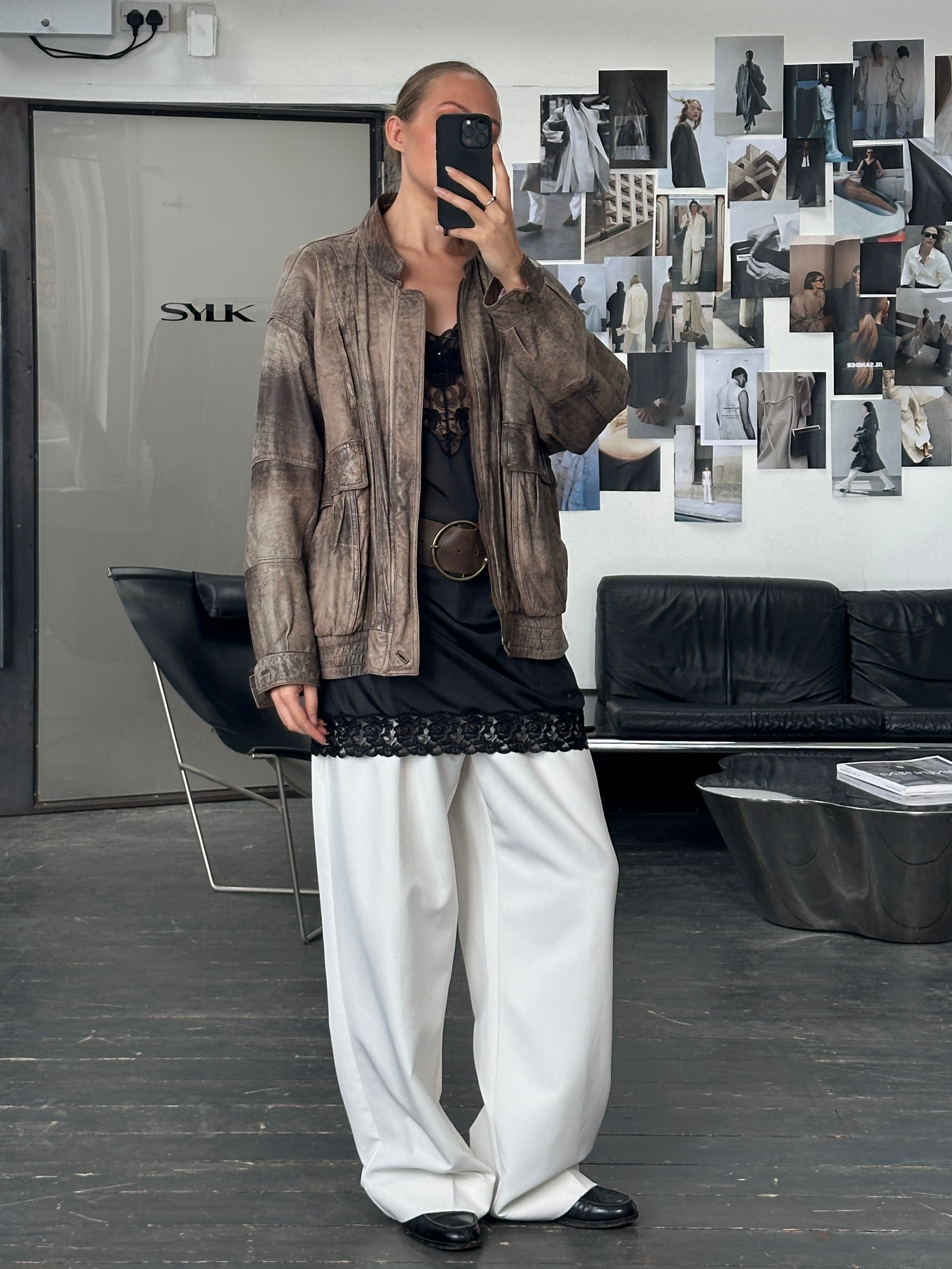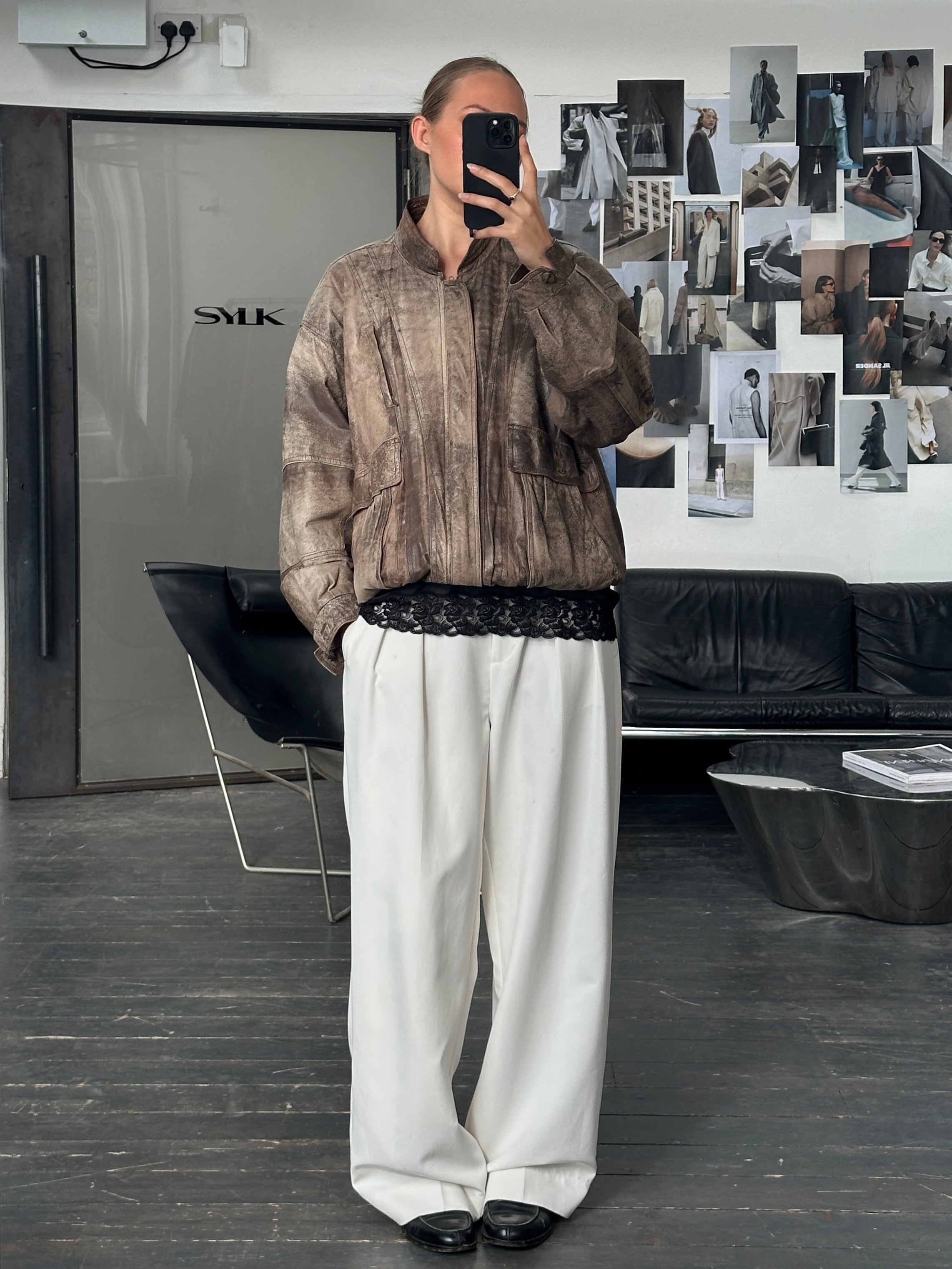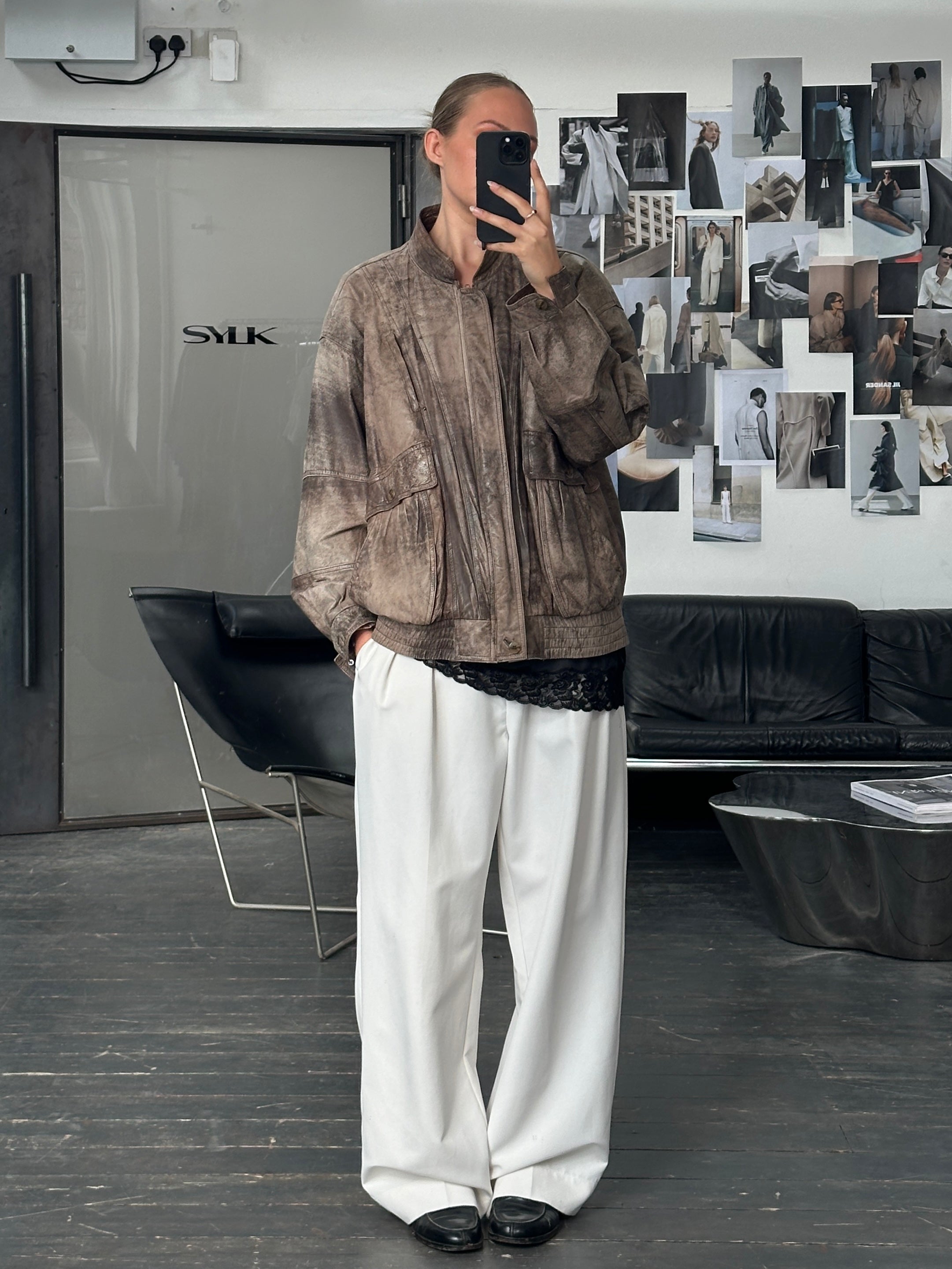 ~ Distressed finish leather in oversized fit