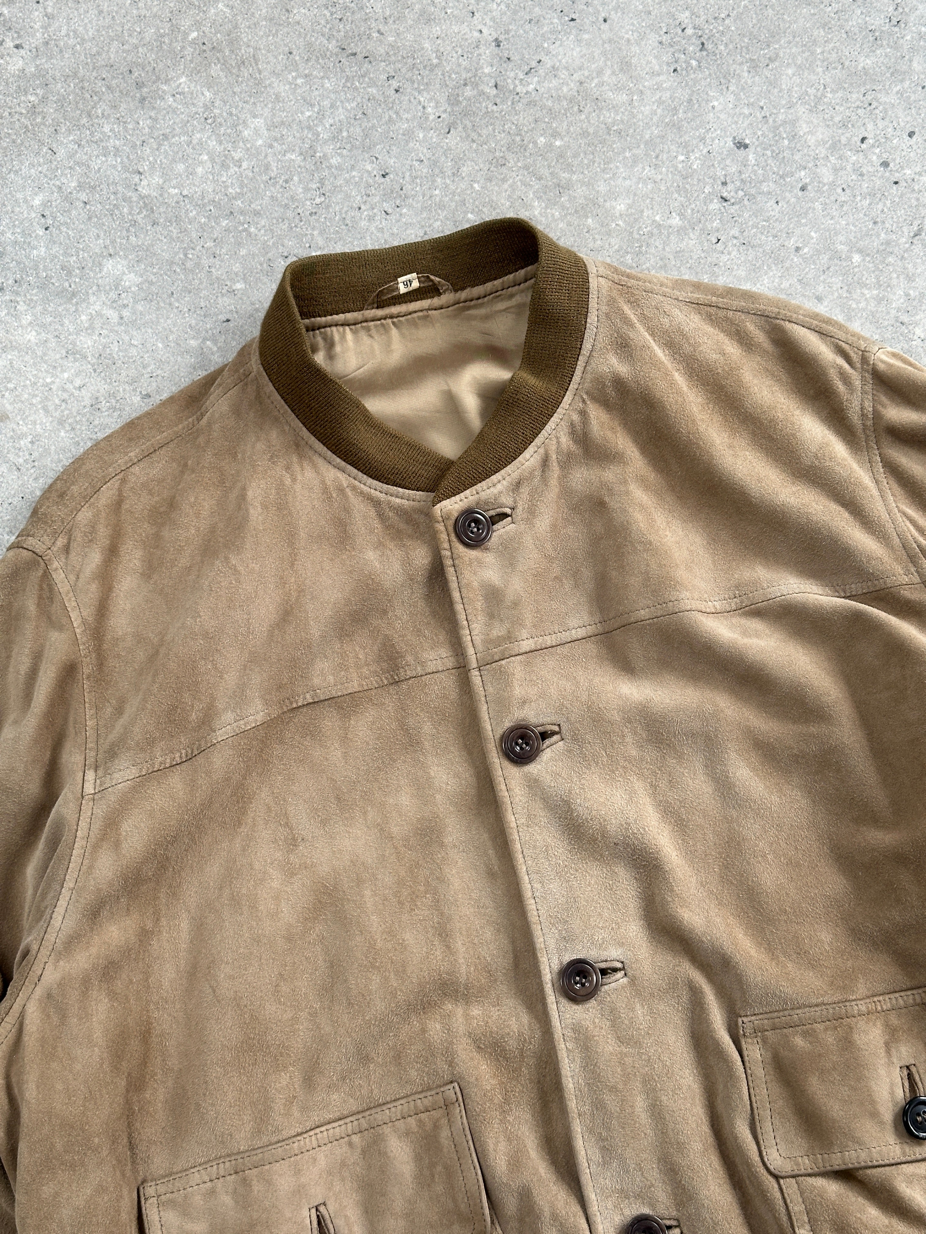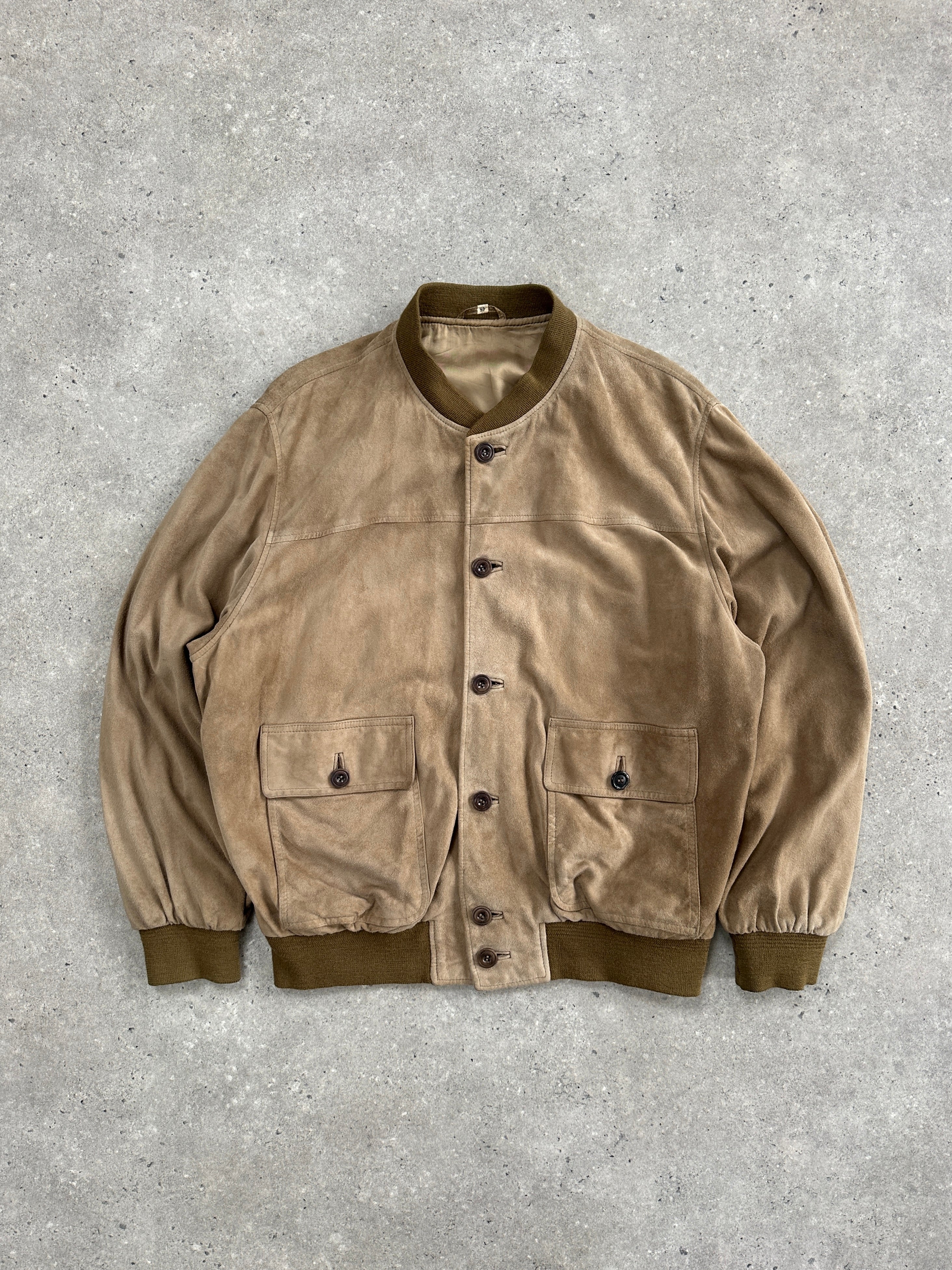 Vintage suede bomber by ComoK, crafted in soft tan suede with ribbed trim and utilitarian flap pockets.