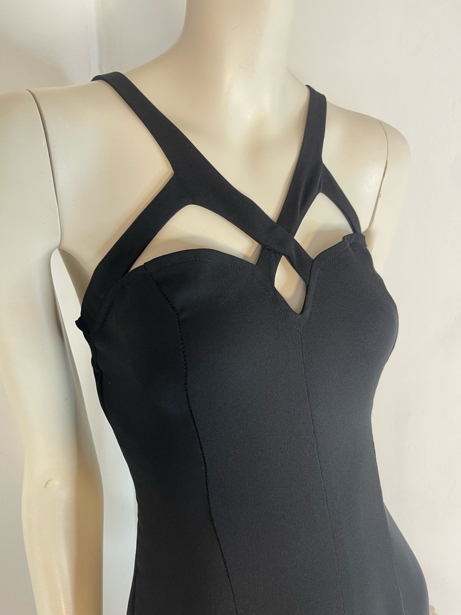 Elevate your wardrobe with this stunning vintage Bernshaw jumpsuit, designed in a timeless black for a sleek, sophisticated look. The standout feature is its beautifully structured strappy neckline with chic cut-out detailing, giving the piece a bold yet elegant edge.