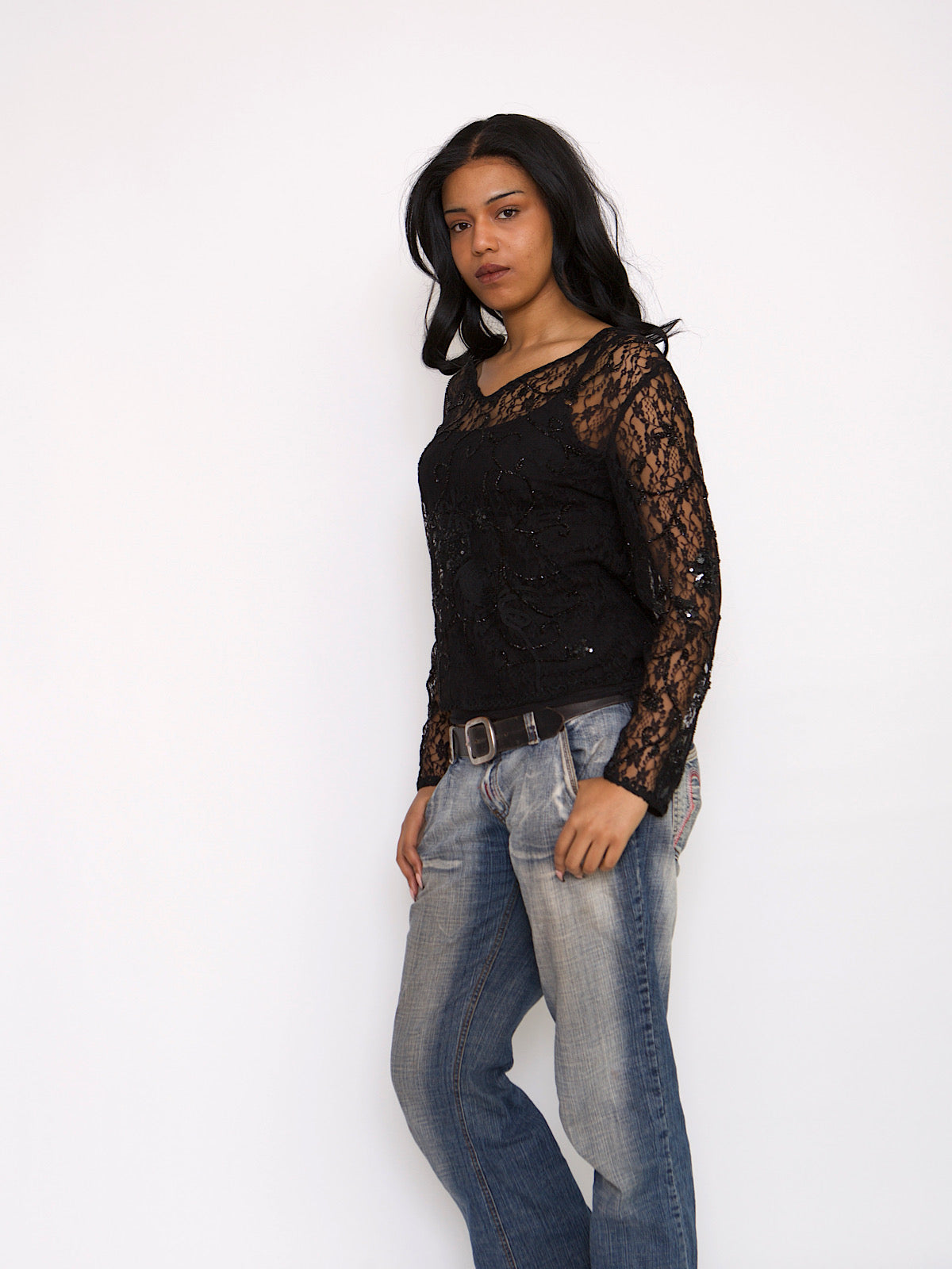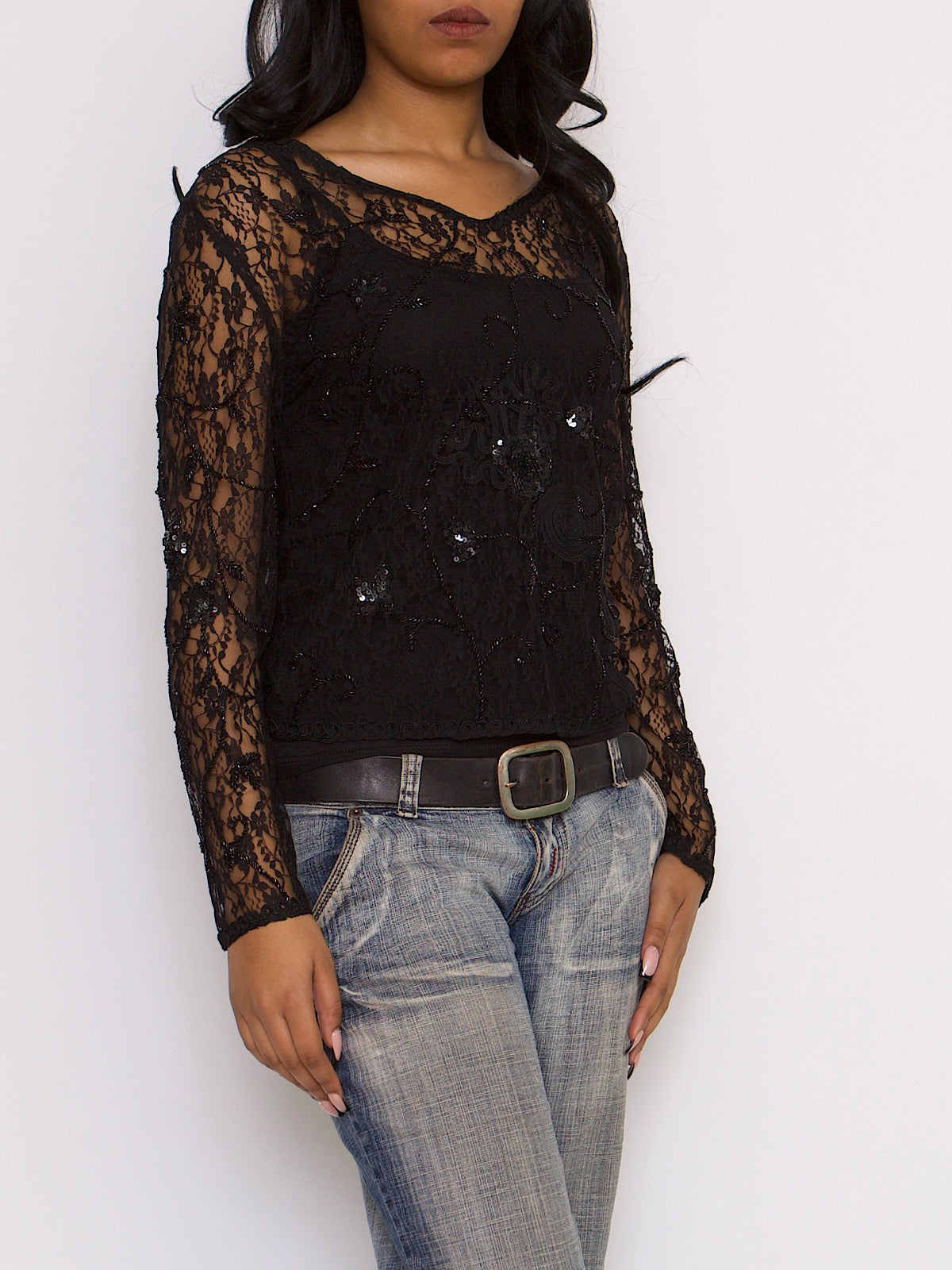 VINTAGE BLACK LACE TOP WITH SEQUIN DETAILS