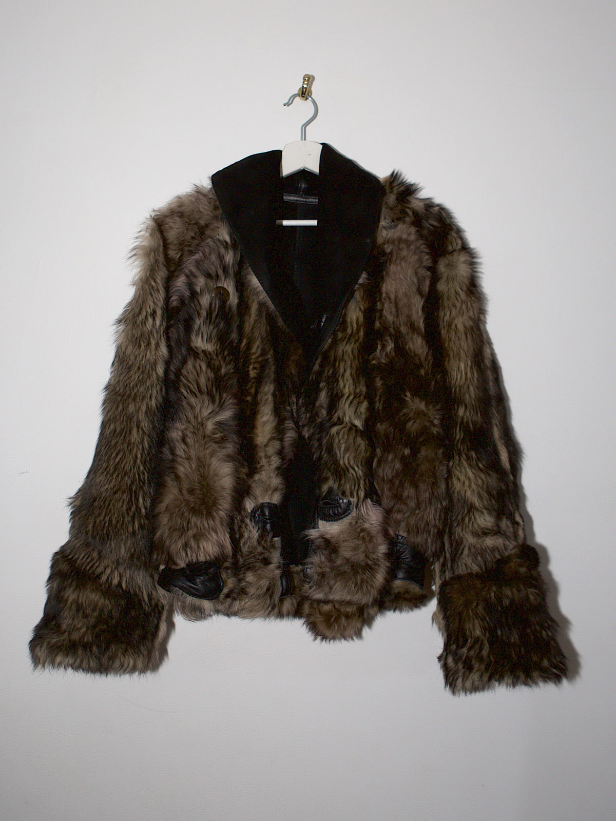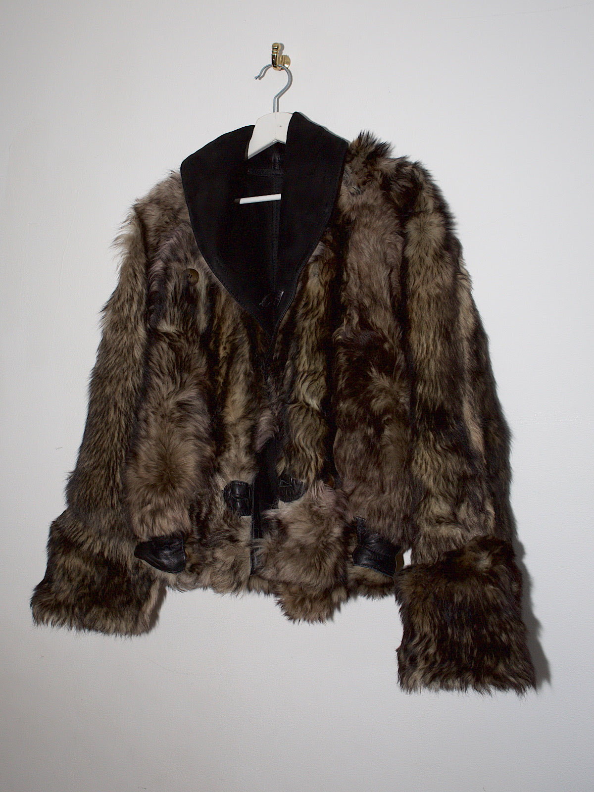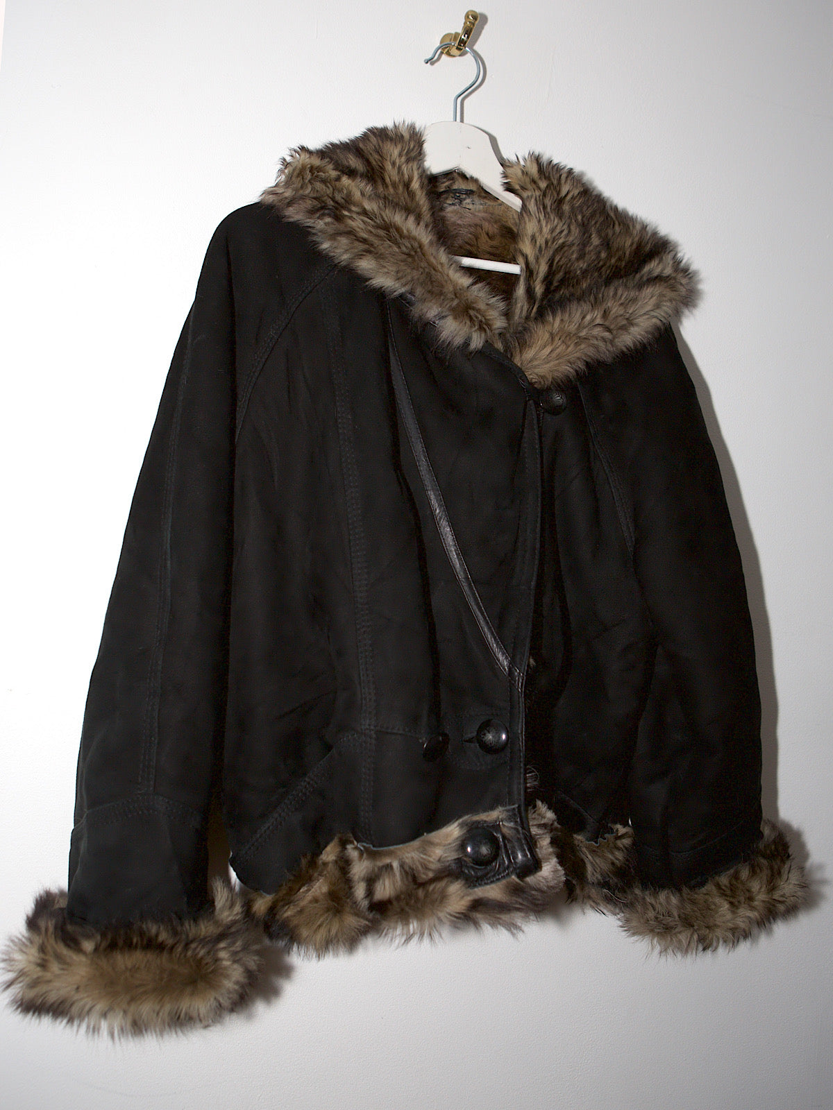 Upcycled sheepskin, the jacket has been cropped and fastened with button attachments on both side.