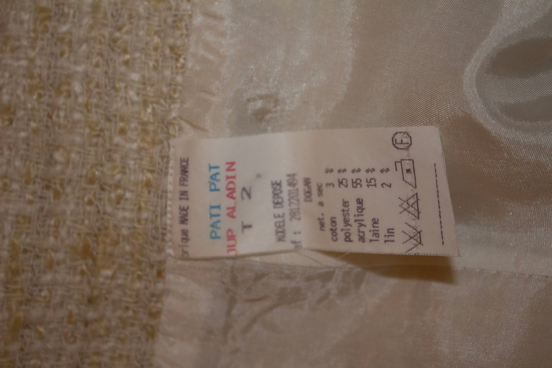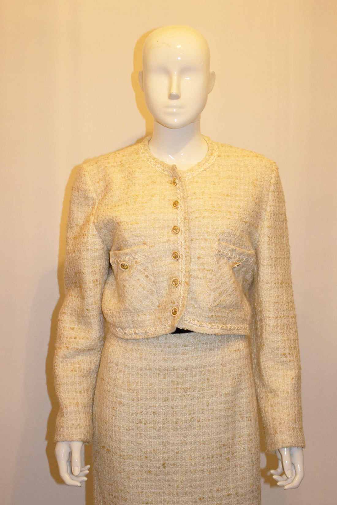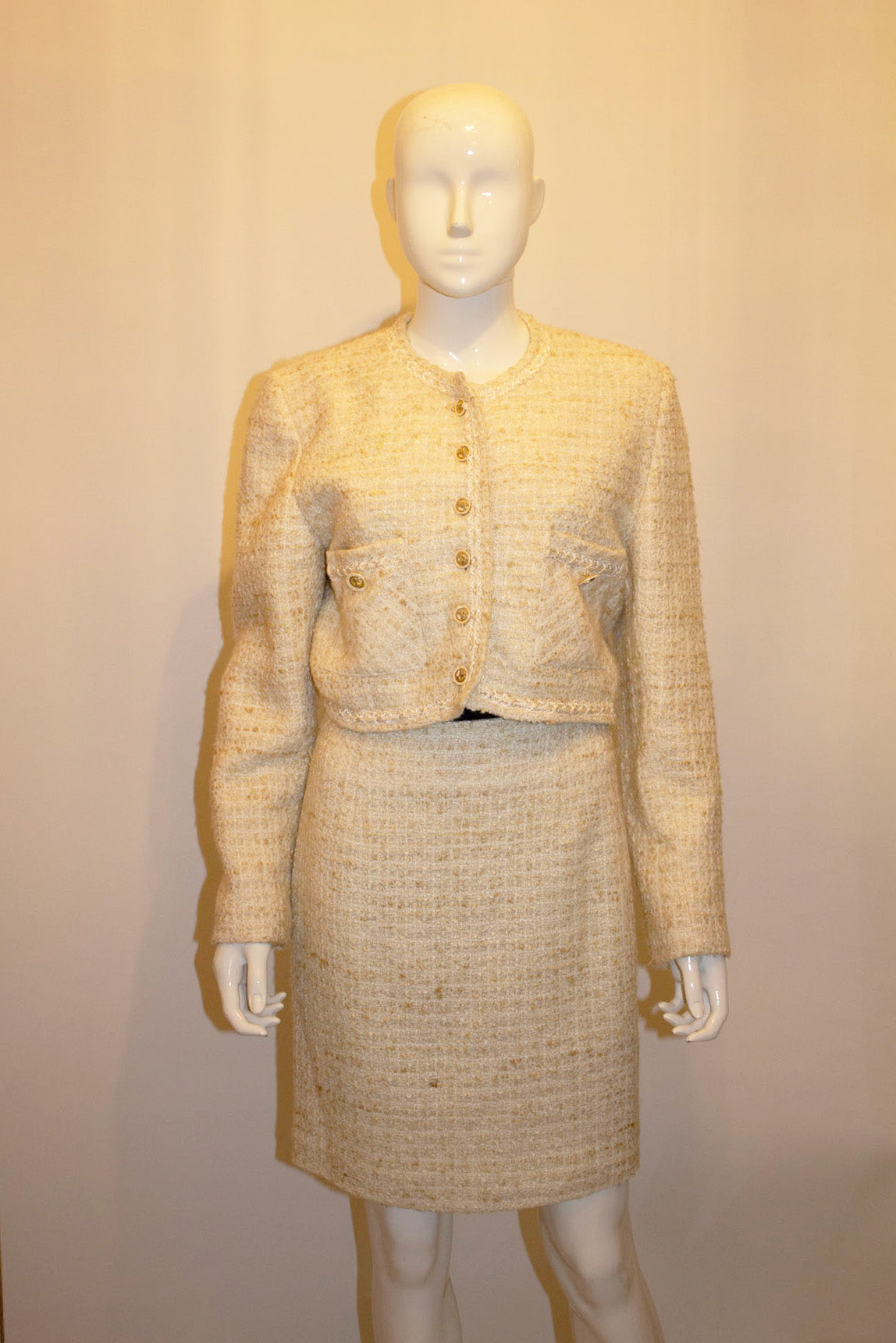 A wonderful vintage Chanel style white suit by Les Copines de Nista. In an ivory and caramel mix, the jacket has a six button opening at the front with a pocket on either side , and is fully lined. The skirt has a back central zip and is fully lined. Made in France.