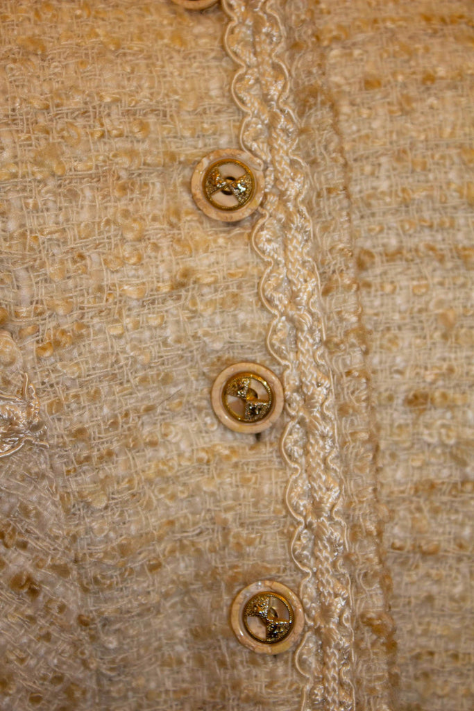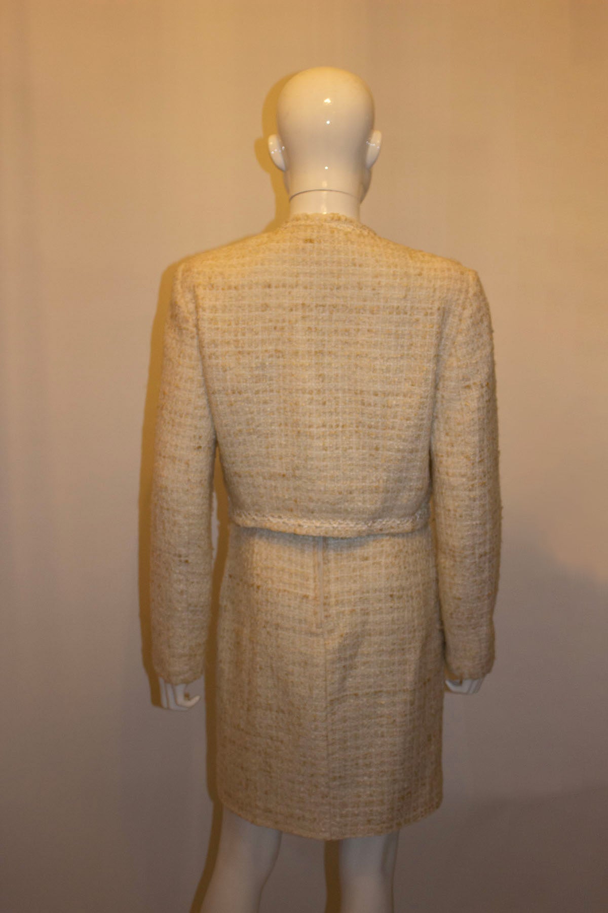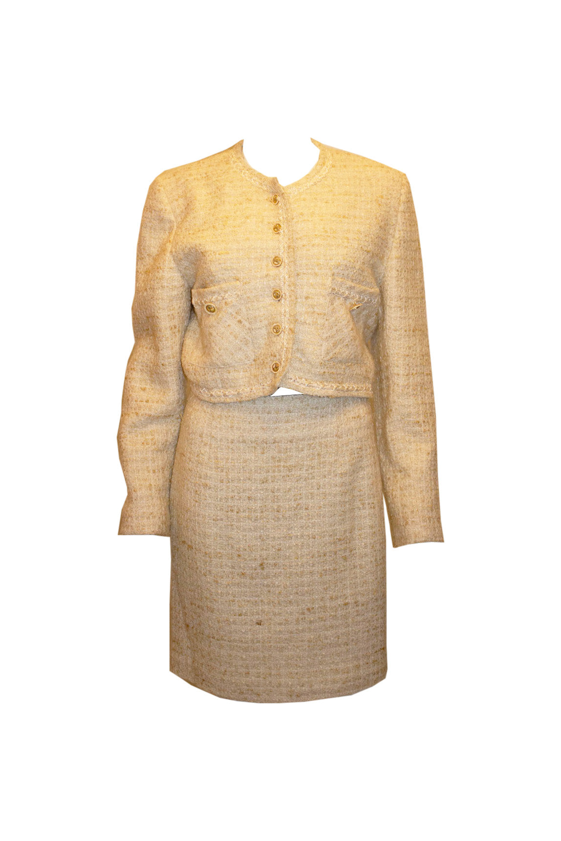 A wonderful vintage Chanel style white suit by Les Copines de Nista. In an ivory and caramel mix, the jacket has a six button opening at the front with a pocket on either side , and is fully lined. The skirt has a back central zip and is fully lined. Made in France.