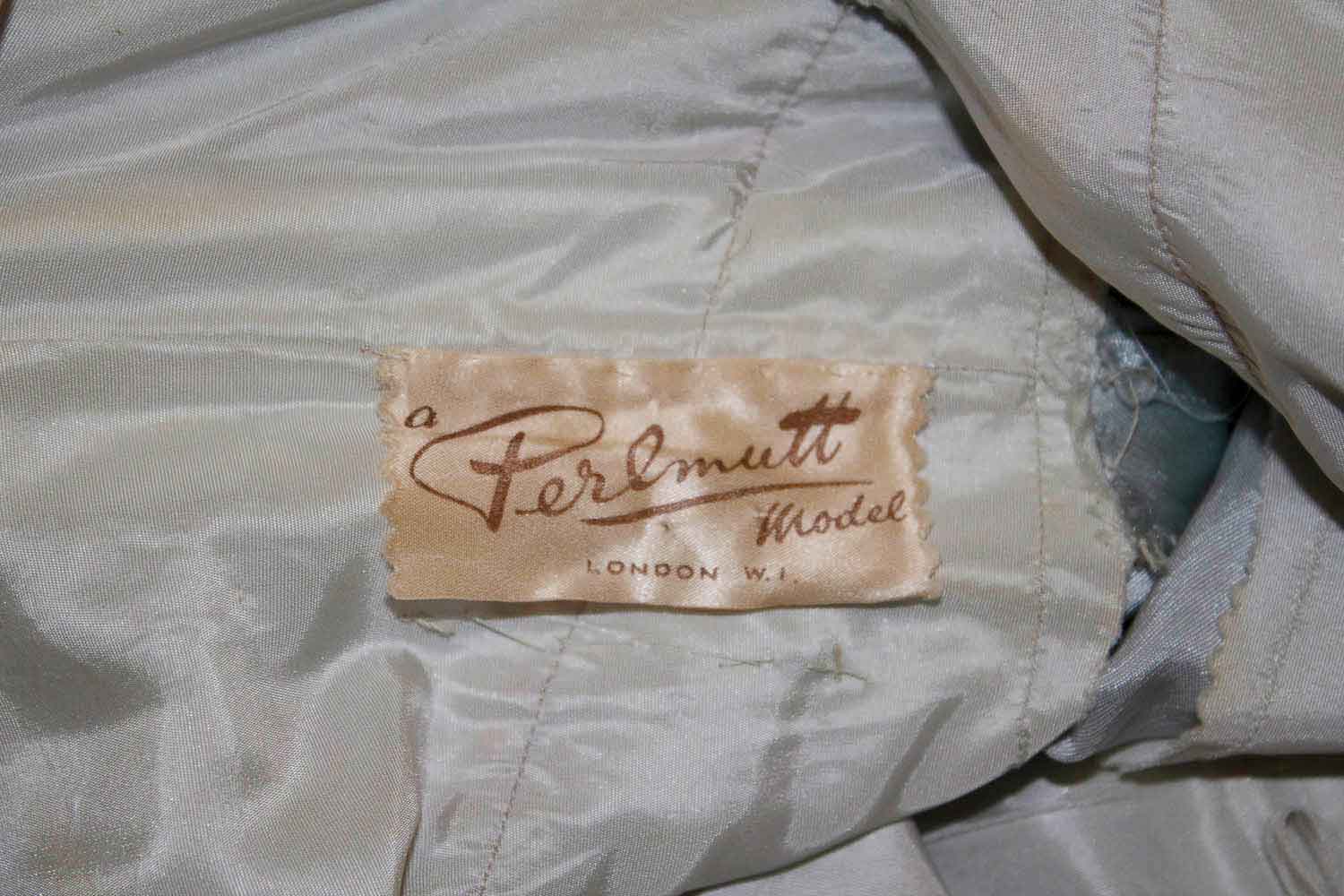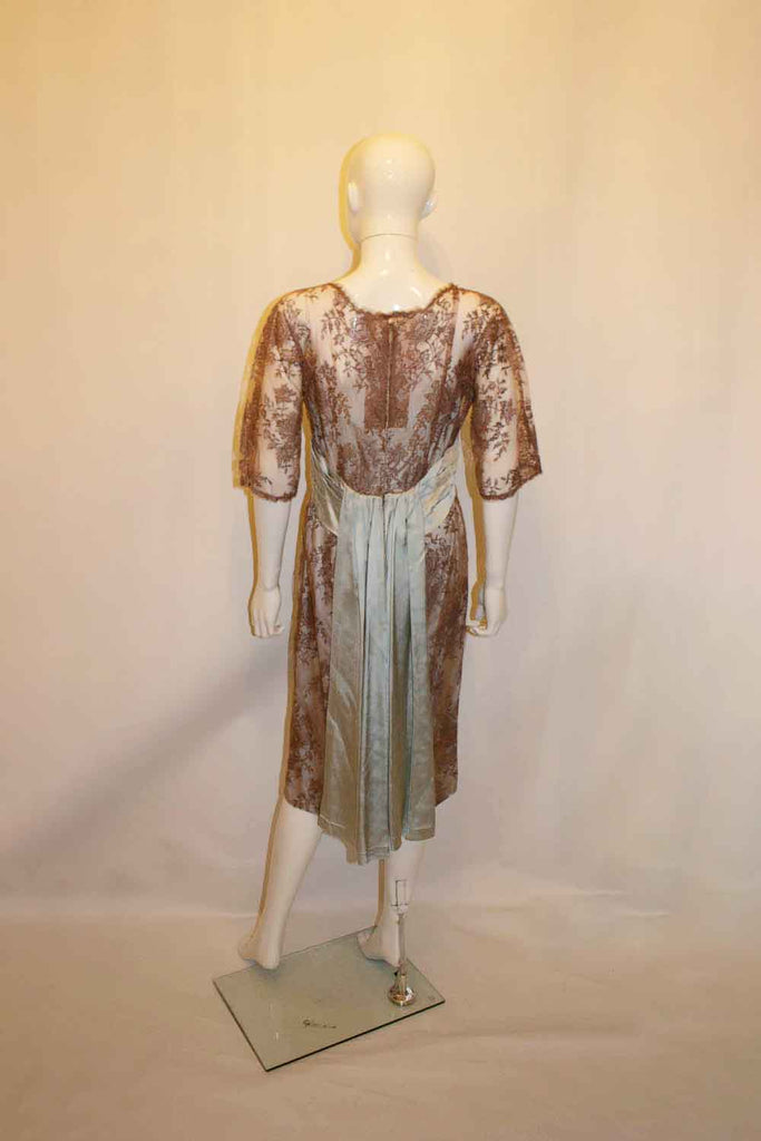 A stunning vintage couture cocktail dress in sky blue satin and chocolate colour lace. The dress is beautifully made with boning in the bodice ( could be removed), and has elbow length sleaves. and a central back zip.