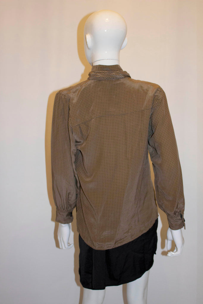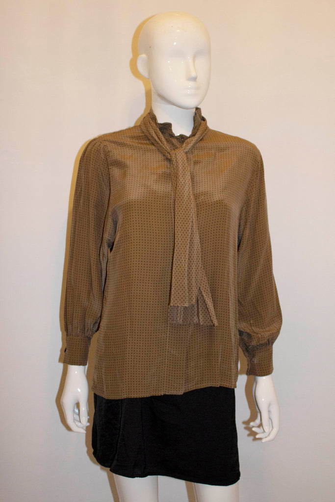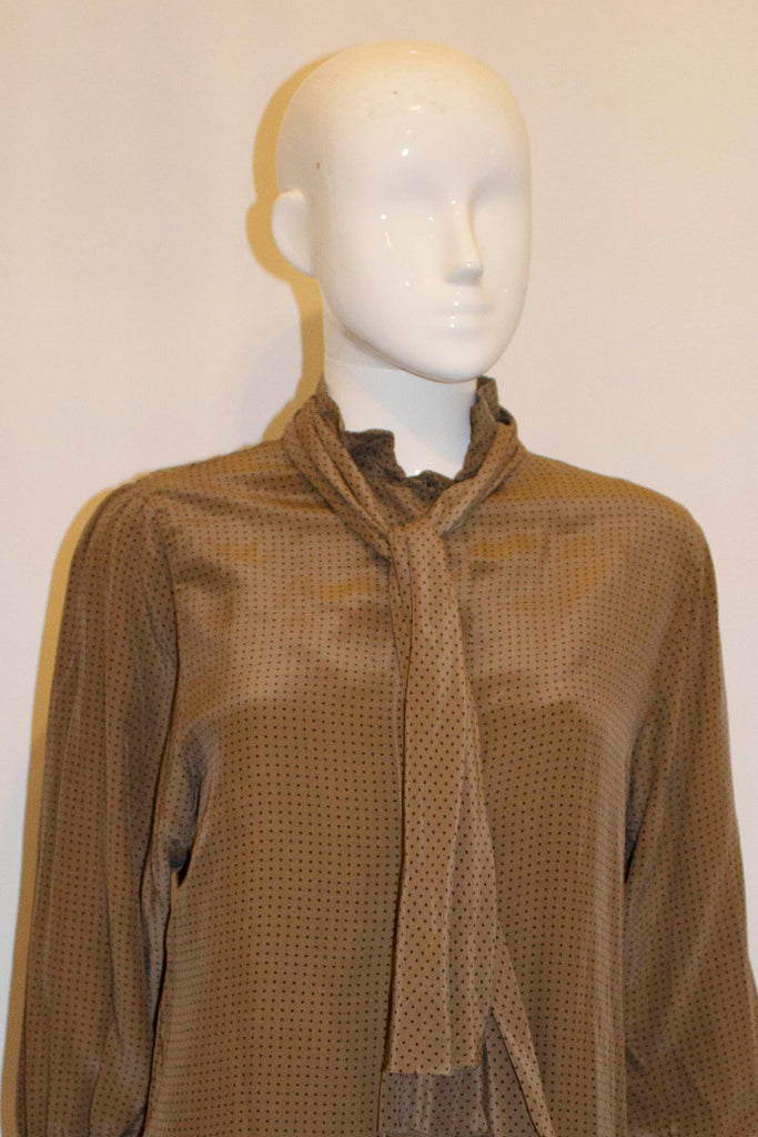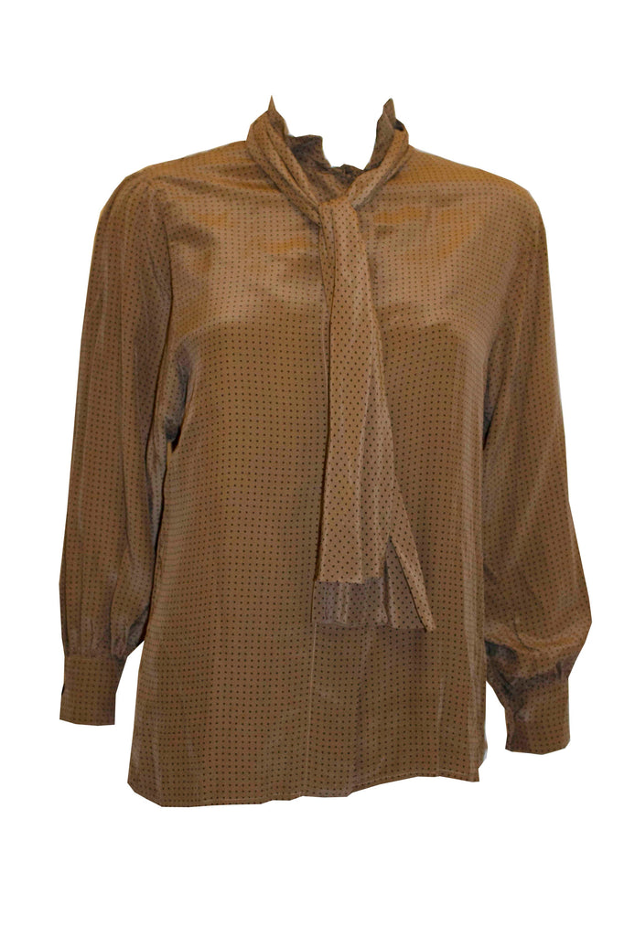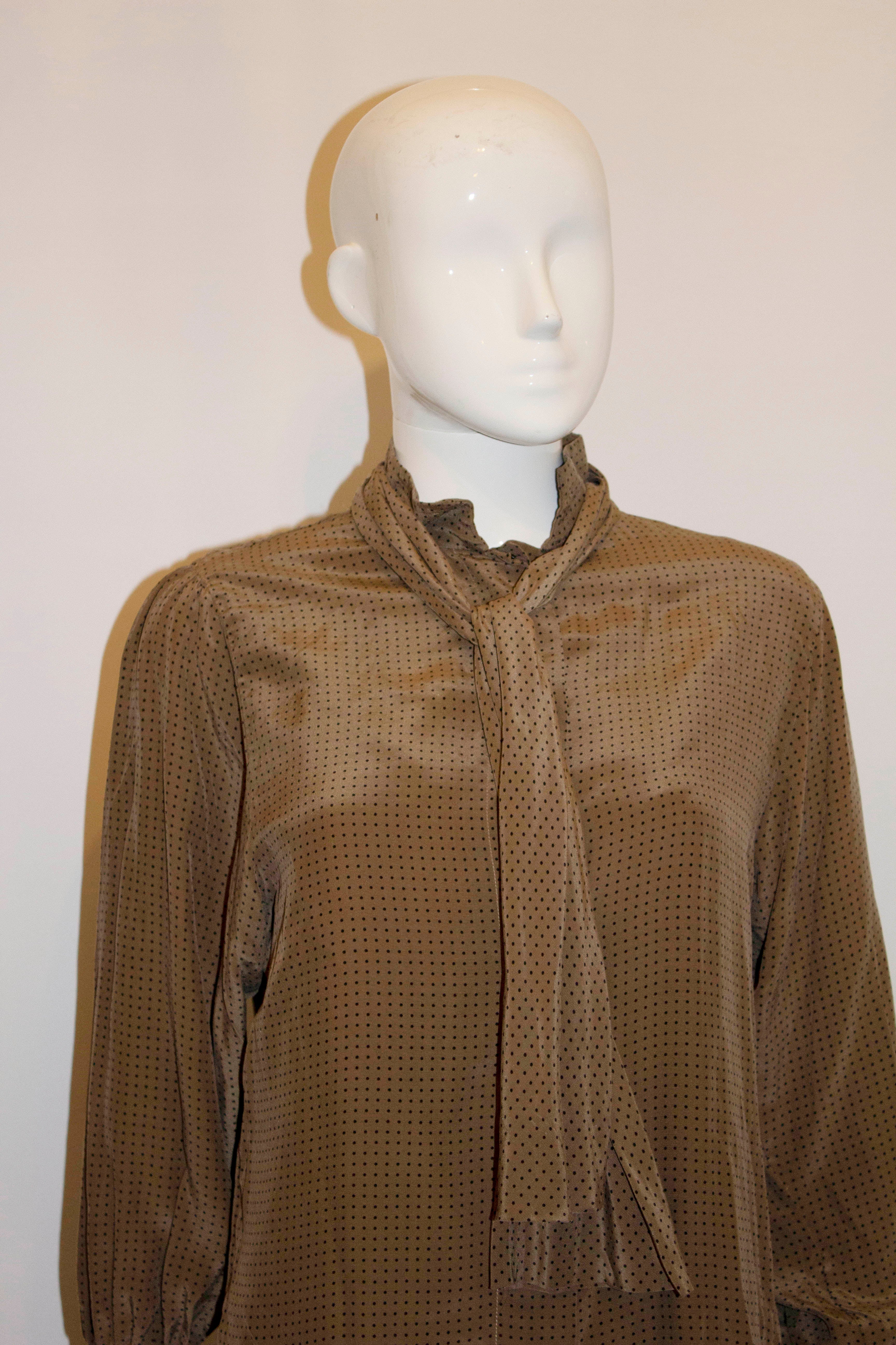 A super soft vintage silk blouse by Gloria Sachs, New York.The blouse is in a coffee coloured silk with black dots , a single button cuff , front opening and attached kneck tie.