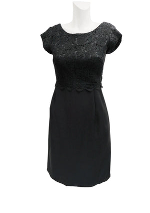 It has a fitted bodice made of Chantilly lace, with wide neck and cap sleeves, scalloped at the waist.  The skirt is softly pleated underneath the lace and hangs straight to knee length. Back zip, fully lined.