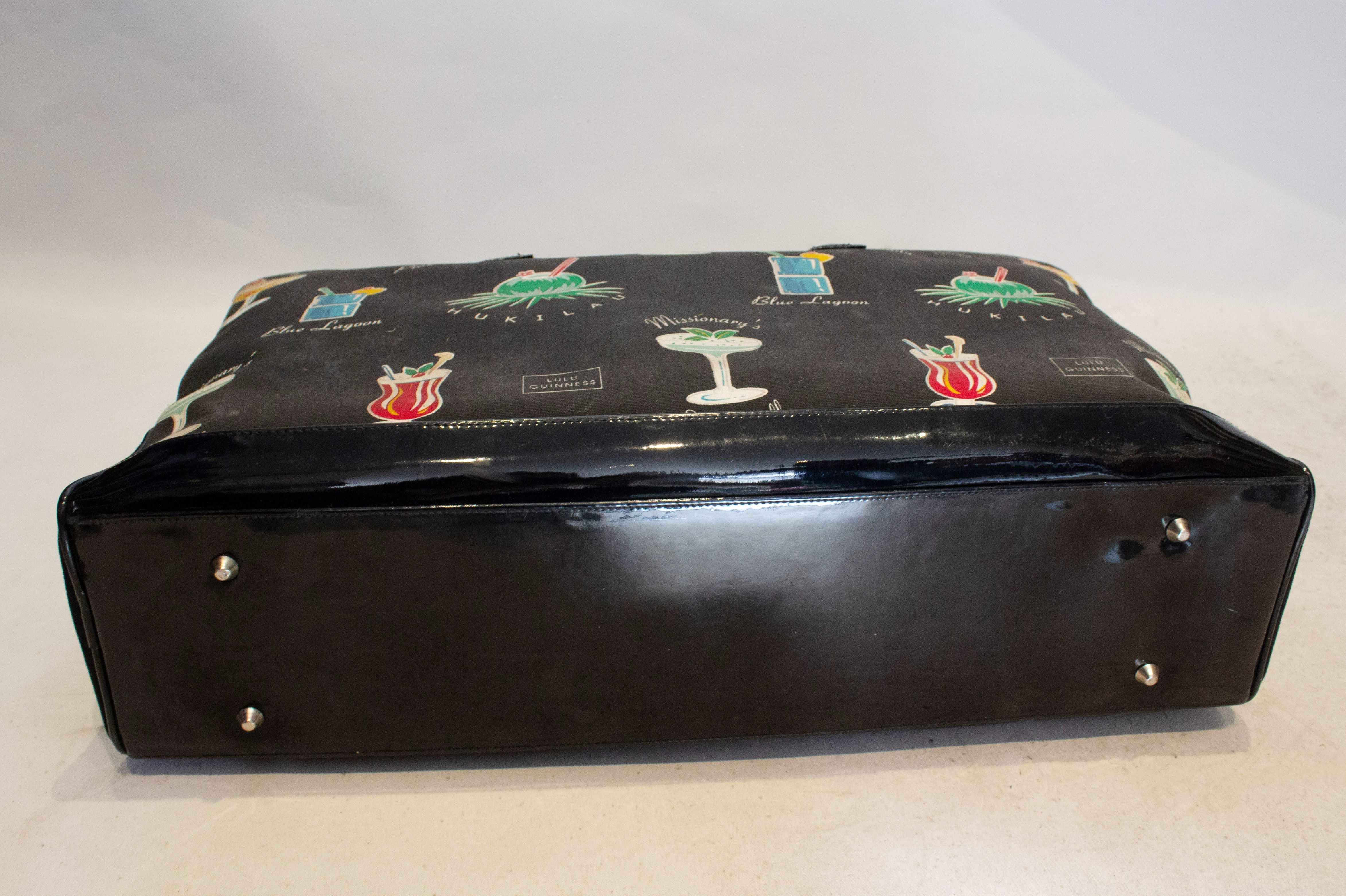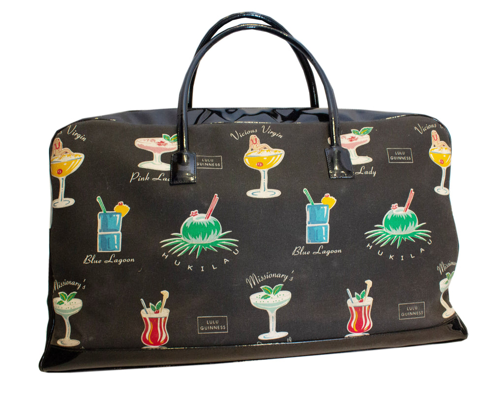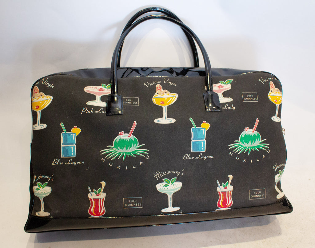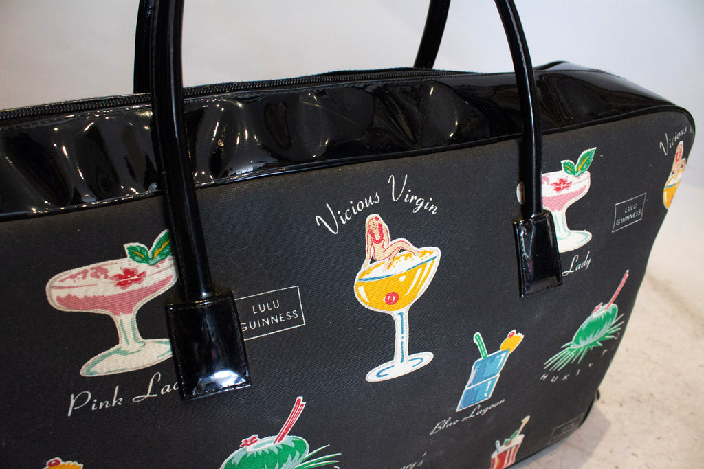 A fun cocktail suitcase/ holdall by Lulu Guinness. The front and back have a black background, with a colourful print of multi colour cocktails. It has a zip opening , two handles , internal zip pocket and four feet.