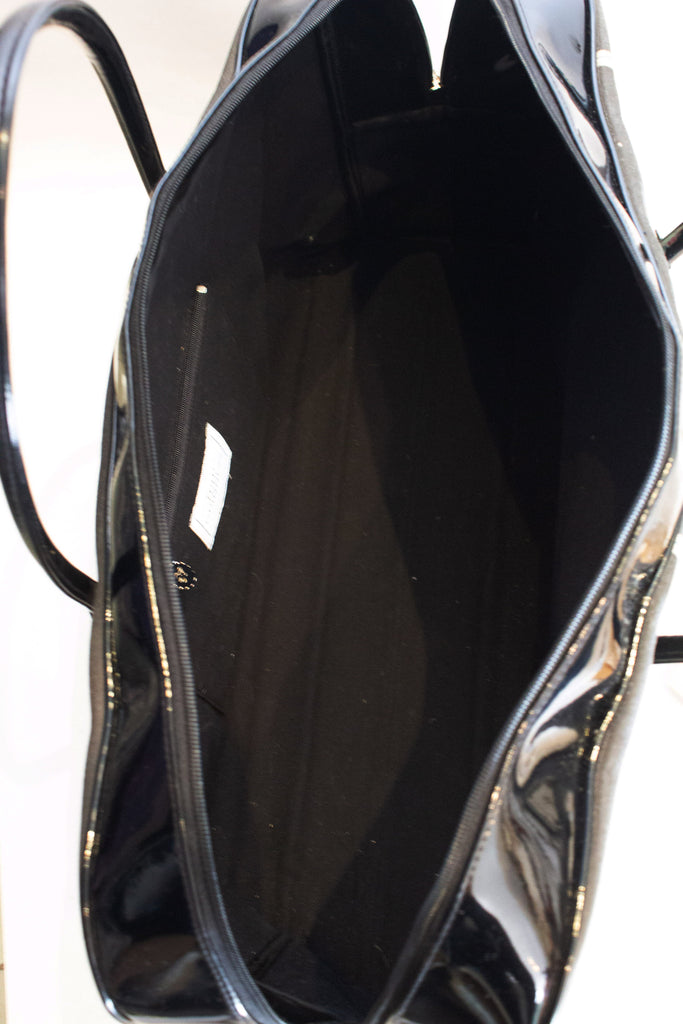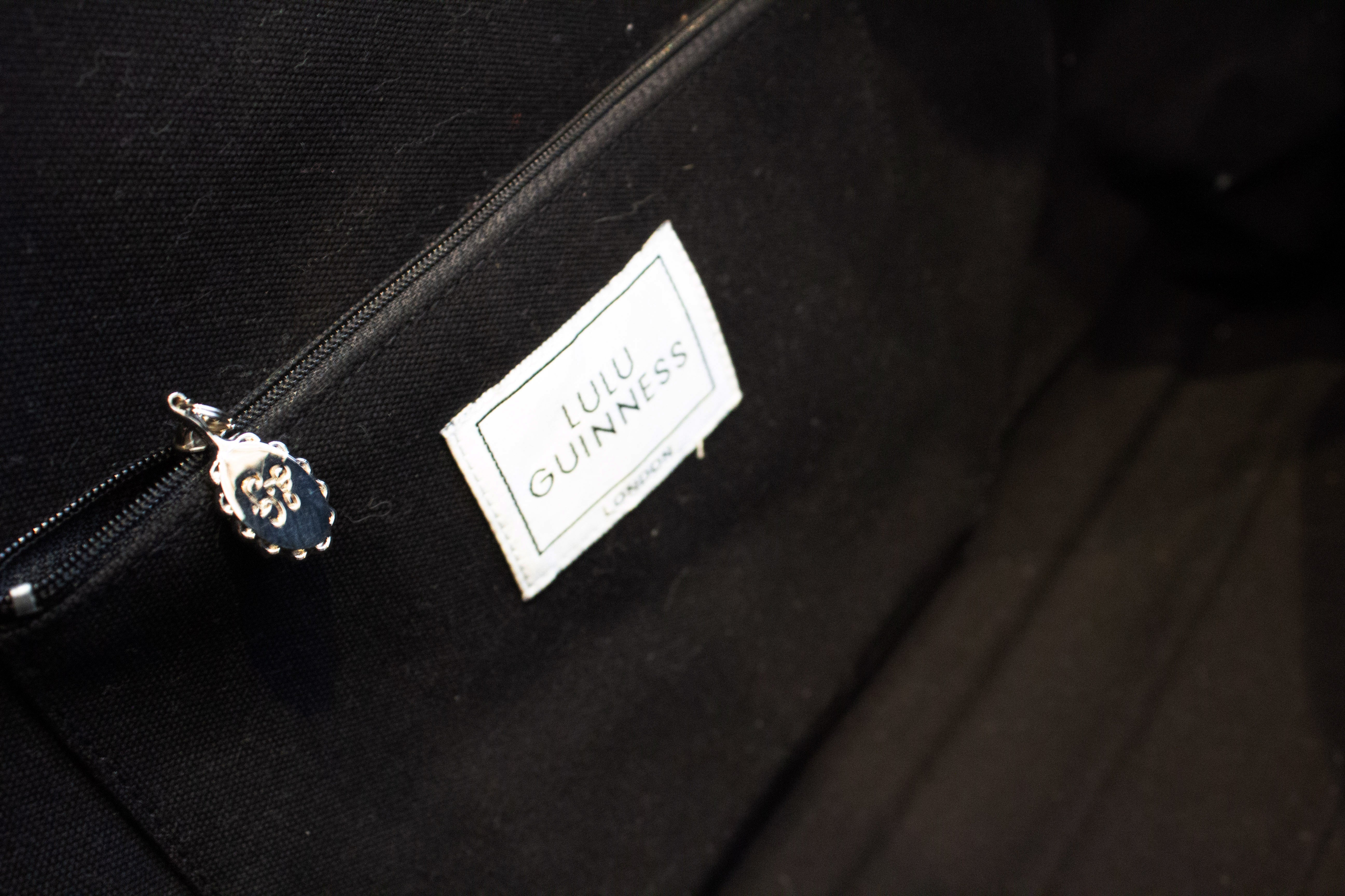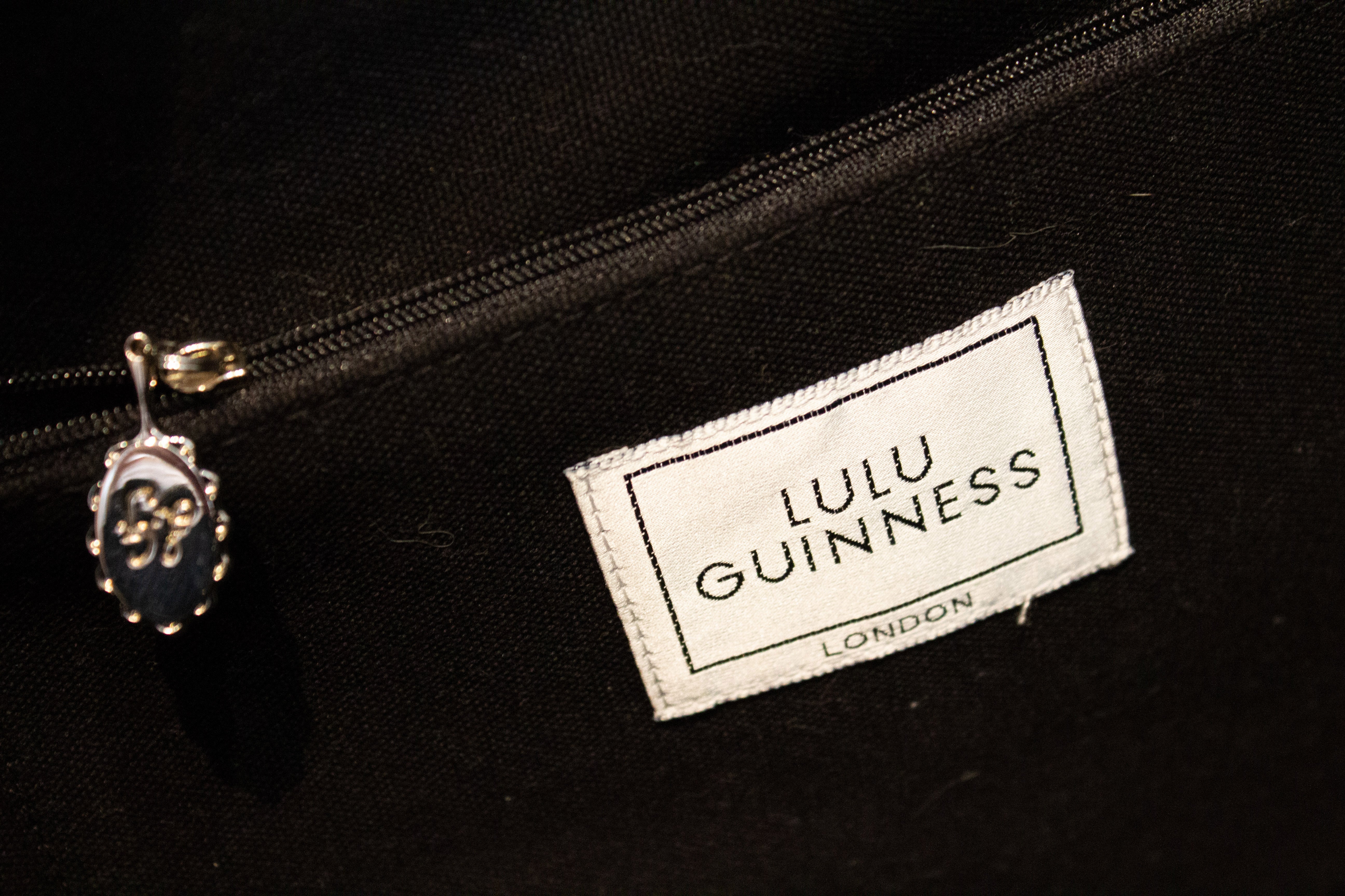 A fun cocktail suitcase/ holdall by Lulu Guinness. The front and back have a black background, with a colourful print of multi colour cocktails. It has a zip opening , two handles , internal zip pocket and four feet.