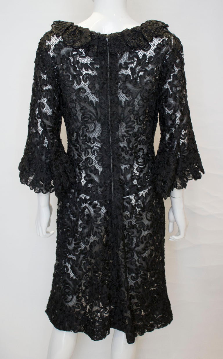 A chic cocktail dress in black ribbon work. The dress has frill detail at the collar and cuffs, and a back central zip.