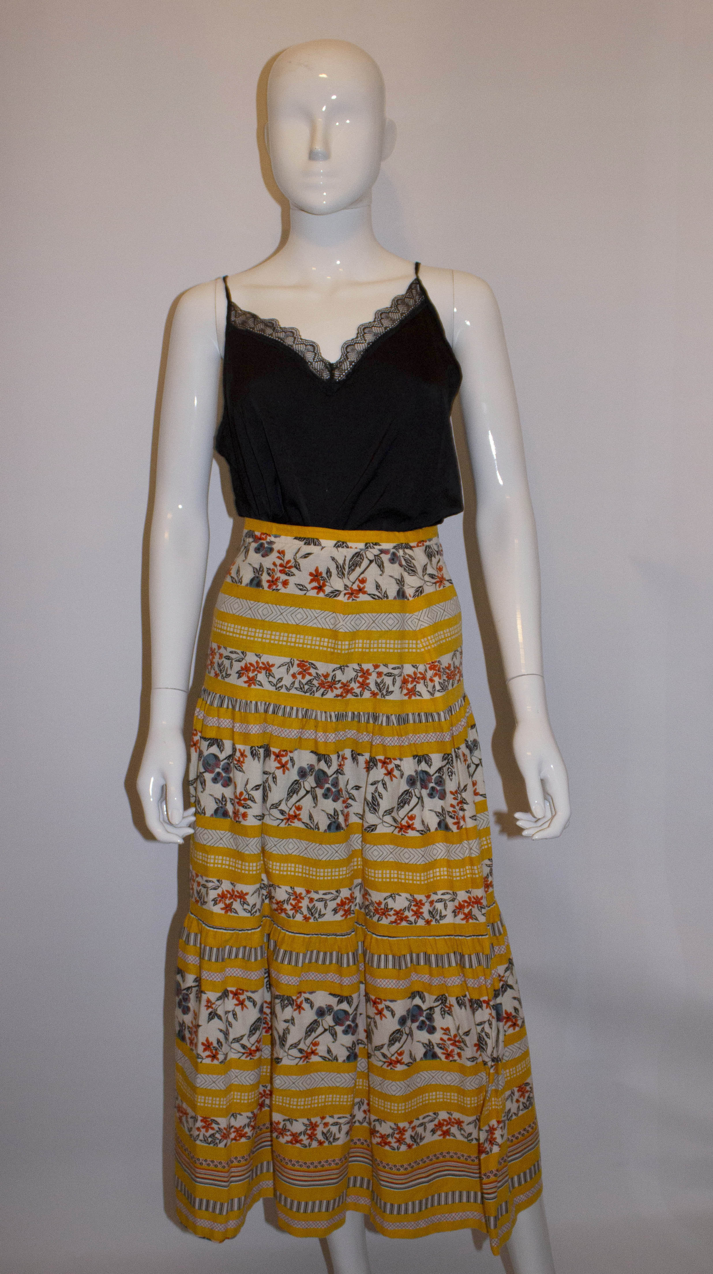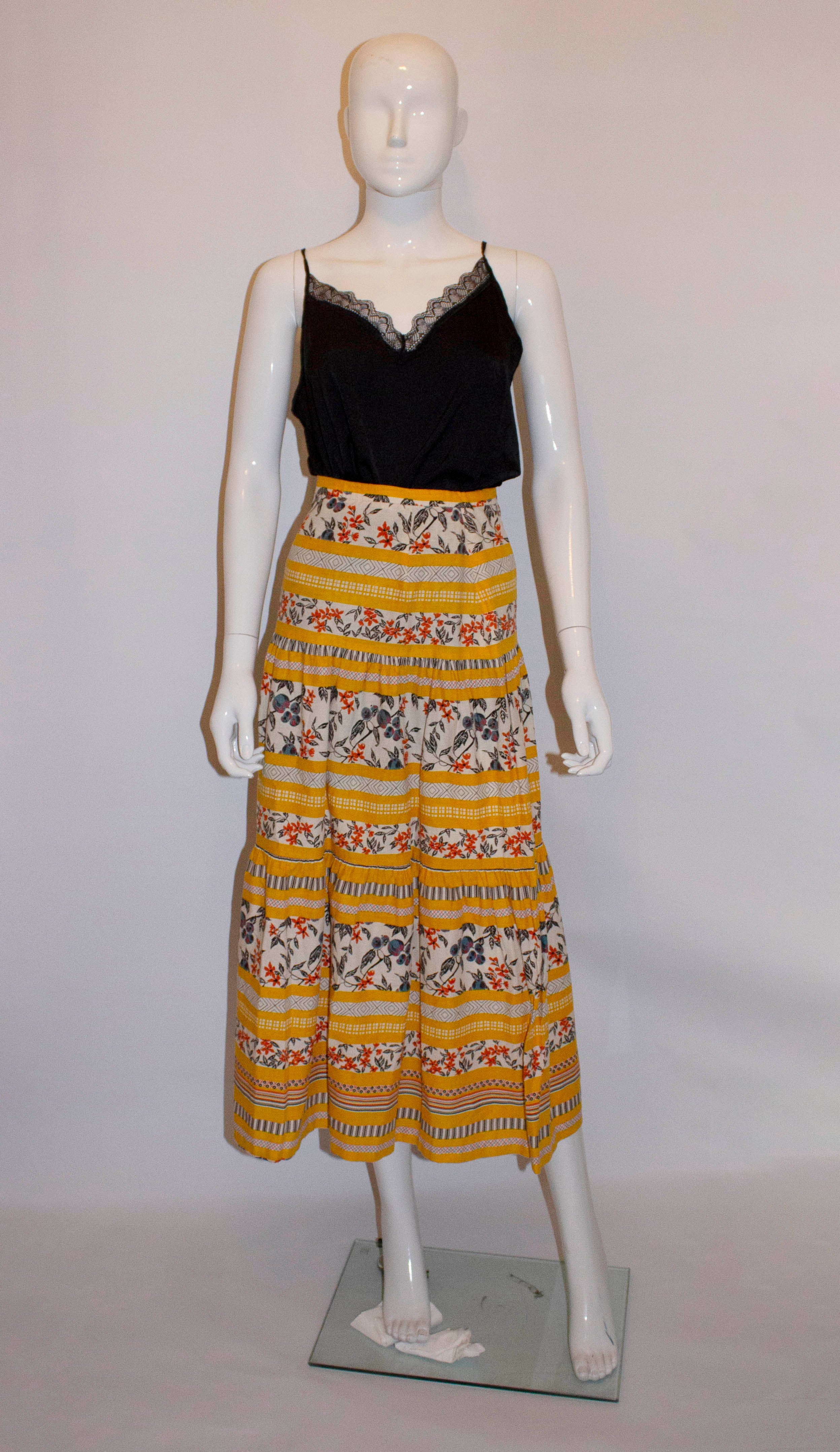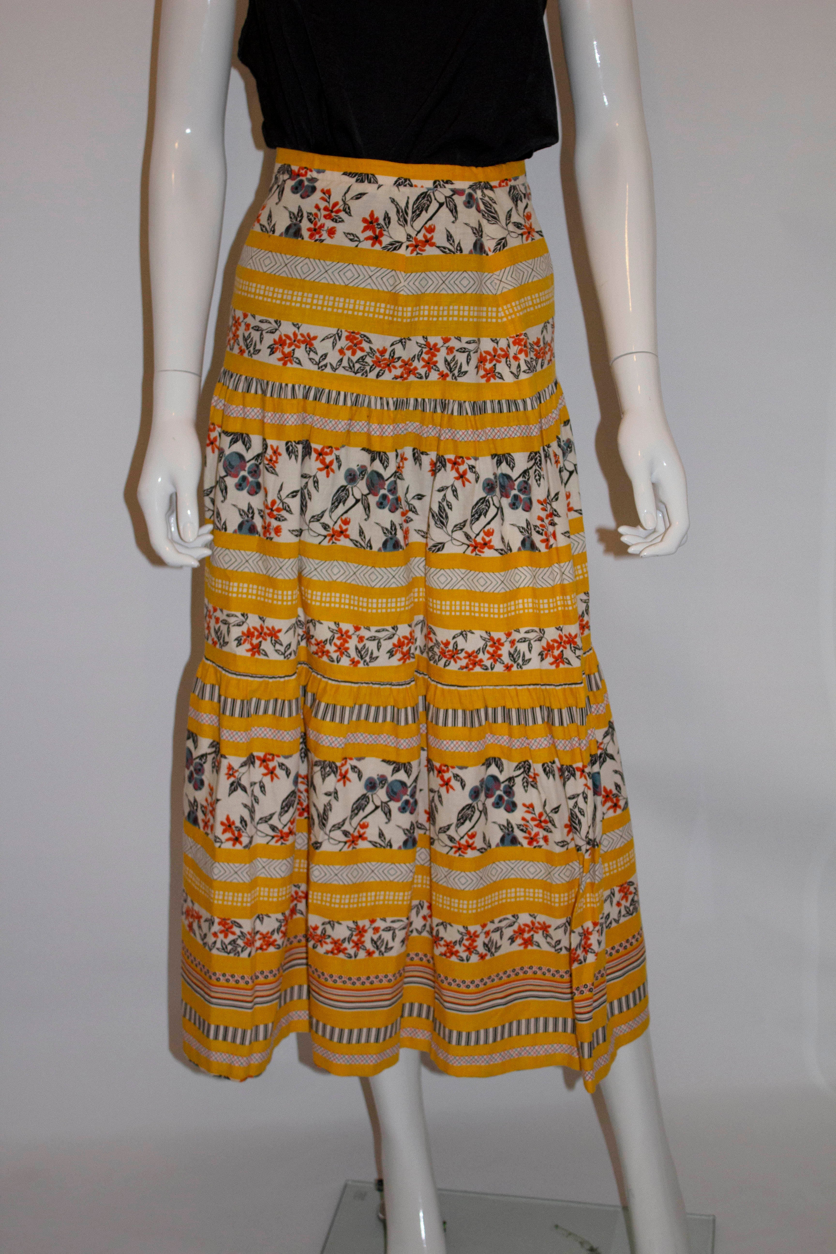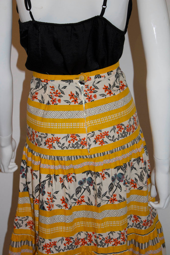 A fun vintage cotton skirt in a great print mix, and in tiers so it wooshes wonderfully as you walk by. In a great colour combination and if you want it to puff more a petticoat could be worn underneath.