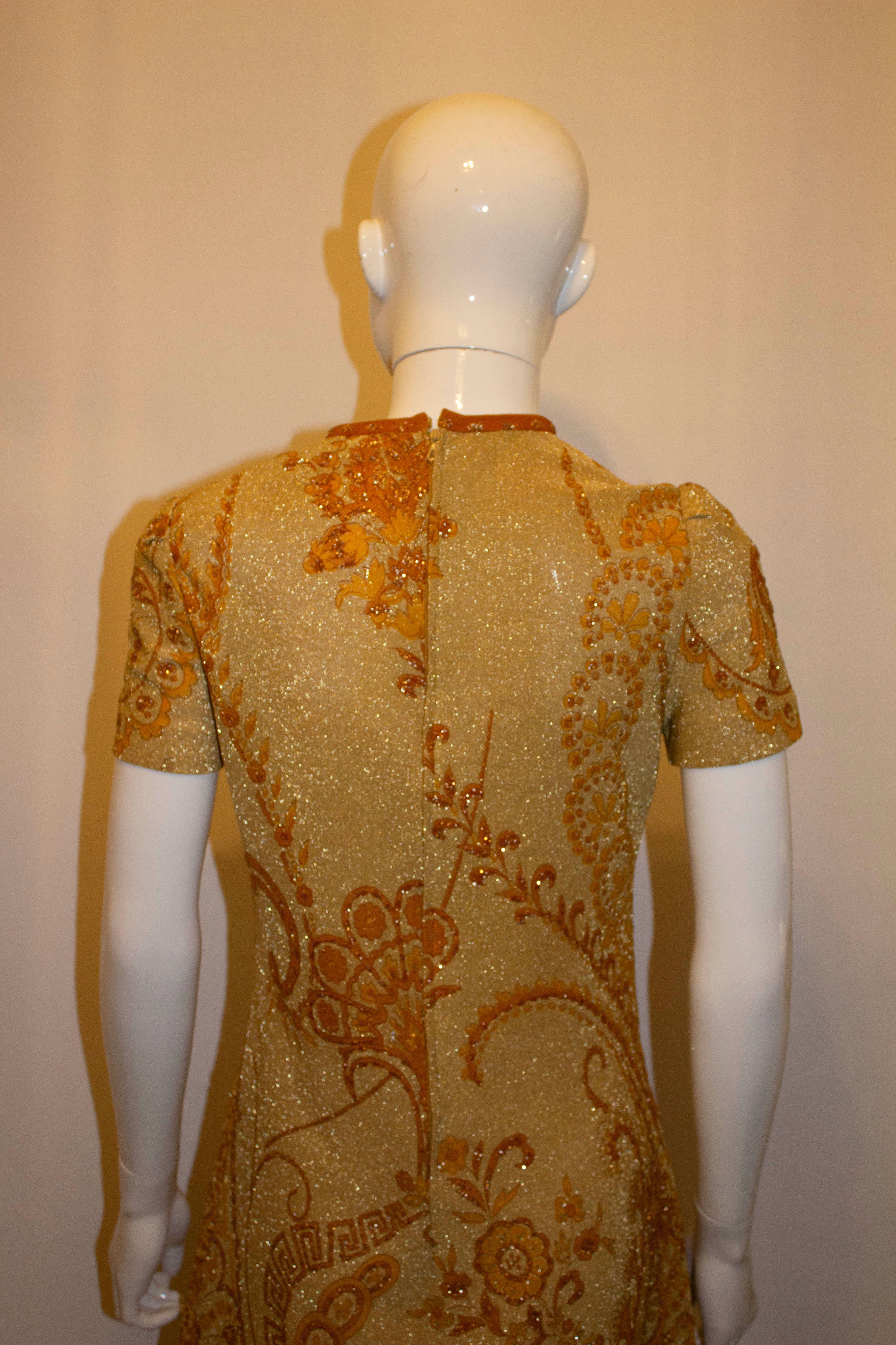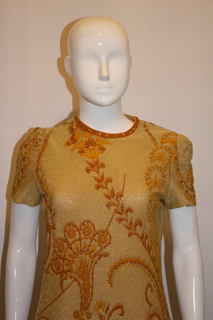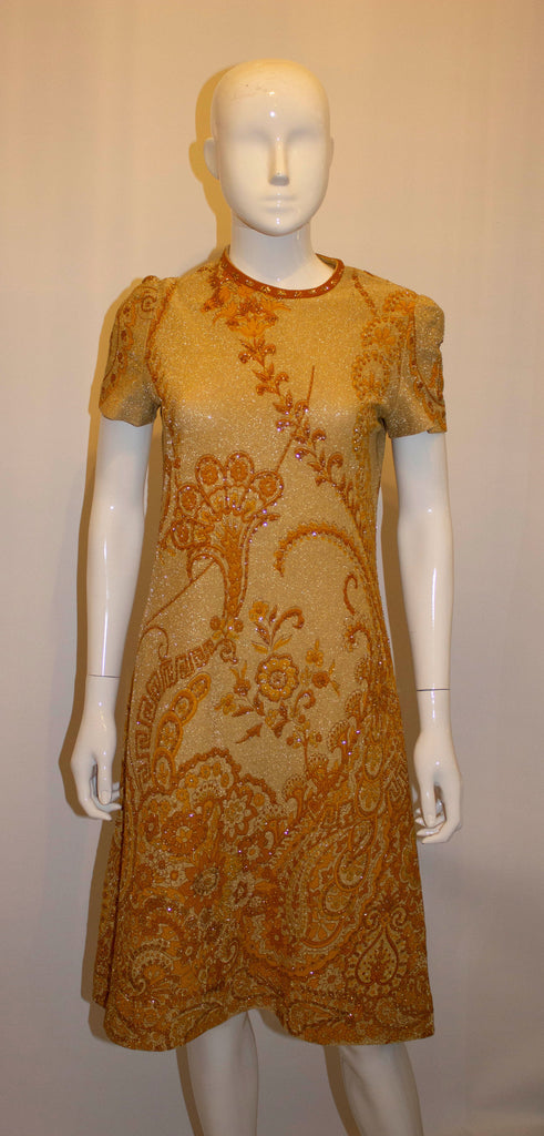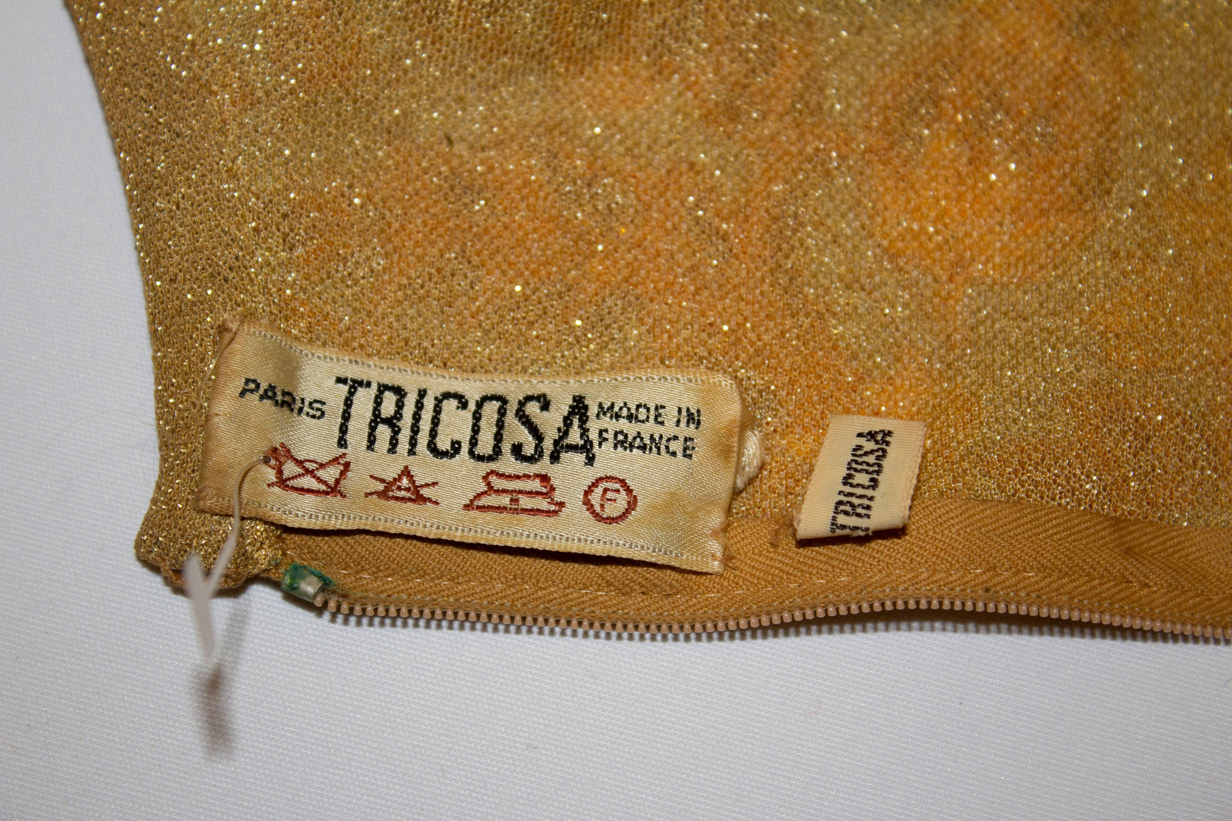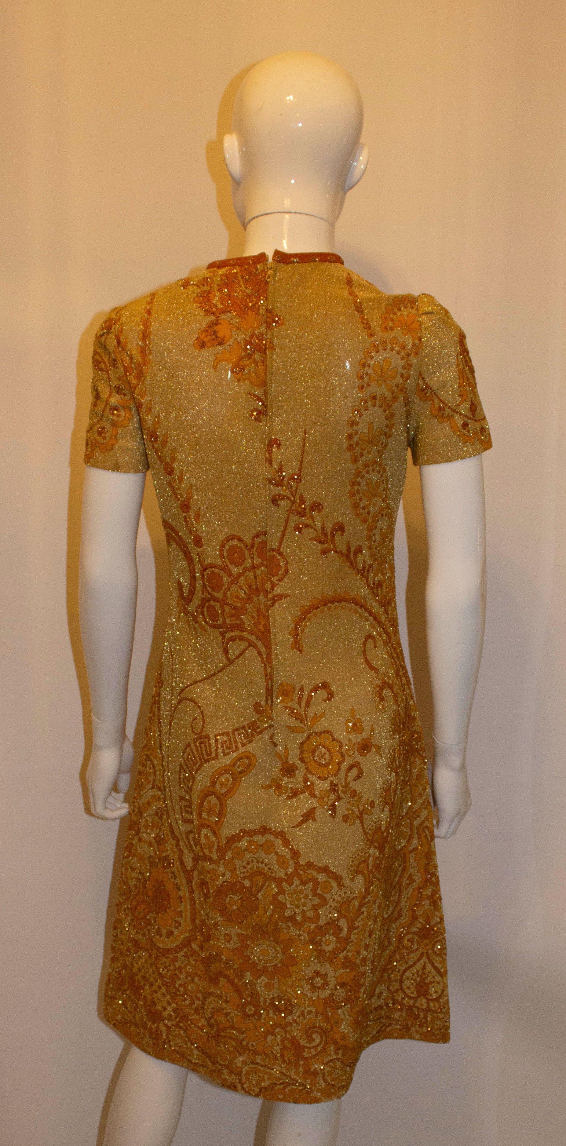 A chic cocktail dress by Tricosa. The dress is in a soft gold colour with brunt orange print. It has a round neckline, central back zip and is unlined.