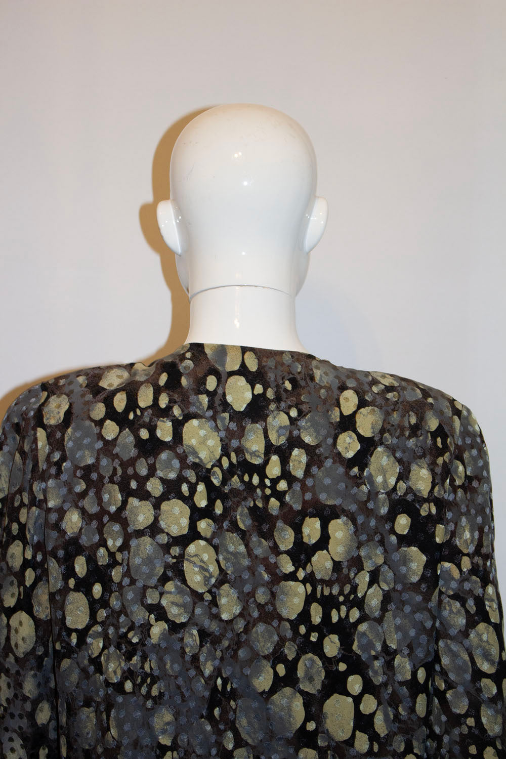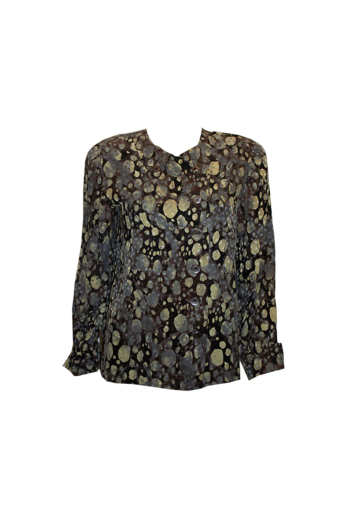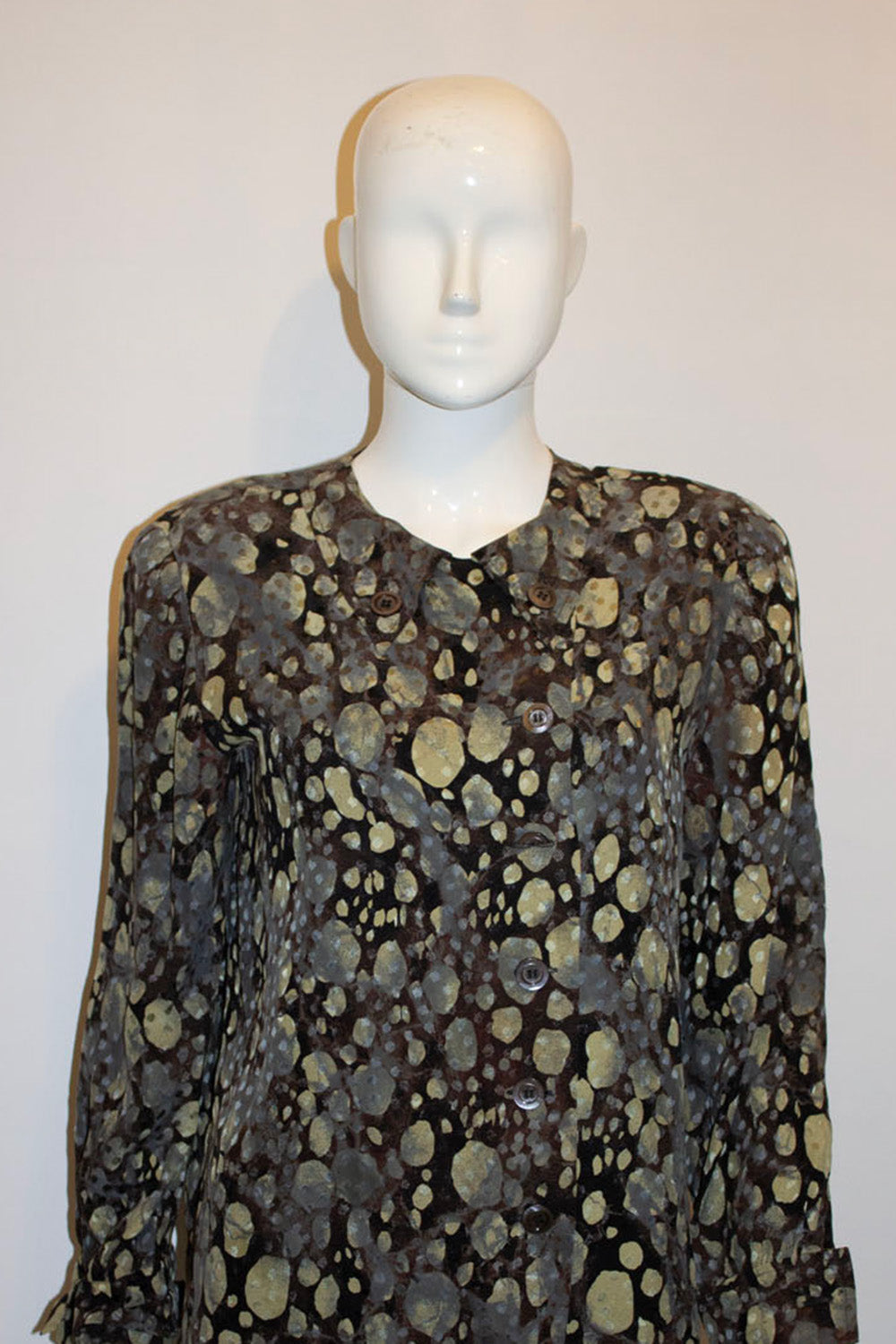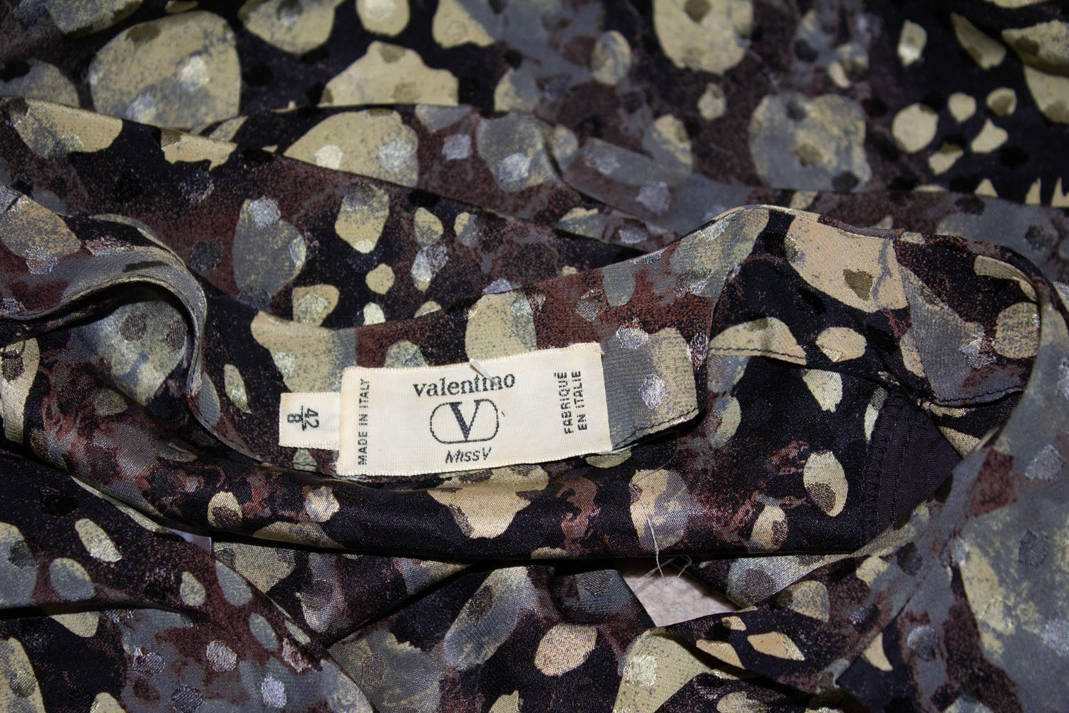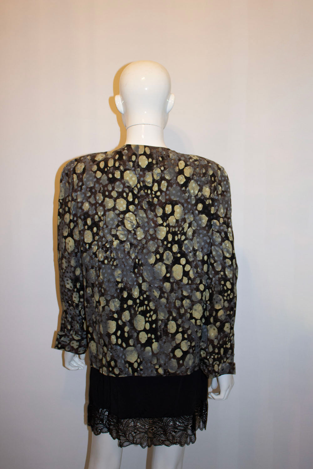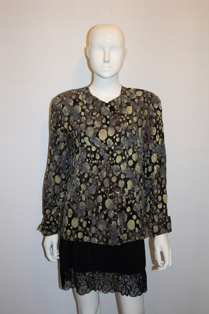 A stunning vintage silk blouse by Valentino, Miss V line. The blouse is in a great mix of colours, blue , grey and yellow, and has an interesting collar design. It is in a super soft silk with the original shoulder pads ( could  be removed ) , and has shirt cuffs. Size 42/8.